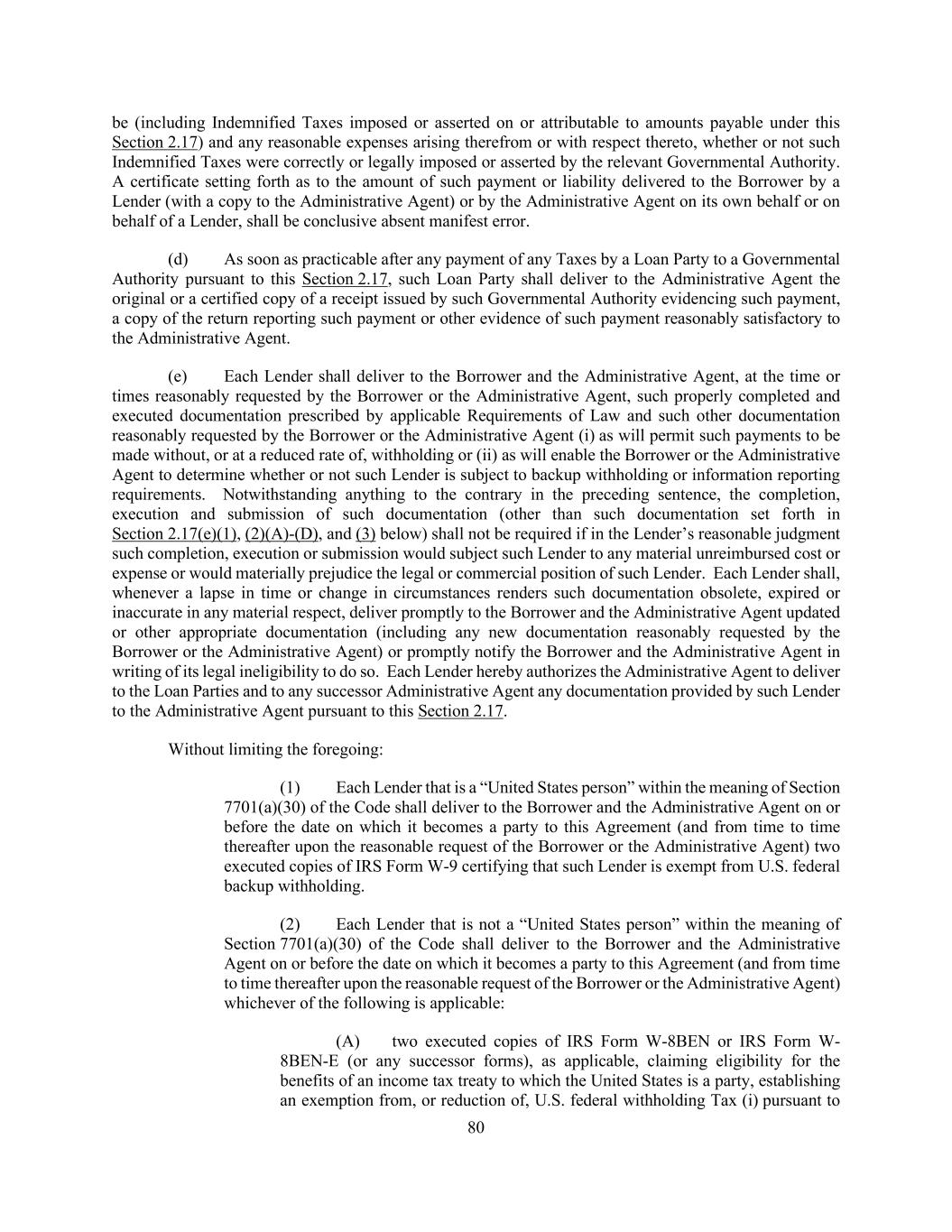 80 be (including Indemnified Taxes imposed or asserted on or attributable to amounts payable under this Section 2.17) and any reasonable expenses arising therefrom or with respect thereto, whether or not such Indemnified Taxes were correctly or legally imposed or asserted by the relevant Governmental Authority. A certificate setting forth as to the amount of such payment or liability delivered to the Borrower by a Lender (with a copy to the Administrative Agent) or by the Administrative Agent on its own behalf or on behalf of a Lender, shall be conclusive absent manifest error. (d) As soon as practicable after any payment of any Taxes by a Loan Party to a Governmental Authority pursuant to this Section 2.17, such Loan Party shall deliver to the Administrative Agent the original or a certified copy of a receipt issued by such Governmental Authority evidencing such payment, a copy of the return reporting such payment or other evidence of such payment reasonably satisfactory to the Administrative Agent. (e) Each Lender shall deliver to the Borrower and the Administrative Agent, at the time or times reasonably requested by the Borrower or the Administrative Agent, such properly completed and executed documentation prescribed by applicable Requirements of Law and such other documentation reasonably requested by the Borrower or the Administrative Agent (i) as will permit such payments to be made without, or at a reduced rate of, withholding or (ii) as will enable the Borrower or the Administrative Agent to determine whether or not such Lender is subject to backup withholding or information reporting requirements. Notwithstanding anything to the contrary in the preceding sentence, the completion, execution and submission of such documentation (other than such documentation set forth in Section 2.17(e)(1), (2)(A)-(D), and (3) below) shall not be required if in the Lender’s reasonable judgment such completion, execution or submission would subject such Lender to any material unreimbursed cost or expense or would materially prejudice the legal or commercial position of such Lender. Each Lender shall, whenever a lapse in time or change in circumstances renders such documentation obsolete, expired or inaccurate in any material respect, deliver promptly to the Borrower and the Administrative Agent updated or other appropriate documentation (including any new documentation reasonably requested by the Borrower or the Administrative Agent) or promptly notify the Borrower and the Administrative Agent in writing of its legal ineligibility to do so. Each Lender hereby authorizes the Administrative Agent to deliver to the Loan Parties and to any successor Administrative Agent any documentation provided by such Lender to the Administrative Agent pursuant to this Section 2.17. Without limiting the foregoing: (1) Each Lender that is a “United States person” within the meaning of Section 7701(a)(30) of the Code shall deliver to the Borrower and the Administrative Agent on or before the date on which it becomes a party to this Agreement (and from time to time thereafter upon the reasonable request of the Borrower or the Administrative Agent) two executed copies of IRS Form W-9 certifying that such Lender is exempt from U.S. federal backup withholding. (2) Each Lender that is not a “United States person” within the meaning of Section 7701(a)(30) of the Code shall deliver to the Borrower and the Administrative Agent on or before the date on which it becomes a party to this Agreement (and from time to time thereafter upon the reasonable request of the Borrower or the Administrative Agent) whichever of the following is applicable: (A) two executed copies of IRS Form W-8BEN or IRS Form W- 8BEN-E (or any successor forms), as applicable, claiming eligibility for the benefits of an income tax treaty to which the United States is a party, establishing an exemption from, or reduction of, U.S. federal withholding Tax (i) pursuant to