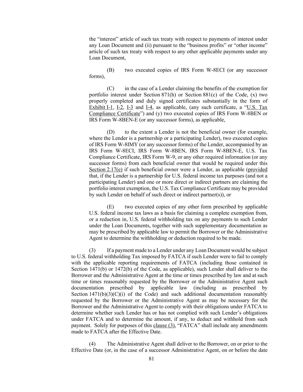 81 the “interest” article of such tax treaty with respect to payments of interest under any Loan Document and (ii) pursuant to the “business profits” or “other income” article of such tax treaty with respect to any other applicable payments under any Loan Document, (B) two executed copies of IRS Form W-8ECI (or any successor forms), (C) in the case of a Lender claiming the benefits of the exemption for portfolio interest under Section 871(h) or Section 881(c) of the Code, (x) two properly completed and duly signed certificates substantially in the form of Exhibit I-1, I-2, I-3 and I-4, as applicable, (any such certificate, a “U.S. Tax Compliance Certificate”) and (y) two executed copies of IRS Form W-8BEN or IRS Form W-8BEN-E (or any successor forms), as applicable, (D) to the extent a Lender is not the beneficial owner (for example, where the Lender is a partnership or a participating Lender), two executed copies of IRS Form W-8IMY (or any successor forms) of the Lender, accompanied by an IRS Form W-8ECI, IRS Form W-8BEN, IRS Form W-8BEN-E, U.S. Tax Compliance Certificate, IRS Form W-9, or any other required information (or any successor forms) from each beneficial owner that would be required under this Section 2.17(e) if such beneficial owner were a Lender, as applicable (provided that, if the Lender is a partnership for U.S. federal income tax purposes (and not a participating Lender) and one or more direct or indirect partners are claiming the portfolio interest exemption, the U.S. Tax Compliance Certificate may be provided by such Lender on behalf of such direct or indirect partner(s)), or (E) two executed copies of any other form prescribed by applicable U.S. federal income tax laws as a basis for claiming a complete exemption from, or a reduction in, U.S. federal withholding tax on any payments to such Lender under the Loan Documents, together with such supplementary documentation as may be prescribed by applicable law to permit the Borrower or the Administrative Agent to determine the withholding or deduction required to be made. (3) If a payment made to a Lender under any Loan Document would be subject to U.S. federal withholding Tax imposed by FATCA if such Lender were to fail to comply with the applicable reporting requirements of FATCA (including those contained in Section 1471(b) or 1472(b) of the Code, as applicable), such Lender shall deliver to the Borrower and the Administrative Agent at the time or times prescribed by law and at such time or times reasonably requested by the Borrower or the Administrative Agent such documentation prescribed by applicable law (including as prescribed by Section 1471(b)(3)(C)(i) of the Code) and such additional documentation reasonably requested by the Borrower or the Administrative Agent as may be necessary for the Borrower and the Administrative Agent to comply with their obligations under FATCA to determine whether such Lender has or has not complied with such Lender’s obligations under FATCA and to determine the amount, if any, to deduct and withhold from such payment. Solely for purposes of this clause (3), “FATCA” shall include any amendments made to FATCA after the Effective Date. (4) The Administrative Agent shall deliver to the Borrower, on or prior to the Effective Date (or, in the case of a successor Administrative Agent, on or before the date