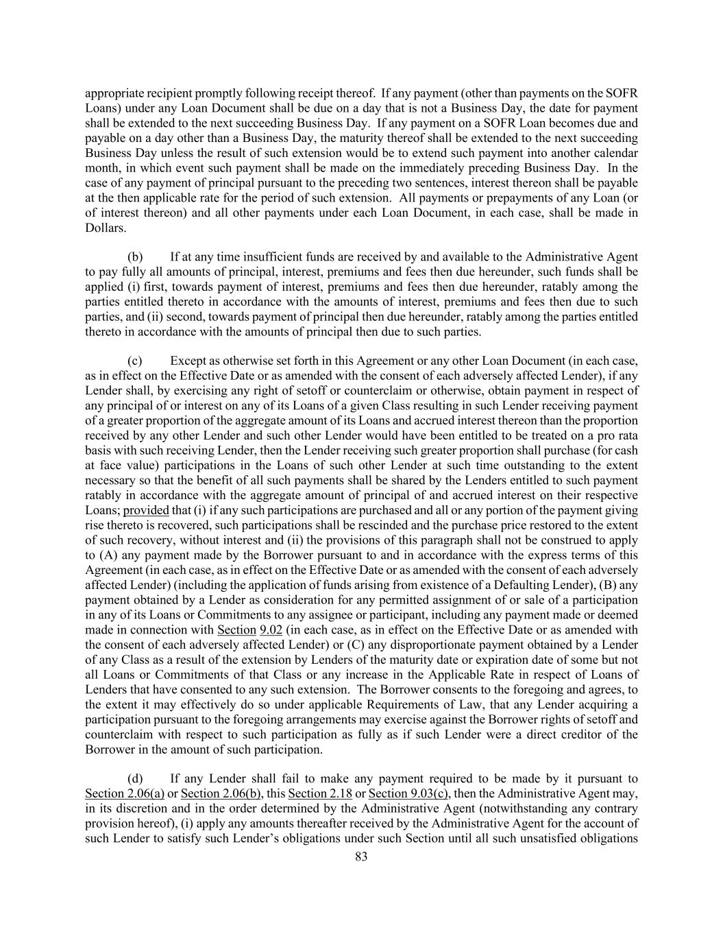 83 appropriate recipient promptly following receipt thereof. If any payment (other than payments on the SOFR Loans) under any Loan Document shall be due on a day that is not a Business Day, the date for payment shall be extended to the next succeeding Business Day. If any payment on a SOFR Loan becomes due and payable on a day other than a Business Day, the maturity thereof shall be extended to the next succeeding Business Day unless the result of such extension would be to extend such payment into another calendar month, in which event such payment shall be made on the immediately preceding Business Day. In the case of any payment of principal pursuant to the preceding two sentences, interest thereon shall be payable at the then applicable rate for the period of such extension. All payments or prepayments of any Loan (or of interest thereon) and all other payments under each Loan Document, in each case, shall be made in Dollars. (b) If at any time insufficient funds are received by and available to the Administrative Agent to pay fully all amounts of principal, interest, premiums and fees then due hereunder, such funds shall be applied (i) first, towards payment of interest, premiums and fees then due hereunder, ratably among the parties entitled thereto in accordance with the amounts of interest, premiums and fees then due to such parties, and (ii) second, towards payment of principal then due hereunder, ratably among the parties entitled thereto in accordance with the amounts of principal then due to such parties. (c) Except as otherwise set forth in this Agreement or any other Loan Document (in each case, as in effect on the Effective Date or as amended with the consent of each adversely affected Lender), if any Lender shall, by exercising any right of setoff or counterclaim or otherwise, obtain payment in respect of any principal of or interest on any of its Loans of a given Class resulting in such Lender receiving payment of a greater proportion of the aggregate amount of its Loans and accrued interest thereon than the proportion received by any other Lender and such other Lender would have been entitled to be treated on a pro rata basis with such receiving Lender, then the Lender receiving such greater proportion shall purchase (for cash at face value) participations in the Loans of such other Lender at such time outstanding to the extent necessary so that the benefit of all such payments shall be shared by the Lenders entitled to such payment ratably in accordance with the aggregate amount of principal of and accrued interest on their respective Loans; provided that (i) if any such participations are purchased and all or any portion of the payment giving rise thereto is recovered, such participations shall be rescinded and the purchase price restored to the extent of such recovery, without interest and (ii) the provisions of this paragraph shall not be construed to apply to (A) any payment made by the Borrower pursuant to and in accordance with the express terms of this Agreement (in each case, as in effect on the Effective Date or as amended with the consent of each adversely affected Lender) (including the application of funds arising from existence of a Defaulting Lender), (B) any payment obtained by a Lender as consideration for any permitted assignment of or sale of a participation in any of its Loans or Commitments to any assignee or participant, including any payment made or deemed made in connection with Section 9.02 (in each case, as in effect on the Effective Date or as amended with the consent of each adversely affected Lender) or (C) any disproportionate payment obtained by a Lender of any Class as a result of the extension by Lenders of the maturity date or expiration date of some but not all Loans or Commitments of that Class or any increase in the Applicable Rate in respect of Loans of Lenders that have consented to any such extension. The Borrower consents to the foregoing and agrees, to the extent it may effectively do so under applicable Requirements of Law, that any Lender acquiring a participation pursuant to the foregoing arrangements may exercise against the Borrower rights of setoff and counterclaim with respect to such participation as fully as if such Lender were a direct creditor of the Borrower in the amount of such participation. (d) If any Lender shall fail to make any payment required to be made by it pursuant to Section 2.06(a) or Section 2.06(b), this Section 2.18 or Section 9.03(c), then the Administrative Agent may, in its discretion and in the order determined by the Administrative Agent (notwithstanding any contrary provision hereof), (i) apply any amounts thereafter received by the Administrative Agent for the account of such Lender to satisfy such Lender’s obligations under such Section until all such unsatisfied obligations
