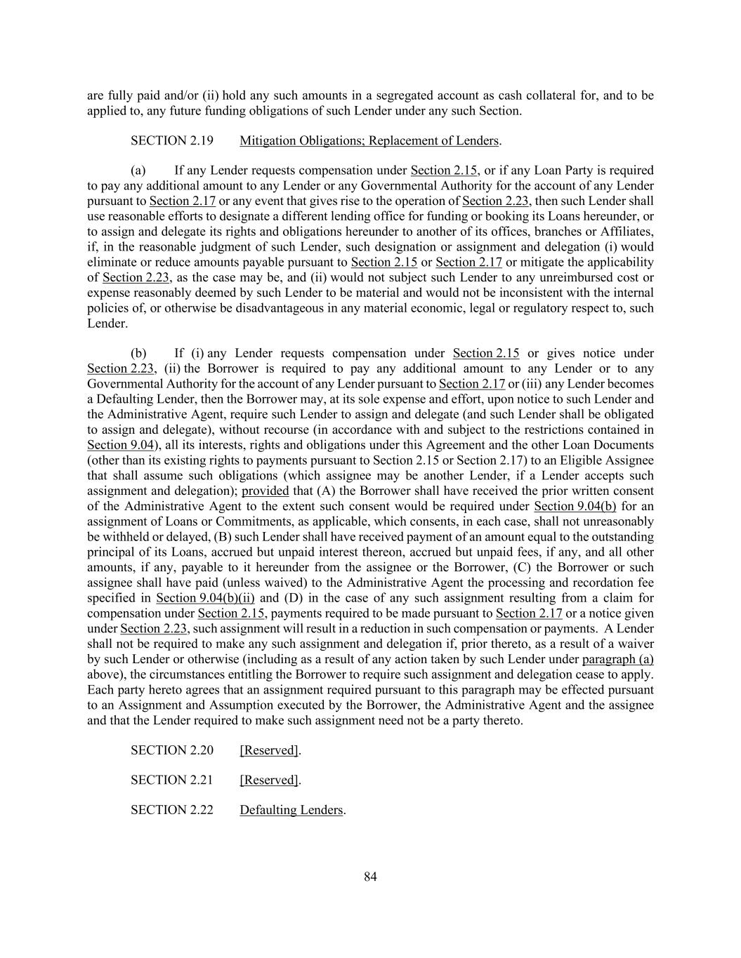 84 are fully paid and/or (ii) hold any such amounts in a segregated account as cash collateral for, and to be applied to, any future funding obligations of such Lender under any such Section. SECTION 2.19 Mitigation Obligations; Replacement of Lenders. (a) If any Lender requests compensation under Section 2.15, or if any Loan Party is required to pay any additional amount to any Lender or any Governmental Authority for the account of any Lender pursuant to Section 2.17 or any event that gives rise to the operation of Section 2.23, then such Lender shall use reasonable efforts to designate a different lending office for funding or booking its Loans hereunder, or to assign and delegate its rights and obligations hereunder to another of its offices, branches or Affiliates, if, in the reasonable judgment of such Lender, such designation or assignment and delegation (i) would eliminate or reduce amounts payable pursuant to Section 2.15 or Section 2.17 or mitigate the applicability of Section 2.23, as the case may be, and (ii) would not subject such Lender to any unreimbursed cost or expense reasonably deemed by such Lender to be material and would not be inconsistent with the internal policies of, or otherwise be disadvantageous in any material economic, legal or regulatory respect to, such Lender. (b) If (i) any Lender requests compensation under Section 2.15 or gives notice under Section 2.23, (ii) the Borrower is required to pay any additional amount to any Lender or to any Governmental Authority for the account of any Lender pursuant to Section 2.17 or (iii) any Lender becomes a Defaulting Lender, then the Borrower may, at its sole expense and effort, upon notice to such Lender and the Administrative Agent, require such Lender to assign and delegate (and such Lender shall be obligated to assign and delegate), without recourse (in accordance with and subject to the restrictions contained in Section 9.04), all its interests, rights and obligations under this Agreement and the other Loan Documents (other than its existing rights to payments pursuant to Section 2.15 or Section 2.17) to an Eligible Assignee that shall assume such obligations (which assignee may be another Lender, if a Lender accepts such assignment and delegation); provided that (A) the Borrower shall have received the prior written consent of the Administrative Agent to the extent such consent would be required under Section 9.04(b) for an assignment of Loans or Commitments, as applicable, which consents, in each case, shall not unreasonably be withheld or delayed, (B) such Lender shall have received payment of an amount equal to the outstanding principal of its Loans, accrued but unpaid interest thereon, accrued but unpaid fees, if any, and all other amounts, if any, payable to it hereunder from the assignee or the Borrower, (C) the Borrower or such assignee shall have paid (unless waived) to the Administrative Agent the processing and recordation fee specified in Section 9.04(b)(ii) and (D) in the case of any such assignment resulting from a claim for compensation under Section 2.15, payments required to be made pursuant to Section 2.17 or a notice given under Section 2.23, such assignment will result in a reduction in such compensation or payments. A Lender shall not be required to make any such assignment and delegation if, prior thereto, as a result of a waiver by such Lender or otherwise (including as a result of any action taken by such Lender under paragraph (a) above), the circumstances entitling the Borrower to require such assignment and delegation cease to apply. Each party hereto agrees that an assignment required pursuant to this paragraph may be effected pursuant to an Assignment and Assumption executed by the Borrower, the Administrative Agent and the assignee and that the Lender required to make such assignment need not be a party thereto. SECTION 2.20 [Reserved]. SECTION 2.21 [Reserved]. SECTION 2.22 Defaulting Lenders.
