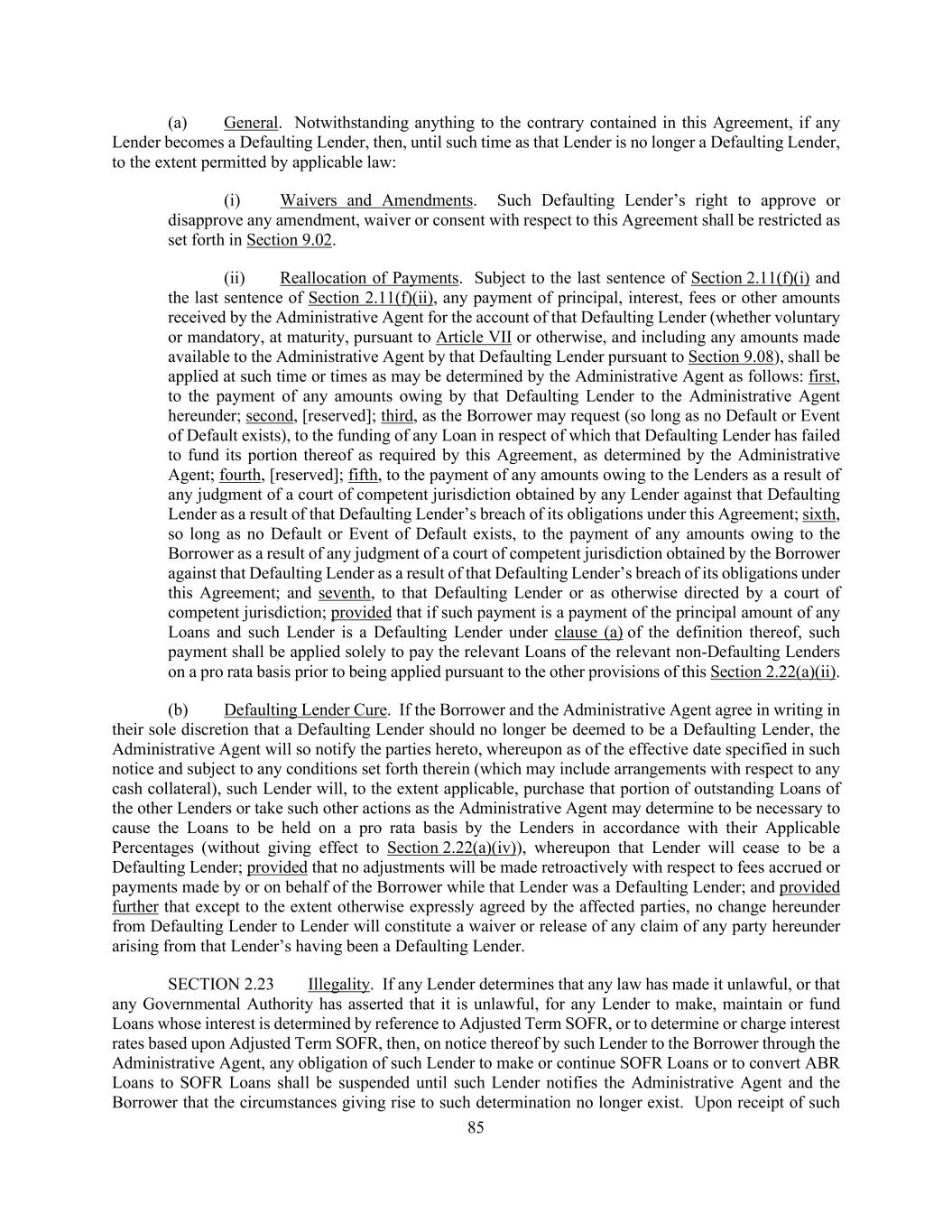 85 (a) General. Notwithstanding anything to the contrary contained in this Agreement, if any Lender becomes a Defaulting Lender, then, until such time as that Lender is no longer a Defaulting Lender, to the extent permitted by applicable law: (i) Waivers and Amendments. Such Defaulting Lender’s right to approve or disapprove any amendment, waiver or consent with respect to this Agreement shall be restricted as set forth in Section 9.02. (ii) Reallocation of Payments. Subject to the last sentence of Section 2.11(f)(i) and the last sentence of Section 2.11(f)(ii), any payment of principal, interest, fees or other amounts received by the Administrative Agent for the account of that Defaulting Lender (whether voluntary or mandatory, at maturity, pursuant to Article VII or otherwise, and including any amounts made available to the Administrative Agent by that Defaulting Lender pursuant to Section 9.08), shall be applied at such time or times as may be determined by the Administrative Agent as follows: first, to the payment of any amounts owing by that Defaulting Lender to the Administrative Agent hereunder; second, [reserved]; third, as the Borrower may request (so long as no Default or Event of Default exists), to the funding of any Loan in respect of which that Defaulting Lender has failed to fund its portion thereof as required by this Agreement, as determined by the Administrative Agent; fourth, [reserved]; fifth, to the payment of any amounts owing to the Lenders as a result of any judgment of a court of competent jurisdiction obtained by any Lender against that Defaulting Lender as a result of that Defaulting Lender’s breach of its obligations under this Agreement; sixth, so long as no Default or Event of Default exists, to the payment of any amounts owing to the Borrower as a result of any judgment of a court of competent jurisdiction obtained by the Borrower against that Defaulting Lender as a result of that Defaulting Lender’s breach of its obligations under this Agreement; and seventh, to that Defaulting Lender or as otherwise directed by a court of competent jurisdiction; provided that if such payment is a payment of the principal amount of any Loans and such Lender is a Defaulting Lender under clause (a) of the definition thereof, such payment shall be applied solely to pay the relevant Loans of the relevant non-Defaulting Lenders on a pro rata basis prior to being applied pursuant to the other provisions of this Section 2.22(a)(ii). (b) Defaulting Lender Cure. If the Borrower and the Administrative Agent agree in writing in their sole discretion that a Defaulting Lender should no longer be deemed to be a Defaulting Lender, the Administrative Agent will so notify the parties hereto, whereupon as of the effective date specified in such notice and subject to any conditions set forth therein (which may include arrangements with respect to any cash collateral), such Lender will, to the extent applicable, purchase that portion of outstanding Loans of the other Lenders or take such other actions as the Administrative Agent may determine to be necessary to cause the Loans to be held on a pro rata basis by the Lenders in accordance with their Applicable Percentages (without giving effect to Section 2.22(a)(iv)), whereupon that Lender will cease to be a Defaulting Lender; provided that no adjustments will be made retroactively with respect to fees accrued or payments made by or on behalf of the Borrower while that Lender was a Defaulting Lender; and provided further that except to the extent otherwise expressly agreed by the affected parties, no change hereunder from Defaulting Lender to Lender will constitute a waiver or release of any claim of any party hereunder arising from that Lender’s having been a Defaulting Lender. SECTION 2.23 Illegality. If any Lender determines that any law has made it unlawful, or that any Governmental Authority has asserted that it is unlawful, for any Lender to make, maintain or fund Loans whose interest is determined by reference to Adjusted Term SOFR, or to determine or charge interest rates based upon Adjusted Term SOFR, then, on notice thereof by such Lender to the Borrower through the Administrative Agent, any obligation of such Lender to make or continue SOFR Loans or to convert ABR Loans to SOFR Loans shall be suspended until such Lender notifies the Administrative Agent and the Borrower that the circumstances giving rise to such determination no longer exist. Upon receipt of such