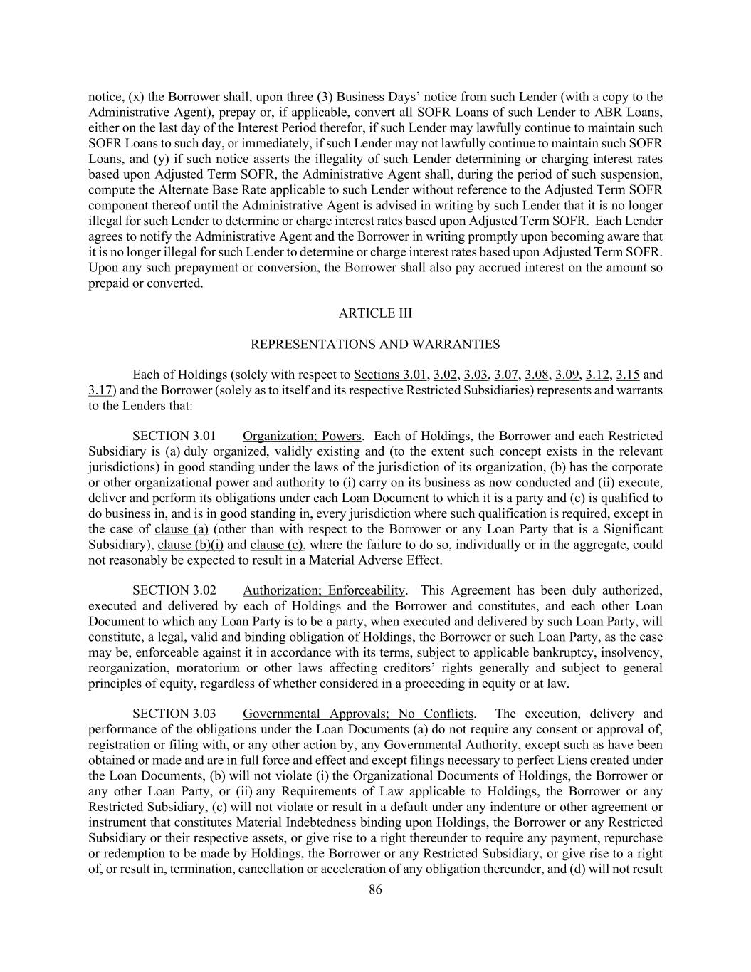 86 notice, (x) the Borrower shall, upon three (3) Business Days’ notice from such Lender (with a copy to the Administrative Agent), prepay or, if applicable, convert all SOFR Loans of such Lender to ABR Loans, either on the last day of the Interest Period therefor, if such Lender may lawfully continue to maintain such SOFR Loans to such day, or immediately, if such Lender may not lawfully continue to maintain such SOFR Loans, and (y) if such notice asserts the illegality of such Lender determining or charging interest rates based upon Adjusted Term SOFR, the Administrative Agent shall, during the period of such suspension, compute the Alternate Base Rate applicable to such Lender without reference to the Adjusted Term SOFR component thereof until the Administrative Agent is advised in writing by such Lender that it is no longer illegal for such Lender to determine or charge interest rates based upon Adjusted Term SOFR. Each Lender agrees to notify the Administrative Agent and the Borrower in writing promptly upon becoming aware that it is no longer illegal for such Lender to determine or charge interest rates based upon Adjusted Term SOFR. Upon any such prepayment or conversion, the Borrower shall also pay accrued interest on the amount so prepaid or converted. ARTICLE III REPRESENTATIONS AND WARRANTIES Each of Holdings (solely with respect to Sections 3.01, 3.02, 3.03, 3.07, 3.08, 3.09, 3.12, 3.15 and 3.17) and the Borrower (solely as to itself and its respective Restricted Subsidiaries) represents and warrants to the Lenders that: SECTION 3.01 Organization; Powers. Each of Holdings, the Borrower and each Restricted Subsidiary is (a) duly organized, validly existing and (to the extent such concept exists in the relevant jurisdictions) in good standing under the laws of the jurisdiction of its organization, (b) has the corporate or other organizational power and authority to (i) carry on its business as now conducted and (ii) execute, deliver and perform its obligations under each Loan Document to which it is a party and (c) is qualified to do business in, and is in good standing in, every jurisdiction where such qualification is required, except in the case of clause (a) (other than with respect to the Borrower or any Loan Party that is a Significant Subsidiary), clause (b)(i) and clause (c), where the failure to do so, individually or in the aggregate, could not reasonably be expected to result in a Material Adverse Effect. SECTION 3.02 Authorization; Enforceability. This Agreement has been duly authorized, executed and delivered by each of Holdings and the Borrower and constitutes, and each other Loan Document to which any Loan Party is to be a party, when executed and delivered by such Loan Party, will constitute, a legal, valid and binding obligation of Holdings, the Borrower or such Loan Party, as the case may be, enforceable against it in accordance with its terms, subject to applicable bankruptcy, insolvency, reorganization, moratorium or other laws affecting creditors’ rights generally and subject to general principles of equity, regardless of whether considered in a proceeding in equity or at law. SECTION 3.03 Governmental Approvals; No Conflicts. The execution, delivery and performance of the obligations under the Loan Documents (a) do not require any consent or approval of, registration or filing with, or any other action by, any Governmental Authority, except such as have been obtained or made and are in full force and effect and except filings necessary to perfect Liens created under the Loan Documents, (b) will not violate (i) the Organizational Documents of Holdings, the Borrower or any other Loan Party, or (ii) any Requirements of Law applicable to Holdings, the Borrower or any Restricted Subsidiary, (c) will not violate or result in a default under any indenture or other agreement or instrument that constitutes Material Indebtedness binding upon Holdings, the Borrower or any Restricted Subsidiary or their respective assets, or give rise to a right thereunder to require any payment, repurchase or redemption to be made by Holdings, the Borrower or any Restricted Subsidiary, or give rise to a right of, or result in, termination, cancellation or acceleration of any obligation thereunder, and (d) will not result