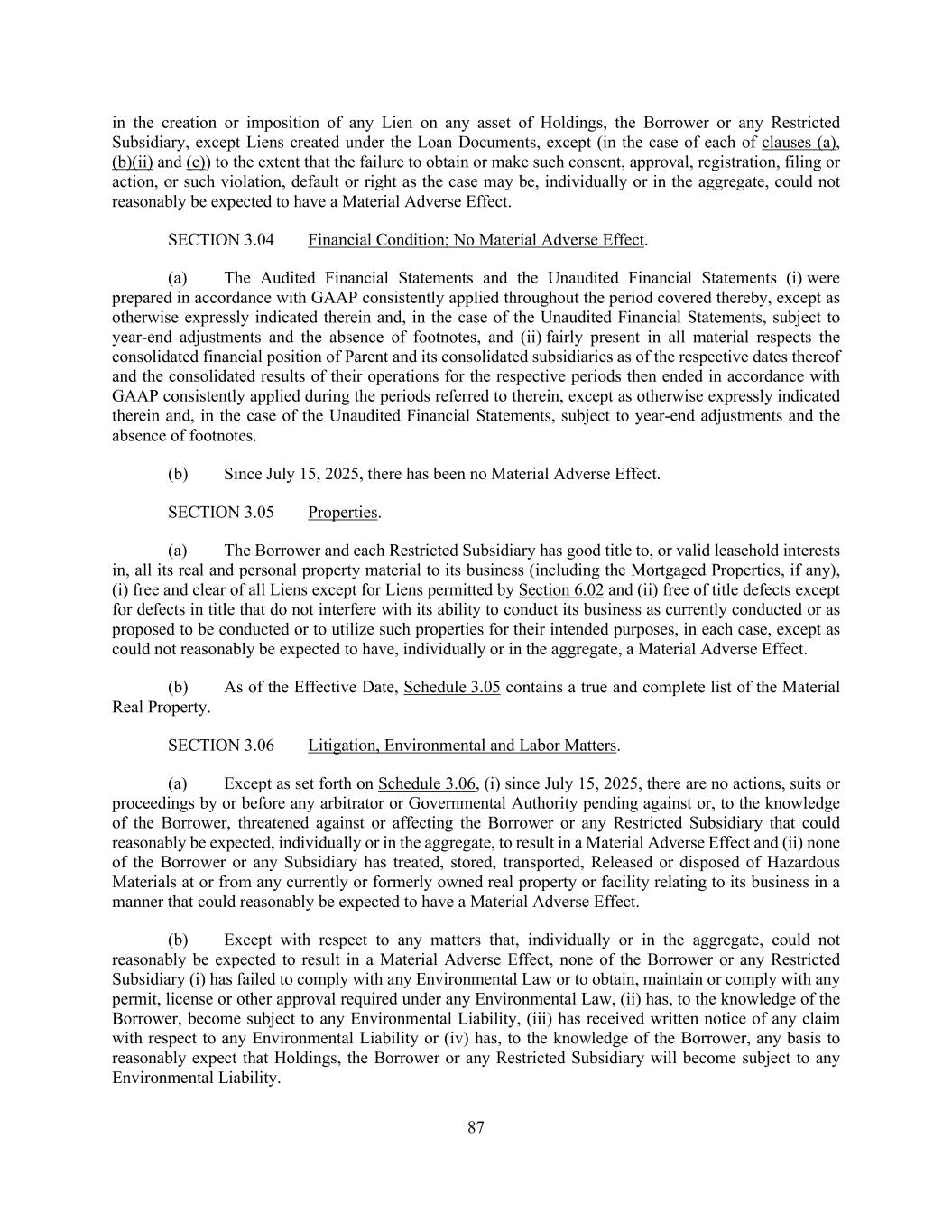 87 in the creation or imposition of any Lien on any asset of Holdings, the Borrower or any Restricted Subsidiary, except Liens created under the Loan Documents, except (in the case of each of clauses (a), (b)(ii) and (c)) to the extent that the failure to obtain or make such consent, approval, registration, filing or action, or such violation, default or right as the case may be, individually or in the aggregate, could not reasonably be expected to have a Material Adverse Effect. SECTION 3.04 Financial Condition; No Material Adverse Effect. (a) The Audited Financial Statements and the Unaudited Financial Statements (i) were prepared in accordance with GAAP consistently applied throughout the period covered thereby, except as otherwise expressly indicated therein and, in the case of the Unaudited Financial Statements, subject to year-end adjustments and the absence of footnotes, and (ii) fairly present in all material respects the consolidated financial position of Parent and its consolidated subsidiaries as of the respective dates thereof and the consolidated results of their operations for the respective periods then ended in accordance with GAAP consistently applied during the periods referred to therein, except as otherwise expressly indicated therein and, in the case of the Unaudited Financial Statements, subject to year-end adjustments and the absence of footnotes. (b) Since July 15, 2025, there has been no Material Adverse Effect. SECTION 3.05 Properties. (a) The Borrower and each Restricted Subsidiary has good title to, or valid leasehold interests in, all its real and personal property material to its business (including the Mortgaged Properties, if any), (i) free and clear of all Liens except for Liens permitted by Section 6.02 and (ii) free of title defects except for defects in title that do not interfere with its ability to conduct its business as currently conducted or as proposed to be conducted or to utilize such properties for their intended purposes, in each case, except as could not reasonably be expected to have, individually or in the aggregate, a Material Adverse Effect. (b) As of the Effective Date, Schedule 3.05 contains a true and complete list of the Material Real Property. SECTION 3.06 Litigation, Environmental and Labor Matters. (a) Except as set forth on Schedule 3.06, (i) since July 15, 2025, there are no actions, suits or proceedings by or before any arbitrator or Governmental Authority pending against or, to the knowledge of the Borrower, threatened against or affecting the Borrower or any Restricted Subsidiary that could reasonably be expected, individually or in the aggregate, to result in a Material Adverse Effect and (ii) none of the Borrower or any Subsidiary has treated, stored, transported, Released or disposed of Hazardous Materials at or from any currently or formerly owned real property or facility relating to its business in a manner that could reasonably be expected to have a Material Adverse Effect. (b) Except with respect to any matters that, individually or in the aggregate, could not reasonably be expected to result in a Material Adverse Effect, none of the Borrower or any Restricted Subsidiary (i) has failed to comply with any Environmental Law or to obtain, maintain or comply with any permit, license or other approval required under any Environmental Law, (ii) has, to the knowledge of the Borrower, become subject to any Environmental Liability, (iii) has received written notice of any claim with respect to any Environmental Liability or (iv) has, to the knowledge of the Borrower, any basis to reasonably expect that Holdings, the Borrower or any Restricted Subsidiary will become subject to any Environmental Liability.