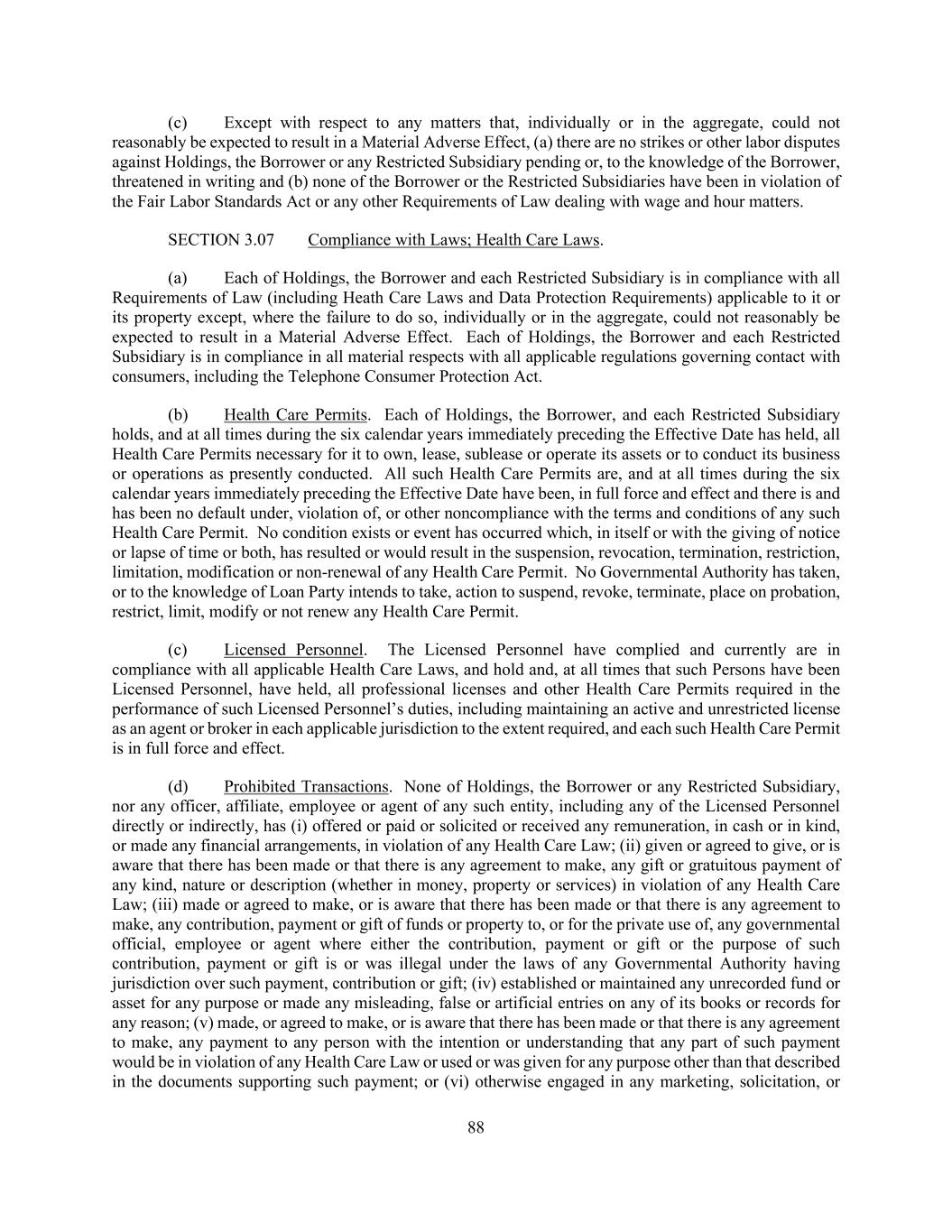 88 (c) Except with respect to any matters that, individually or in the aggregate, could not reasonably be expected to result in a Material Adverse Effect, (a) there are no strikes or other labor disputes against Holdings, the Borrower or any Restricted Subsidiary pending or, to the knowledge of the Borrower, threatened in writing and (b) none of the Borrower or the Restricted Subsidiaries have been in violation of the Fair Labor Standards Act or any other Requirements of Law dealing with wage and hour matters. SECTION 3.07 Compliance with Laws; Health Care Laws. (a) Each of Holdings, the Borrower and each Restricted Subsidiary is in compliance with all Requirements of Law (including Heath Care Laws and Data Protection Requirements) applicable to it or its property except, where the failure to do so, individually or in the aggregate, could not reasonably be expected to result in a Material Adverse Effect. Each of Holdings, the Borrower and each Restricted Subsidiary is in compliance in all material respects with all applicable regulations governing contact with consumers, including the Telephone Consumer Protection Act. (b) Health Care Permits. Each of Holdings, the Borrower, and each Restricted Subsidiary holds, and at all times during the six calendar years immediately preceding the Effective Date has held, all Health Care Permits necessary for it to own, lease, sublease or operate its assets or to conduct its business or operations as presently conducted. All such Health Care Permits are, and at all times during the six calendar years immediately preceding the Effective Date have been, in full force and effect and there is and has been no default under, violation of, or other noncompliance with the terms and conditions of any such Health Care Permit. No condition exists or event has occurred which, in itself or with the giving of notice or lapse of time or both, has resulted or would result in the suspension, revocation, termination, restriction, limitation, modification or non-renewal of any Health Care Permit. No Governmental Authority has taken, or to the knowledge of Loan Party intends to take, action to suspend, revoke, terminate, place on probation, restrict, limit, modify or not renew any Health Care Permit. (c) Licensed Personnel. The Licensed Personnel have complied and currently are in compliance with all applicable Health Care Laws, and hold and, at all times that such Persons have been Licensed Personnel, have held, all professional licenses and other Health Care Permits required in the performance of such Licensed Personnel’s duties, including maintaining an active and unrestricted license as an agent or broker in each applicable jurisdiction to the extent required, and each such Health Care Permit is in full force and effect. (d) Prohibited Transactions. None of Holdings, the Borrower or any Restricted Subsidiary, nor any officer, affiliate, employee or agent of any such entity, including any of the Licensed Personnel directly or indirectly, has (i) offered or paid or solicited or received any remuneration, in cash or in kind, or made any financial arrangements, in violation of any Health Care Law; (ii) given or agreed to give, or is aware that there has been made or that there is any agreement to make, any gift or gratuitous payment of any kind, nature or description (whether in money, property or services) in violation of any Health Care Law; (iii) made or agreed to make, or is aware that there has been made or that there is any agreement to make, any contribution, payment or gift of funds or property to, or for the private use of, any governmental official, employee or agent where either the contribution, payment or gift or the purpose of such contribution, payment or gift is or was illegal under the laws of any Governmental Authority having jurisdiction over such payment, contribution or gift; (iv) established or maintained any unrecorded fund or asset for any purpose or made any misleading, false or artificial entries on any of its books or records for any reason; (v) made, or agreed to make, or is aware that there has been made or that there is any agreement to make, any payment to any person with the intention or understanding that any part of such payment would be in violation of any Health Care Law or used or was given for any purpose other than that described in the documents supporting such payment; or (vi) otherwise engaged in any marketing, solicitation, or