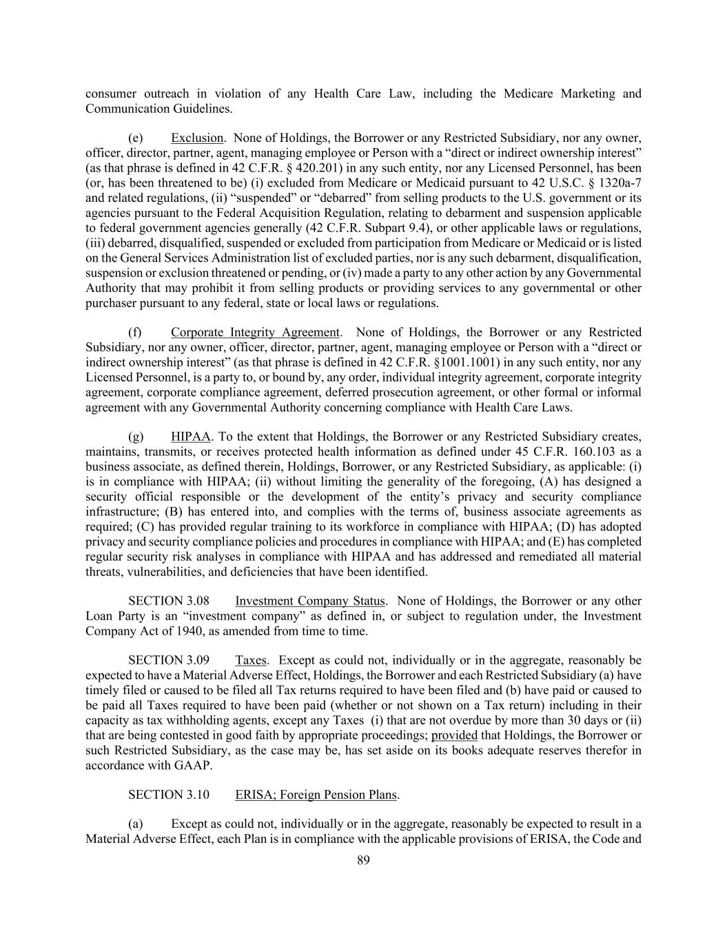 89 consumer outreach in violation of any Health Care Law, including the Medicare Marketing and Communication Guidelines. (e) Exclusion. None of Holdings, the Borrower or any Restricted Subsidiary, nor any owner, officer, director, partner, agent, managing employee or Person with a “direct or indirect ownership interest” (as that phrase is defined in 42 C.F.R. § 420.201) in any such entity, nor any Licensed Personnel, has been (or, has been threatened to be) (i) excluded from Medicare or Medicaid pursuant to 42 U.S.C. § 1320a-7 and related regulations, (ii) “suspended” or “debarred” from selling products to the U.S. government or its agencies pursuant to the Federal Acquisition Regulation, relating to debarment and suspension applicable to federal government agencies generally (42 C.F.R. Subpart 9.4), or other applicable laws or regulations, (iii) debarred, disqualified, suspended or excluded from participation from Medicare or Medicaid or is listed on the General Services Administration list of excluded parties, nor is any such debarment, disqualification, suspension or exclusion threatened or pending, or (iv) made a party to any other action by any Governmental Authority that may prohibit it from selling products or providing services to any governmental or other purchaser pursuant to any federal, state or local laws or regulations. (f) Corporate Integrity Agreement. None of Holdings, the Borrower or any Restricted Subsidiary, nor any owner, officer, director, partner, agent, managing employee or Person with a “direct or indirect ownership interest” (as that phrase is defined in 42 C.F.R. §1001.1001) in any such entity, nor any Licensed Personnel, is a party to, or bound by, any order, individual integrity agreement, corporate integrity agreement, corporate compliance agreement, deferred prosecution agreement, or other formal or informal agreement with any Governmental Authority concerning compliance with Health Care Laws. (g) HIPAA. To the extent that Holdings, the Borrower or any Restricted Subsidiary creates, maintains, transmits, or receives protected health information as defined under 45 C.F.R. 160.103 as a business associate, as defined therein, Holdings, Borrower, or any Restricted Subsidiary, as applicable: (i) is in compliance with HIPAA; (ii) without limiting the generality of the foregoing, (A) has designed a security official responsible or the development of the entity’s privacy and security compliance infrastructure; (B) has entered into, and complies with the terms of, business associate agreements as required; (C) has provided regular training to its workforce in compliance with HIPAA; (D) has adopted privacy and security compliance policies and procedures in compliance with HIPAA; and (E) has completed regular security risk analyses in compliance with HIPAA and has addressed and remediated all material threats, vulnerabilities, and deficiencies that have been identified. SECTION 3.08 Investment Company Status. None of Holdings, the Borrower or any other Loan Party is an “investment company” as defined in, or subject to regulation under, the Investment Company Act of 1940, as amended from time to time. SECTION 3.09 Taxes. Except as could not, individually or in the aggregate, reasonably be expected to have a Material Adverse Effect, Holdings, the Borrower and each Restricted Subsidiary (a) have timely filed or caused to be filed all Tax returns required to have been filed and (b) have paid or caused to be paid all Taxes required to have been paid (whether or not shown on a Tax return) including in their capacity as tax withholding agents, except any Taxes (i) that are not overdue by more than 30 days or (ii) that are being contested in good faith by appropriate proceedings; provided that Holdings, the Borrower or such Restricted Subsidiary, as the case may be, has set aside on its books adequate reserves therefor in accordance with GAAP. SECTION 3.10 ERISA; Foreign Pension Plans. (a) Except as could not, individually or in the aggregate, reasonably be expected to result in a Material Adverse Effect, each Plan is in compliance with the applicable provisions of ERISA, the Code and
