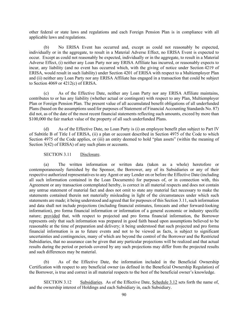 90 other federal or state laws and regulations and each Foreign Pension Plan is in compliance with all applicable laws and regulations. (b) No ERISA Event has occurred and, except as could not reasonably be expected, individually or in the aggregate, to result in a Material Adverse Effect, no ERISA Event is expected to occur. Except as could not reasonably be expected, individually or in the aggregate, to result in a Material Adverse Effect, (i) neither any Loan Party nor any ERISA Affiliate has incurred, or reasonably expects to incur, any liability (and no event has occurred which, with the giving of notice under Section 4219 of ERISA, would result in such liability) under Section 4201 of ERISA with respect to a Multiemployer Plan and (ii) neither any Loan Party nor any ERISA Affiliate has engaged in a transaction that could be subject to Section 4069 or 4212(c) of ERISA. (c) As of the Effective Date, neither any Loan Party nor any ERISA Affiliate maintains, contributes to or has any liability (whether actual or contingent) with respect to any Plan, Multiemployer Plan or Foreign Pension Plan. The present value of all accumulated benefit obligations of all underfunded Plans (based on the assumptions used for purposes of Statement of Financial Accounting Standards No. 87) did not, as of the date of the most recent financial statements reflecting such amounts, exceed by more than $100,000 the fair market value of the property of all such underfunded Plans. (d) As of the Effective Date, no Loan Party is (i) an employee benefit plan subject to Part IV of Subtitle B of Title I of ERISA, (ii) a plan or account described in Section 4975 of the Code to which Section 4975 of the Code applies, or (iii) an entity deemed to hold “plan assets” (within the meaning of Section 3(42) of ERISA) of any such plans or accounts. SECTION 3.11 Disclosure. (a) The written information or written data (taken as a whole) heretofore or contemporaneously furnished by the Sponsor, the Borrower, any of its Subsidiaries or any of their respective authorized representatives to any Agent or any Lender on or before the Effective Date (including all such information contained in the Loan Documents) for purposes of, or in connection with, this Agreement or any transaction contemplated hereby, is correct in all material respects and does not contain any untrue statement of material fact and does not omit to state any material fact necessary to make the statements contained therein not materially misleading in light of the circumstances under which such statements are made; it being understood and agreed that for purposes of this Section 3.11, such information and data shall not include projections (including financial estimates, forecasts and other forward-looking information), pro forma financial information or information of a general economic or industry specific nature; provided that, with respect to projected and pro forma financial information, the Borrower represents only that such information was prepared in good faith based upon assumptions believed to be reasonable at the time of preparation and delivery; it being understood that such projected and pro forma financial information is as to future events and not to be viewed as facts, is subject to significant uncertainties and contingencies, many of which are beyond the control of the Borrower and the Restricted Subsidiaries, that no assurance can be given that any particular projections will be realized and that actual results during the period or periods covered by any such projections may differ from the projected results and such differences may be material. (b) As of the Effective Date, the information included in the Beneficial Ownership Certification with respect to any beneficial owner (as defined in the Beneficial Ownership Regulation) of the Borrower, is true and correct in all material respects to the best of the beneficial owner’s knowledge. SECTION 3.12 Subsidiaries. As of the Effective Date, Schedule 3.12 sets forth the name of, and the ownership interest of Holdings and each Subsidiary in, each Subsidiary.