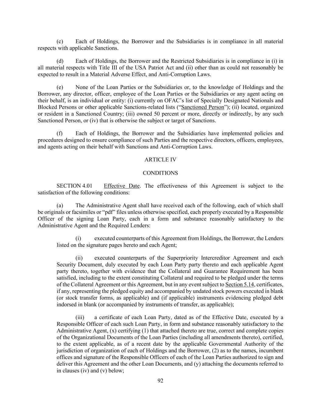 92 (c) Each of Holdings, the Borrower and the Subsidiaries is in compliance in all material respects with applicable Sanctions. (d) Each of Holdings, the Borrower and the Restricted Subsidiaries is in compliance in (i) in all material respects with Title III of the USA Patriot Act and (ii) other than as could not reasonably be expected to result in a Material Adverse Effect, and Anti-Corruption Laws. (e) None of the Loan Parties or the Subsidiaries or, to the knowledge of Holdings and the Borrower, any director, officer, employee of the Loan Parties or the Subsidiaries or any agent acting on their behalf, is an individual or entity: (i) currently on OFAC’s list of Specially Designated Nationals and Blocked Persons or other applicable Sanctions-related lists (“Sanctioned Person”); (ii) located, organized or resident in a Sanctioned Country; (iii) owned 50 percent or more, directly or indirectly, by any such Sanctioned Person, or (iv) that is otherwise the subject or target of Sanctions. (f) Each of Holdings, the Borrower and the Subsidiaries have implemented policies and procedures designed to ensure compliance of such Parties and the respective directors, officers, employees, and agents acting on their behalf with Sanctions and Anti-Corruption Laws. ARTICLE IV CONDITIONS SECTION 4.01 Effective Date. The effectiveness of this Agreement is subject to the satisfaction of the following conditions: (a) The Administrative Agent shall have received each of the following, each of which shall be originals or facsimiles or “pdf” files unless otherwise specified, each properly executed by a Responsible Officer of the signing Loan Party, each in a form and substance reasonably satisfactory to the Administrative Agent and the Required Lenders: (i) executed counterparts of this Agreement from Holdings, the Borrower, the Lenders listed on the signature pages hereto and each Agent; (ii) executed counterparts of the Superpriority Intercreditor Agreement and each Security Document, duly executed by each Loan Party party thereto and each applicable Agent party thereto, together with evidence that the Collateral and Guarantee Requirement has been satisfied, including to the extent constituting Collateral and required to be pledged under the terms of the Collateral Agreement or this Agreement, but in any event subject to Section 5.14, certificates, if any, representing the pledged equity and accompanied by undated stock powers executed in blank (or stock transfer forms, as applicable) and (if applicable) instruments evidencing pledged debt indorsed in blank (or accompanied by instruments of transfer, as applicable); (iii) a certificate of each Loan Party, dated as of the Effective Date, executed by a Responsible Officer of each such Loan Party, in form and substance reasonably satisfactory to the Administrative Agent, (x) certifying (1) that attached thereto are true, correct and complete copies of the Organizational Documents of the Loan Parties (including all amendments thereto), certified, to the extent applicable, as of a recent date by the applicable Governmental Authority of the jurisdiction of organization of each of Holdings and the Borrower, (2) as to the names, incumbent offices and signature of the Responsible Officers of each of the Loan Parties authorized to sign and deliver this Agreement and the other Loan Documents, and (y) attaching the documents referred to in clauses (iv) and (v) below;