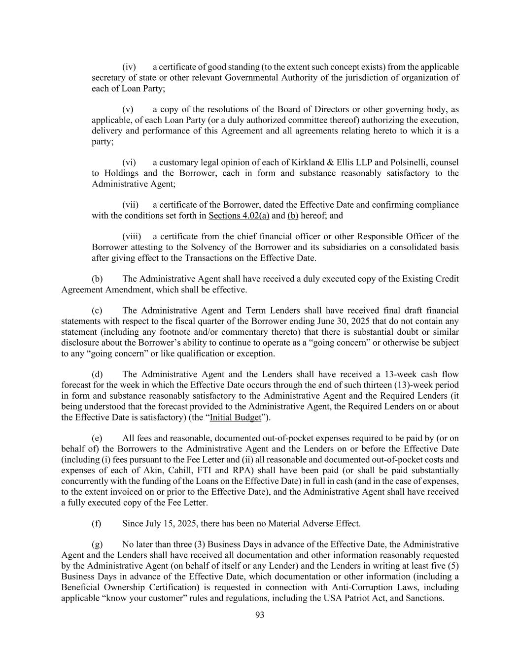 93 (iv) a certificate of good standing (to the extent such concept exists) from the applicable secretary of state or other relevant Governmental Authority of the jurisdiction of organization of each of Loan Party; (v) a copy of the resolutions of the Board of Directors or other governing body, as applicable, of each Loan Party (or a duly authorized committee thereof) authorizing the execution, delivery and performance of this Agreement and all agreements relating hereto to which it is a party; (vi) a customary legal opinion of each of Kirkland & Ellis LLP and Polsinelli, counsel to Holdings and the Borrower, each in form and substance reasonably satisfactory to the Administrative Agent; (vii) a certificate of the Borrower, dated the Effective Date and confirming compliance with the conditions set forth in Sections 4.02(a) and (b) hereof; and (viii) a certificate from the chief financial officer or other Responsible Officer of the Borrower attesting to the Solvency of the Borrower and its subsidiaries on a consolidated basis after giving effect to the Transactions on the Effective Date. (b) The Administrative Agent shall have received a duly executed copy of the Existing Credit Agreement Amendment, which shall be effective. (c) The Administrative Agent and Term Lenders shall have received final draft financial statements with respect to the fiscal quarter of the Borrower ending June 30, 2025 that do not contain any statement (including any footnote and/or commentary thereto) that there is substantial doubt or similar disclosure about the Borrower’s ability to continue to operate as a “going concern” or otherwise be subject to any “going concern” or like qualification or exception. (d) The Administrative Agent and the Lenders shall have received a 13-week cash flow forecast for the week in which the Effective Date occurs through the end of such thirteen (13)-week period in form and substance reasonably satisfactory to the Administrative Agent and the Required Lenders (it being understood that the forecast provided to the Administrative Agent, the Required Lenders on or about the Effective Date is satisfactory) (the “Initial Budget”). (e) All fees and reasonable, documented out-of-pocket expenses required to be paid by (or on behalf of) the Borrowers to the Administrative Agent and the Lenders on or before the Effective Date (including (i) fees pursuant to the Fee Letter and (ii) all reasonable and documented out-of-pocket costs and expenses of each of Akin, Cahill, FTI and RPA) shall have been paid (or shall be paid substantially concurrently with the funding of the Loans on the Effective Date) in full in cash (and in the case of expenses, to the extent invoiced on or prior to the Effective Date), and the Administrative Agent shall have received a fully executed copy of the Fee Letter. (f) Since July 15, 2025, there has been no Material Adverse Effect. (g) No later than three (3) Business Days in advance of the Effective Date, the Administrative Agent and the Lenders shall have received all documentation and other information reasonably requested by the Administrative Agent (on behalf of itself or any Lender) and the Lenders in writing at least five (5) Business Days in advance of the Effective Date, which documentation or other information (including a Beneficial Ownership Certification) is requested in connection with Anti-Corruption Laws, including applicable “know your customer” rules and regulations, including the USA Patriot Act, and Sanctions.