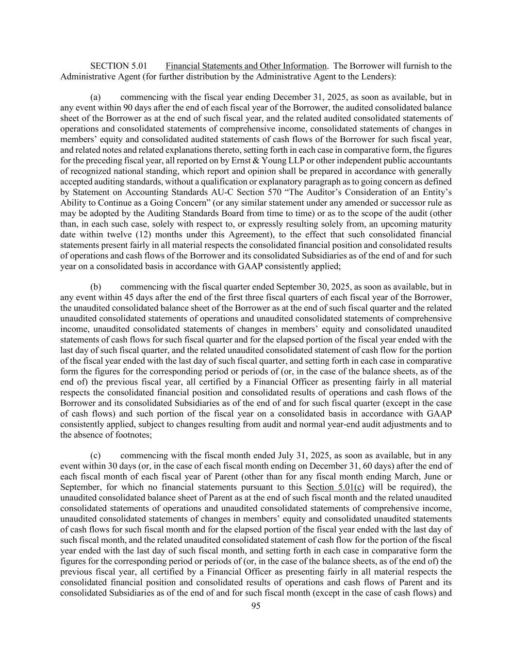 95 SECTION 5.01 Financial Statements and Other Information. The Borrower will furnish to the Administrative Agent (for further distribution by the Administrative Agent to the Lenders): (a) commencing with the fiscal year ending December 31, 2025, as soon as available, but in any event within 90 days after the end of each fiscal year of the Borrower, the audited consolidated balance sheet of the Borrower as at the end of such fiscal year, and the related audited consolidated statements of operations and consolidated statements of comprehensive income, consolidated statements of changes in members’ equity and consolidated audited statements of cash flows of the Borrower for such fiscal year, and related notes and related explanations thereto, setting forth in each case in comparative form, the figures for the preceding fiscal year, all reported on by Ernst & Young LLP or other independent public accountants of recognized national standing, which report and opinion shall be prepared in accordance with generally accepted auditing standards, without a qualification or explanatory paragraph as to going concern as defined by Statement on Accounting Standards AU-C Section 570 “The Auditor’s Consideration of an Entity’s Ability to Continue as a Going Concern” (or any similar statement under any amended or successor rule as may be adopted by the Auditing Standards Board from time to time) or as to the scope of the audit (other than, in each such case, solely with respect to, or expressly resulting solely from, an upcoming maturity date within twelve (12) months under this Agreement), to the effect that such consolidated financial statements present fairly in all material respects the consolidated financial position and consolidated results of operations and cash flows of the Borrower and its consolidated Subsidiaries as of the end of and for such year on a consolidated basis in accordance with GAAP consistently applied; (b) commencing with the fiscal quarter ended September 30, 2025, as soon as available, but in any event within 45 days after the end of the first three fiscal quarters of each fiscal year of the Borrower, the unaudited consolidated balance sheet of the Borrower as at the end of such fiscal quarter and the related unaudited consolidated statements of operations and unaudited consolidated statements of comprehensive income, unaudited consolidated statements of changes in members’ equity and consolidated unaudited statements of cash flows for such fiscal quarter and for the elapsed portion of the fiscal year ended with the last day of such fiscal quarter, and the related unaudited consolidated statement of cash flow for the portion of the fiscal year ended with the last day of such fiscal quarter, and setting forth in each case in comparative form the figures for the corresponding period or periods of (or, in the case of the balance sheets, as of the end of) the previous fiscal year, all certified by a Financial Officer as presenting fairly in all material respects the consolidated financial position and consolidated results of operations and cash flows of the Borrower and its consolidated Subsidiaries as of the end of and for such fiscal quarter (except in the case of cash flows) and such portion of the fiscal year on a consolidated basis in accordance with GAAP consistently applied, subject to changes resulting from audit and normal year-end audit adjustments and to the absence of footnotes; (c) commencing with the fiscal month ended July 31, 2025, as soon as available, but in any event within 30 days (or, in the case of each fiscal month ending on December 31, 60 days) after the end of each fiscal month of each fiscal year of Parent (other than for any fiscal month ending March, June or September, for which no financial statements pursuant to this Section 5.01(c) will be required), the unaudited consolidated balance sheet of Parent as at the end of such fiscal month and the related unaudited consolidated statements of operations and unaudited consolidated statements of comprehensive income, unaudited consolidated statements of changes in members’ equity and consolidated unaudited statements of cash flows for such fiscal month and for the elapsed portion of the fiscal year ended with the last day of such fiscal month, and the related unaudited consolidated statement of cash flow for the portion of the fiscal year ended with the last day of such fiscal month, and setting forth in each case in comparative form the figures for the corresponding period or periods of (or, in the case of the balance sheets, as of the end of) the previous fiscal year, all certified by a Financial Officer as presenting fairly in all material respects the consolidated financial position and consolidated results of operations and cash flows of Parent and its consolidated Subsidiaries as of the end of and for such fiscal month (except in the case of cash flows) and