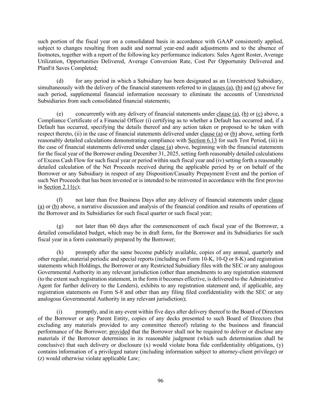 96 such portion of the fiscal year on a consolidated basis in accordance with GAAP consistently applied, subject to changes resulting from audit and normal year-end audit adjustments and to the absence of footnotes, together with a report of the following key performance indicators: Sales Agent Roster, Average Utilization, Opportunities Delivered, Average Conversion Rate, Cost Per Opportunity Delivered and PlanFit Saves Completed; (d) for any period in which a Subsidiary has been designated as an Unrestricted Subsidiary, simultaneously with the delivery of the financial statements referred to in clauses (a), (b) and (c) above for such period, supplemental financial information necessary to eliminate the accounts of Unrestricted Subsidiaries from such consolidated financial statements; (e) concurrently with any delivery of financial statements under clause (a), (b) or (c) above, a Compliance Certificate of a Financial Officer (i) certifying as to whether a Default has occurred and, if a Default has occurred, specifying the details thereof and any action taken or proposed to be taken with respect thereto, (ii) in the case of financial statements delivered under clause (a) or (b) above, setting forth reasonably detailed calculations demonstrating compliance with Section 6.13 for such Test Period, (iii) in the case of financial statements delivered under clause (a) above, beginning with the financial statements for the fiscal year of the Borrower ending December 31, 2025, setting forth reasonably detailed calculations of Excess Cash Flow for such fiscal year or period within such fiscal year and (iv) setting forth a reasonably detailed calculation of the Net Proceeds received during the applicable period by or on behalf of the Borrower or any Subsidiary in respect of any Disposition/Casualty Prepayment Event and the portion of such Net Proceeds that has been invested or is intended to be reinvested in accordance with the first proviso in Section 2.11(c); (f) not later than five Business Days after any delivery of financial statements under clause (a) or (b) above, a narrative discussion and analysis of the financial condition and results of operations of the Borrower and its Subsidiaries for such fiscal quarter or such fiscal year; (g) not later than 60 days after the commencement of each fiscal year of the Borrower, a detailed consolidated budget, which may be in draft form, for the Borrower and its Subsidiaries for such fiscal year in a form customarily prepared by the Borrower; (h) promptly after the same become publicly available, copies of any annual, quarterly and other regular, material periodic and special reports (including on Form 10-K, 10-Q or 8-K) and registration statements which Holdings, the Borrower or any Restricted Subsidiary files with the SEC or any analogous Governmental Authority in any relevant jurisdiction (other than amendments to any registration statement (to the extent such registration statement, in the form it becomes effective, is delivered to the Administrative Agent for further delivery to the Lenders), exhibits to any registration statement and, if applicable, any registration statements on Form S-8 and other than any filing filed confidentiality with the SEC or any analogous Governmental Authority in any relevant jurisdiction); (i) promptly, and in any event within five days after delivery thereof to the Board of Directors of the Borrower or any Parent Entity, copies of any decks presented to such Board of Directors (but excluding any materials provided to any committee thereof) relating to the business and financial performance of the Borrower; provided that the Borrower shall not be required to deliver or disclose any materials if the Borrower determines in its reasonable judgment (which such determination shall be conclusive) that such delivery or disclosure (x) would violate bona fide confidentiality obligations, (y) contains information of a privileged nature (including information subject to attorney-client privilege) or (z) would otherwise violate applicable Law;