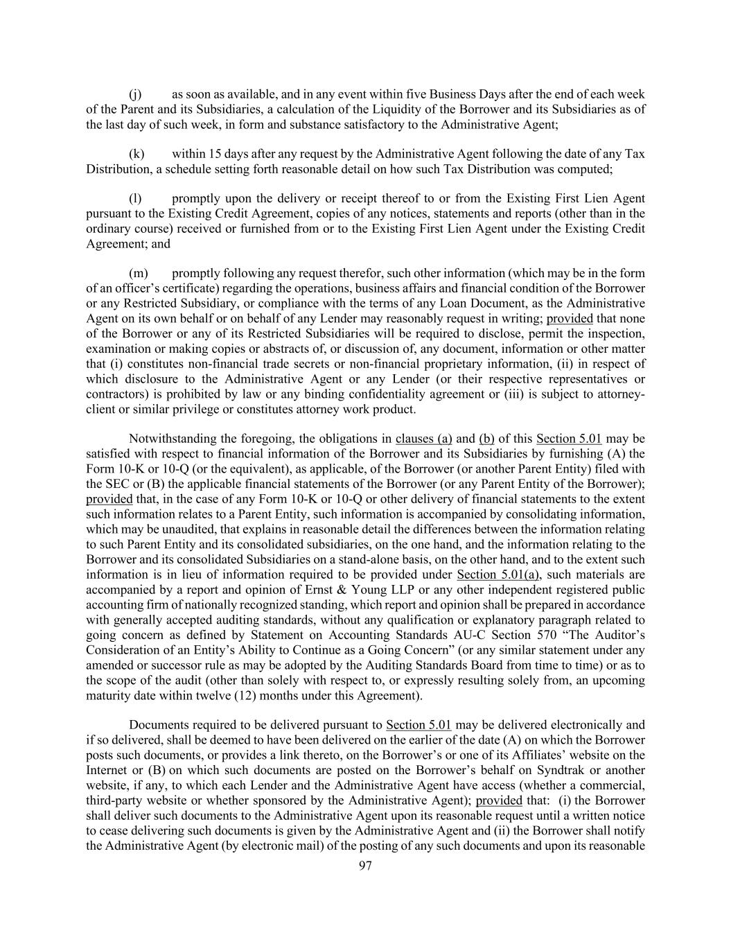 97 (j) as soon as available, and in any event within five Business Days after the end of each week of the Parent and its Subsidiaries, a calculation of the Liquidity of the Borrower and its Subsidiaries as of the last day of such week, in form and substance satisfactory to the Administrative Agent; (k) within 15 days after any request by the Administrative Agent following the date of any Tax Distribution, a schedule setting forth reasonable detail on how such Tax Distribution was computed; (l) promptly upon the delivery or receipt thereof to or from the Existing First Lien Agent pursuant to the Existing Credit Agreement, copies of any notices, statements and reports (other than in the ordinary course) received or furnished from or to the Existing First Lien Agent under the Existing Credit Agreement; and (m) promptly following any request therefor, such other information (which may be in the form of an officer’s certificate) regarding the operations, business affairs and financial condition of the Borrower or any Restricted Subsidiary, or compliance with the terms of any Loan Document, as the Administrative Agent on its own behalf or on behalf of any Lender may reasonably request in writing; provided that none of the Borrower or any of its Restricted Subsidiaries will be required to disclose, permit the inspection, examination or making copies or abstracts of, or discussion of, any document, information or other matter that (i) constitutes non-financial trade secrets or non-financial proprietary information, (ii) in respect of which disclosure to the Administrative Agent or any Lender (or their respective representatives or contractors) is prohibited by law or any binding confidentiality agreement or (iii) is subject to attorney- client or similar privilege or constitutes attorney work product. Notwithstanding the foregoing, the obligations in clauses (a) and (b) of this Section 5.01 may be satisfied with respect to financial information of the Borrower and its Subsidiaries by furnishing (A) the Form 10-K or 10-Q (or the equivalent), as applicable, of the Borrower (or another Parent Entity) filed with the SEC or (B) the applicable financial statements of the Borrower (or any Parent Entity of the Borrower); provided that, in the case of any Form 10-K or 10-Q or other delivery of financial statements to the extent such information relates to a Parent Entity, such information is accompanied by consolidating information, which may be unaudited, that explains in reasonable detail the differences between the information relating to such Parent Entity and its consolidated subsidiaries, on the one hand, and the information relating to the Borrower and its consolidated Subsidiaries on a stand-alone basis, on the other hand, and to the extent such information is in lieu of information required to be provided under Section 5.01(a), such materials are accompanied by a report and opinion of Ernst & Young LLP or any other independent registered public accounting firm of nationally recognized standing, which report and opinion shall be prepared in accordance with generally accepted auditing standards, without any qualification or explanatory paragraph related to going concern as defined by Statement on Accounting Standards AU-C Section 570 “The Auditor’s Consideration of an Entity’s Ability to Continue as a Going Concern” (or any similar statement under any amended or successor rule as may be adopted by the Auditing Standards Board from time to time) or as to the scope of the audit (other than solely with respect to, or expressly resulting solely from, an upcoming maturity date within twelve (12) months under this Agreement). Documents required to be delivered pursuant to Section 5.01 may be delivered electronically and if so delivered, shall be deemed to have been delivered on the earlier of the date (A) on which the Borrower posts such documents, or provides a link thereto, on the Borrower’s or one of its Affiliates’ website on the Internet or (B) on which such documents are posted on the Borrower’s behalf on Syndtrak or another website, if any, to which each Lender and the Administrative Agent have access (whether a commercial, third-party website or whether sponsored by the Administrative Agent); provided that: (i) the Borrower shall deliver such documents to the Administrative Agent upon its reasonable request until a written notice to cease delivering such documents is given by the Administrative Agent and (ii) the Borrower shall notify the Administrative Agent (by electronic mail) of the posting of any such documents and upon its reasonable