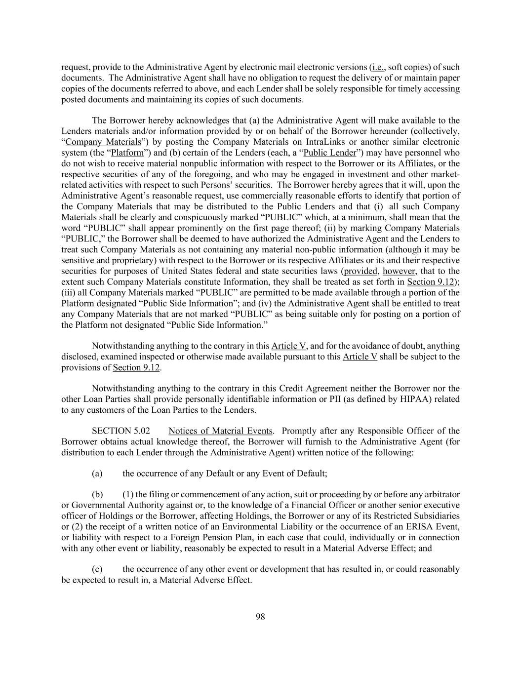 98 request, provide to the Administrative Agent by electronic mail electronic versions (i.e., soft copies) of such documents. The Administrative Agent shall have no obligation to request the delivery of or maintain paper copies of the documents referred to above, and each Lender shall be solely responsible for timely accessing posted documents and maintaining its copies of such documents. The Borrower hereby acknowledges that (a) the Administrative Agent will make available to the Lenders materials and/or information provided by or on behalf of the Borrower hereunder (collectively, “Company Materials”) by posting the Company Materials on IntraLinks or another similar electronic system (the “Platform”) and (b) certain of the Lenders (each, a “Public Lender”) may have personnel who do not wish to receive material nonpublic information with respect to the Borrower or its Affiliates, or the respective securities of any of the foregoing, and who may be engaged in investment and other market- related activities with respect to such Persons’ securities. The Borrower hereby agrees that it will, upon the Administrative Agent’s reasonable request, use commercially reasonable efforts to identify that portion of the Company Materials that may be distributed to the Public Lenders and that (i) all such Company Materials shall be clearly and conspicuously marked “PUBLIC” which, at a minimum, shall mean that the word “PUBLIC” shall appear prominently on the first page thereof; (ii) by marking Company Materials “PUBLIC,” the Borrower shall be deemed to have authorized the Administrative Agent and the Lenders to treat such Company Materials as not containing any material non-public information (although it may be sensitive and proprietary) with respect to the Borrower or its respective Affiliates or its and their respective securities for purposes of United States federal and state securities laws (provided, however, that to the extent such Company Materials constitute Information, they shall be treated as set forth in Section 9.12); (iii) all Company Materials marked “PUBLIC” are permitted to be made available through a portion of the Platform designated “Public Side Information”; and (iv) the Administrative Agent shall be entitled to treat any Company Materials that are not marked “PUBLIC” as being suitable only for posting on a portion of the Platform not designated “Public Side Information.” Notwithstanding anything to the contrary in this Article V, and for the avoidance of doubt, anything disclosed, examined inspected or otherwise made available pursuant to this Article V shall be subject to the provisions of Section 9.12. Notwithstanding anything to the contrary in this Credit Agreement neither the Borrower nor the other Loan Parties shall provide personally identifiable information or PII (as defined by HIPAA) related to any customers of the Loan Parties to the Lenders. SECTION 5.02 Notices of Material Events. Promptly after any Responsible Officer of the Borrower obtains actual knowledge thereof, the Borrower will furnish to the Administrative Agent (for distribution to each Lender through the Administrative Agent) written notice of the following: (a) the occurrence of any Default or any Event of Default; (b) (1) the filing or commencement of any action, suit or proceeding by or before any arbitrator or Governmental Authority against or, to the knowledge of a Financial Officer or another senior executive officer of Holdings or the Borrower, affecting Holdings, the Borrower or any of its Restricted Subsidiaries or (2) the receipt of a written notice of an Environmental Liability or the occurrence of an ERISA Event, or liability with respect to a Foreign Pension Plan, in each case that could, individually or in connection with any other event or liability, reasonably be expected to result in a Material Adverse Effect; and (c) the occurrence of any other event or development that has resulted in, or could reasonably be expected to result in, a Material Adverse Effect.