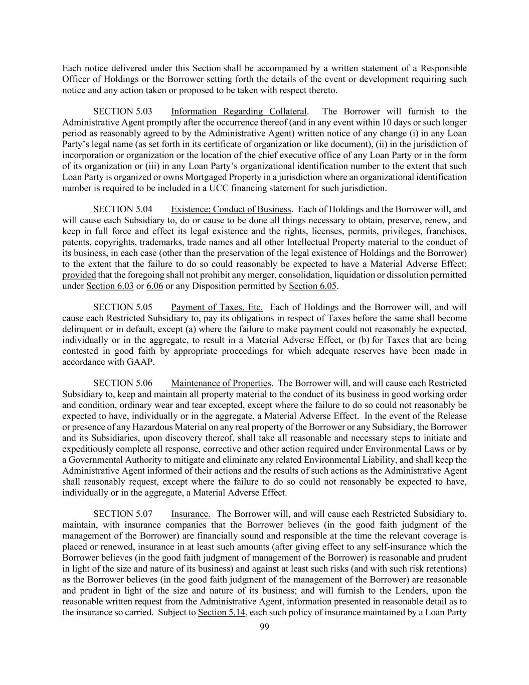 99 Each notice delivered under this Section shall be accompanied by a written statement of a Responsible Officer of Holdings or the Borrower setting forth the details of the event or development requiring such notice and any action taken or proposed to be taken with respect thereto. SECTION 5.03 Information Regarding Collateral. The Borrower will furnish to the Administrative Agent promptly after the occurrence thereof (and in any event within 10 days or such longer period as reasonably agreed to by the Administrative Agent) written notice of any change (i) in any Loan Party’s legal name (as set forth in its certificate of organization or like document), (ii) in the jurisdiction of incorporation or organization or the location of the chief executive office of any Loan Party or in the form of its organization or (iii) in any Loan Party’s organizational identification number to the extent that such Loan Party is organized or owns Mortgaged Property in a jurisdiction where an organizational identification number is required to be included in a UCC financing statement for such jurisdiction. SECTION 5.04 Existence; Conduct of Business. Each of Holdings and the Borrower will, and will cause each Subsidiary to, do or cause to be done all things necessary to obtain, preserve, renew, and keep in full force and effect its legal existence and the rights, licenses, permits, privileges, franchises, patents, copyrights, trademarks, trade names and all other Intellectual Property material to the conduct of its business, in each case (other than the preservation of the legal existence of Holdings and the Borrower) to the extent that the failure to do so could reasonably be expected to have a Material Adverse Effect; provided that the foregoing shall not prohibit any merger, consolidation, liquidation or dissolution permitted under Section 6.03 or 6.06 or any Disposition permitted by Section 6.05. SECTION 5.05 Payment of Taxes, Etc. Each of Holdings and the Borrower will, and will cause each Restricted Subsidiary to, pay its obligations in respect of Taxes before the same shall become delinquent or in default, except (a) where the failure to make payment could not reasonably be expected, individually or in the aggregate, to result in a Material Adverse Effect, or (b) for Taxes that are being contested in good faith by appropriate proceedings for which adequate reserves have been made in accordance with GAAP. SECTION 5.06 Maintenance of Properties. The Borrower will, and will cause each Restricted Subsidiary to, keep and maintain all property material to the conduct of its business in good working order and condition, ordinary wear and tear excepted, except where the failure to do so could not reasonably be expected to have, individually or in the aggregate, a Material Adverse Effect. In the event of the Release or presence of any Hazardous Material on any real property of the Borrower or any Subsidiary, the Borrower and its Subsidiaries, upon discovery thereof, shall take all reasonable and necessary steps to initiate and expeditiously complete all response, corrective and other action required under Environmental Laws or by a Governmental Authority to mitigate and eliminate any related Environmental Liability, and shall keep the Administrative Agent informed of their actions and the results of such actions as the Administrative Agent shall reasonably request, except where the failure to do so could not reasonably be expected to have, individually or in the aggregate, a Material Adverse Effect. SECTION 5.07 Insurance. The Borrower will, and will cause each Restricted Subsidiary to, maintain, with insurance companies that the Borrower believes (in the good faith judgment of the management of the Borrower) are financially sound and responsible at the time the relevant coverage is placed or renewed, insurance in at least such amounts (after giving effect to any self-insurance which the Borrower believes (in the good faith judgment of management of the Borrower) is reasonable and prudent in light of the size and nature of its business) and against at least such risks (and with such risk retentions) as the Borrower believes (in the good faith judgment of the management of the Borrower) are reasonable and prudent in light of the size and nature of its business; and will furnish to the Lenders, upon the reasonable written request from the Administrative Agent, information presented in reasonable detail as to the insurance so carried. Subject to Section 5.14, each such policy of insurance maintained by a Loan Party
