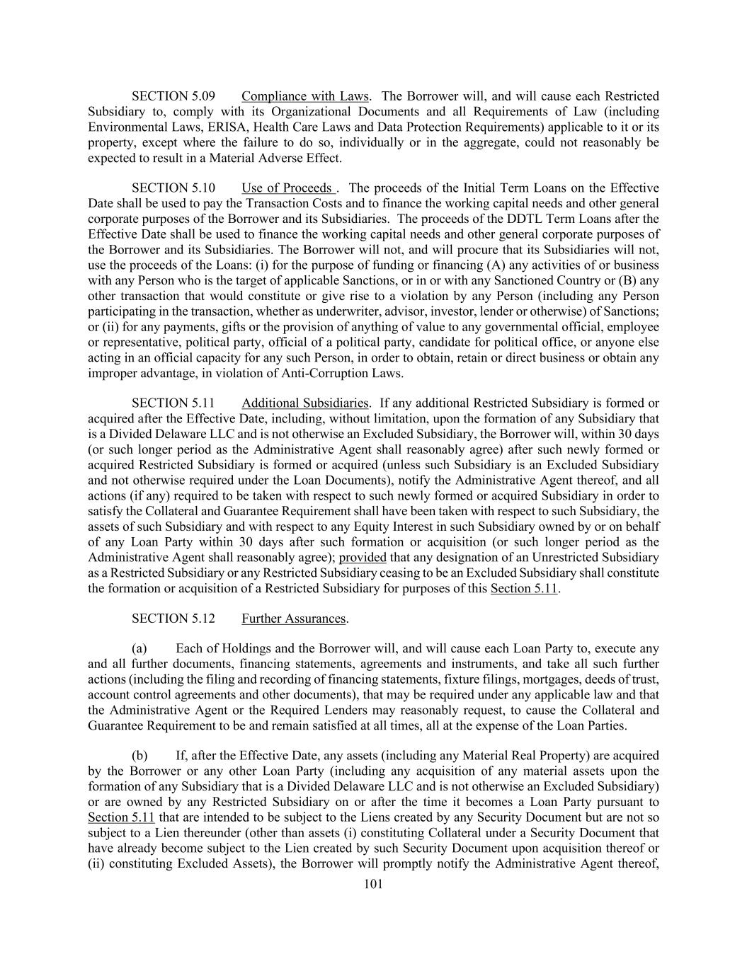101 SECTION 5.09 Compliance with Laws. The Borrower will, and will cause each Restricted Subsidiary to, comply with its Organizational Documents and all Requirements of Law (including Environmental Laws, ERISA, Health Care Laws and Data Protection Requirements) applicable to it or its property, except where the failure to do so, individually or in the aggregate, could not reasonably be expected to result in a Material Adverse Effect. SECTION 5.10 Use of Proceeds . The proceeds of the Initial Term Loans on the Effective Date shall be used to pay the Transaction Costs and to finance the working capital needs and other general corporate purposes of the Borrower and its Subsidiaries. The proceeds of the DDTL Term Loans after the Effective Date shall be used to finance the working capital needs and other general corporate purposes of the Borrower and its Subsidiaries. The Borrower will not, and will procure that its Subsidiaries will not, use the proceeds of the Loans: (i) for the purpose of funding or financing (A) any activities of or business with any Person who is the target of applicable Sanctions, or in or with any Sanctioned Country or (B) any other transaction that would constitute or give rise to a violation by any Person (including any Person participating in the transaction, whether as underwriter, advisor, investor, lender or otherwise) of Sanctions; or (ii) for any payments, gifts or the provision of anything of value to any governmental official, employee or representative, political party, official of a political party, candidate for political office, or anyone else acting in an official capacity for any such Person, in order to obtain, retain or direct business or obtain any improper advantage, in violation of Anti-Corruption Laws. SECTION 5.11 Additional Subsidiaries. If any additional Restricted Subsidiary is formed or acquired after the Effective Date, including, without limitation, upon the formation of any Subsidiary that is a Divided Delaware LLC and is not otherwise an Excluded Subsidiary, the Borrower will, within 30 days (or such longer period as the Administrative Agent shall reasonably agree) after such newly formed or acquired Restricted Subsidiary is formed or acquired (unless such Subsidiary is an Excluded Subsidiary and not otherwise required under the Loan Documents), notify the Administrative Agent thereof, and all actions (if any) required to be taken with respect to such newly formed or acquired Subsidiary in order to satisfy the Collateral and Guarantee Requirement shall have been taken with respect to such Subsidiary, the assets of such Subsidiary and with respect to any Equity Interest in such Subsidiary owned by or on behalf of any Loan Party within 30 days after such formation or acquisition (or such longer period as the Administrative Agent shall reasonably agree); provided that any designation of an Unrestricted Subsidiary as a Restricted Subsidiary or any Restricted Subsidiary ceasing to be an Excluded Subsidiary shall constitute the formation or acquisition of a Restricted Subsidiary for purposes of this Section 5.11. SECTION 5.12 Further Assurances. (a) Each of Holdings and the Borrower will, and will cause each Loan Party to, execute any and all further documents, financing statements, agreements and instruments, and take all such further actions (including the filing and recording of financing statements, fixture filings, mortgages, deeds of trust, account control agreements and other documents), that may be required under any applicable law and that the Administrative Agent or the Required Lenders may reasonably request, to cause the Collateral and Guarantee Requirement to be and remain satisfied at all times, all at the expense of the Loan Parties. (b) If, after the Effective Date, any assets (including any Material Real Property) are acquired by the Borrower or any other Loan Party (including any acquisition of any material assets upon the formation of any Subsidiary that is a Divided Delaware LLC and is not otherwise an Excluded Subsidiary) or are owned by any Restricted Subsidiary on or after the time it becomes a Loan Party pursuant to Section 5.11 that are intended to be subject to the Liens created by any Security Document but are not so subject to a Lien thereunder (other than assets (i) constituting Collateral under a Security Document that have already become subject to the Lien created by such Security Document upon acquisition thereof or (ii) constituting Excluded Assets), the Borrower will promptly notify the Administrative Agent thereof,