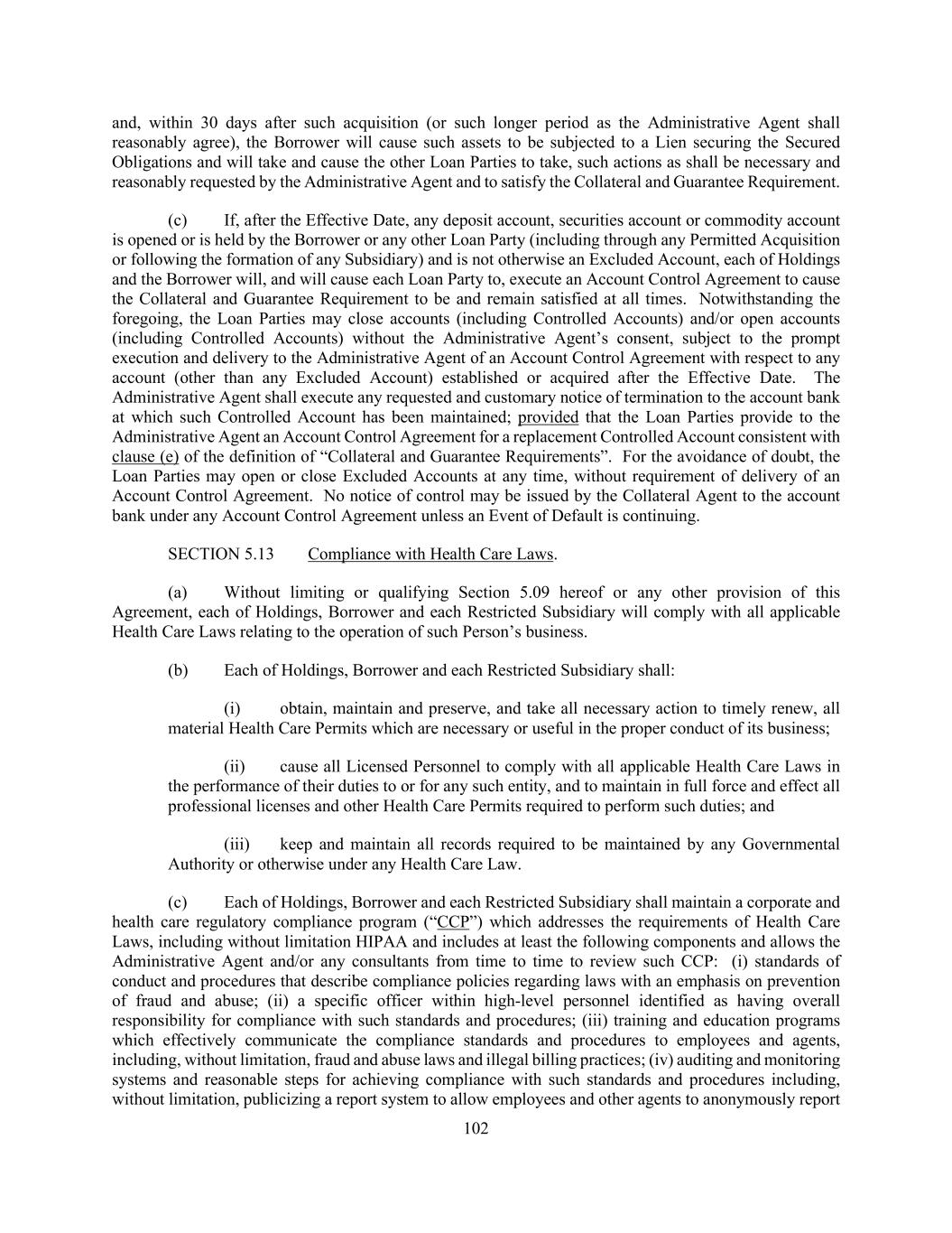 102 and, within 30 days after such acquisition (or such longer period as the Administrative Agent shall reasonably agree), the Borrower will cause such assets to be subjected to a Lien securing the Secured Obligations and will take and cause the other Loan Parties to take, such actions as shall be necessary and reasonably requested by the Administrative Agent and to satisfy the Collateral and Guarantee Requirement. (c) If, after the Effective Date, any deposit account, securities account or commodity account is opened or is held by the Borrower or any other Loan Party (including through any Permitted Acquisition or following the formation of any Subsidiary) and is not otherwise an Excluded Account, each of Holdings and the Borrower will, and will cause each Loan Party to, execute an Account Control Agreement to cause the Collateral and Guarantee Requirement to be and remain satisfied at all times. Notwithstanding the foregoing, the Loan Parties may close accounts (including Controlled Accounts) and/or open accounts (including Controlled Accounts) without the Administrative Agent’s consent, subject to the prompt execution and delivery to the Administrative Agent of an Account Control Agreement with respect to any account (other than any Excluded Account) established or acquired after the Effective Date. The Administrative Agent shall execute any requested and customary notice of termination to the account bank at which such Controlled Account has been maintained; provided that the Loan Parties provide to the Administrative Agent an Account Control Agreement for a replacement Controlled Account consistent with clause (e) of the definition of “Collateral and Guarantee Requirements”. For the avoidance of doubt, the Loan Parties may open or close Excluded Accounts at any time, without requirement of delivery of an Account Control Agreement. No notice of control may be issued by the Collateral Agent to the account bank under any Account Control Agreement unless an Event of Default is continuing. SECTION 5.13 Compliance with Health Care Laws. (a) Without limiting or qualifying Section 5.09 hereof or any other provision of this Agreement, each of Holdings, Borrower and each Restricted Subsidiary will comply with all applicable Health Care Laws relating to the operation of such Person’s business. (b) Each of Holdings, Borrower and each Restricted Subsidiary shall: (i) obtain, maintain and preserve, and take all necessary action to timely renew, all material Health Care Permits which are necessary or useful in the proper conduct of its business; (ii) cause all Licensed Personnel to comply with all applicable Health Care Laws in the performance of their duties to or for any such entity, and to maintain in full force and effect all professional licenses and other Health Care Permits required to perform such duties; and (iii) keep and maintain all records required to be maintained by any Governmental Authority or otherwise under any Health Care Law. (c) Each of Holdings, Borrower and each Restricted Subsidiary shall maintain a corporate and health care regulatory compliance program (“CCP”) which addresses the requirements of Health Care Laws, including without limitation HIPAA and includes at least the following components and allows the Administrative Agent and/or any consultants from time to time to review such CCP: (i) standards of conduct and procedures that describe compliance policies regarding laws with an emphasis on prevention of fraud and abuse; (ii) a specific officer within high-level personnel identified as having overall responsibility for compliance with such standards and procedures; (iii) training and education programs which effectively communicate the compliance standards and procedures to employees and agents, including, without limitation, fraud and abuse laws and illegal billing practices; (iv) auditing and monitoring systems and reasonable steps for achieving compliance with such standards and procedures including, without limitation, publicizing a report system to allow employees and other agents to anonymously report