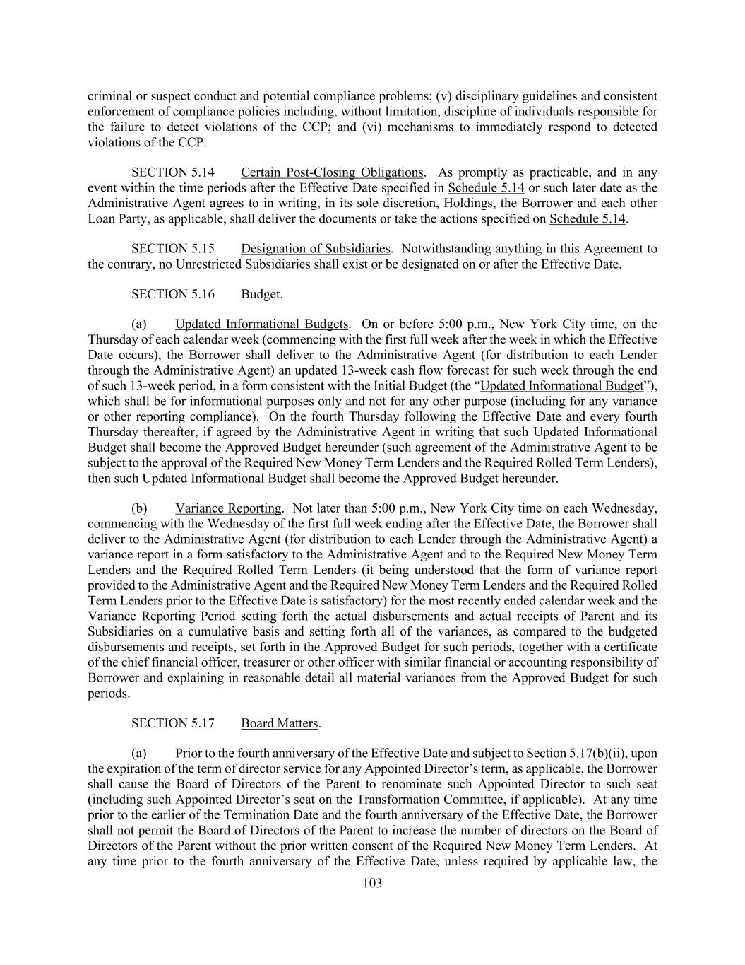 103 criminal or suspect conduct and potential compliance problems; (v) disciplinary guidelines and consistent enforcement of compliance policies including, without limitation, discipline of individuals responsible for the failure to detect violations of the CCP; and (vi) mechanisms to immediately respond to detected violations of the CCP. SECTION 5.14 Certain Post-Closing Obligations. As promptly as practicable, and in any event within the time periods after the Effective Date specified in Schedule 5.14 or such later date as the Administrative Agent agrees to in writing, in its sole discretion, Holdings, the Borrower and each other Loan Party, as applicable, shall deliver the documents or take the actions specified on Schedule 5.14. SECTION 5.15 Designation of Subsidiaries. Notwithstanding anything in this Agreement to the contrary, no Unrestricted Subsidiaries shall exist or be designated on or after the Effective Date. SECTION 5.16 Budget. (a) Updated Informational Budgets. On or before 5:00 p.m., New York City time, on the Thursday of each calendar week (commencing with the first full week after the week in which the Effective Date occurs), the Borrower shall deliver to the Administrative Agent (for distribution to each Lender through the Administrative Agent) an updated 13-week cash flow forecast for such week through the end of such 13-week period, in a form consistent with the Initial Budget (the “Updated Informational Budget”), which shall be for informational purposes only and not for any other purpose (including for any variance or other reporting compliance). On the fourth Thursday following the Effective Date and every fourth Thursday thereafter, if agreed by the Administrative Agent in writing that such Updated Informational Budget shall become the Approved Budget hereunder (such agreement of the Administrative Agent to be subject to the approval of the Required New Money Term Lenders and the Required Rolled Term Lenders), then such Updated Informational Budget shall become the Approved Budget hereunder. (b) Variance Reporting. Not later than 5:00 p.m., New York City time on each Wednesday, commencing with the Wednesday of the first full week ending after the Effective Date, the Borrower shall deliver to the Administrative Agent (for distribution to each Lender through the Administrative Agent) a variance report in a form satisfactory to the Administrative Agent and to the Required New Money Term Lenders and the Required Rolled Term Lenders (it being understood that the form of variance report provided to the Administrative Agent and the Required New Money Term Lenders and the Required Rolled Term Lenders prior to the Effective Date is satisfactory) for the most recently ended calendar week and the Variance Reporting Period setting forth the actual disbursements and actual receipts of Parent and its Subsidiaries on a cumulative basis and setting forth all of the variances, as compared to the budgeted disbursements and receipts, set forth in the Approved Budget for such periods, together with a certificate of the chief financial officer, treasurer or other officer with similar financial or accounting responsibility of Borrower and explaining in reasonable detail all material variances from the Approved Budget for such periods. SECTION 5.17 Board Matters. (a) Prior to the fourth anniversary of the Effective Date and subject to Section 5.17(b)(ii), upon the expiration of the term of director service for any Appointed Director’s term, as applicable, the Borrower shall cause the Board of Directors of the Parent to renominate such Appointed Director to such seat (including such Appointed Director’s seat on the Transformation Committee, if applicable). At any time prior to the earlier of the Termination Date and the fourth anniversary of the Effective Date, the Borrower shall not permit the Board of Directors of the Parent to increase the number of directors on the Board of Directors of the Parent without the prior written consent of the Required New Money Term Lenders. At any time prior to the fourth anniversary of the Effective Date, unless required by applicable law, the