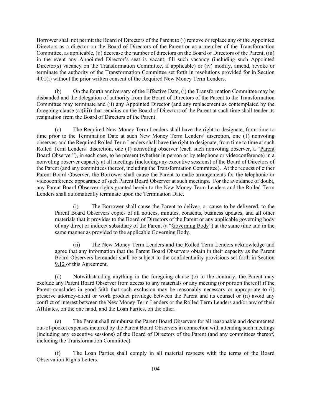 104 Borrower shall not permit the Board of Directors of the Parent to (i) remove or replace any of the Appointed Directors as a director on the Board of Directors of the Parent or as a member of the Transformation Committee, as applicable, (ii) decrease the number of directors on the Board of Directors of the Parent, (iii) in the event any Appointed Director’s seat is vacant, fill such vacancy (including such Appointed Director(s) vacancy on the Transformation Committee, if applicable) or (iv) modify, amend, revoke or terminate the authority of the Transformation Committee set forth in resolutions provided for in Section 4.01(i) without the prior written consent of the Required New Money Term Lenders. (b) On the fourth anniversary of the Effective Date, (i) the Transformation Committee may be disbanded and the delegation of authority from the Board of Directors of the Parent to the Transformation Committee may terminate and (ii) any Appointed Director (and any replacement as contemplated by the foregoing clause (a)(iii)) that remains on the Board of Directors of the Parent at such time shall tender its resignation from the Board of Directors of the Parent. (c) The Required New Money Term Lenders shall have the right to designate, from time to time prior to the Termination Date at such New Money Term Lenders’ discretion, one (1) nonvoting observer, and the Required Rolled Term Lenders shall have the right to designate, from time to time at such Rolled Term Lenders’ discretion, one (1) nonvoting observer (each such nonvoting observer, a “Parent Board Observer”), in each case, to be present (whether in person or by telephone or videoconference) in a nonvoting observer capacity at all meetings (including any executive sessions) of the Board of Directors of the Parent (and any committees thereof, including the Transformation Committee). At the request of either Parent Board Observer, the Borrower shall cause the Parent to make arrangements for the telephonic or videoconference appearance of such Parent Board Observer at such meetings. For the avoidance of doubt, any Parent Board Observer rights granted herein to the New Money Term Lenders and the Rolled Term Lenders shall automatically terminate upon the Termination Date. (i) The Borrower shall cause the Parent to deliver, or cause to be delivered, to the Parent Board Observers copies of all notices, minutes, consents, business updates, and all other materials that it provides to the Board of Directors of the Parent or any applicable governing body of any direct or indirect subsidiary of the Parent (a “Governing Body”) at the same time and in the same manner as provided to the applicable Governing Body. (ii) The New Money Term Lenders and the Rolled Term Lenders acknowledge and agree that any information that the Parent Board Observers obtain in their capacity as the Parent Board Observers hereunder shall be subject to the confidentiality provisions set forth in Section 9.12 of this Agreement. (d) Notwithstanding anything in the foregoing clause (c) to the contrary, the Parent may exclude any Parent Board Observer from access to any materials or any meeting (or portion thereof) if the Parent concludes in good faith that such exclusion may be reasonably necessary or appropriate to (i) preserve attorney-client or work product privilege between the Parent and its counsel or (ii) avoid any conflict of interest between the New Money Term Lenders or the Rolled Term Lenders and/or any of their Affiliates, on the one hand, and the Loan Parties, on the other. (e) The Parent shall reimburse the Parent Board Observers for all reasonable and documented out-of-pocket expenses incurred by the Parent Board Observers in connection with attending such meetings (including any executive sessions) of the Board of Directors of the Parent (and any committees thereof, including the Transformation Committee). (f) The Loan Parties shall comply in all material respects with the terms of the Board Observation Rights Letters.