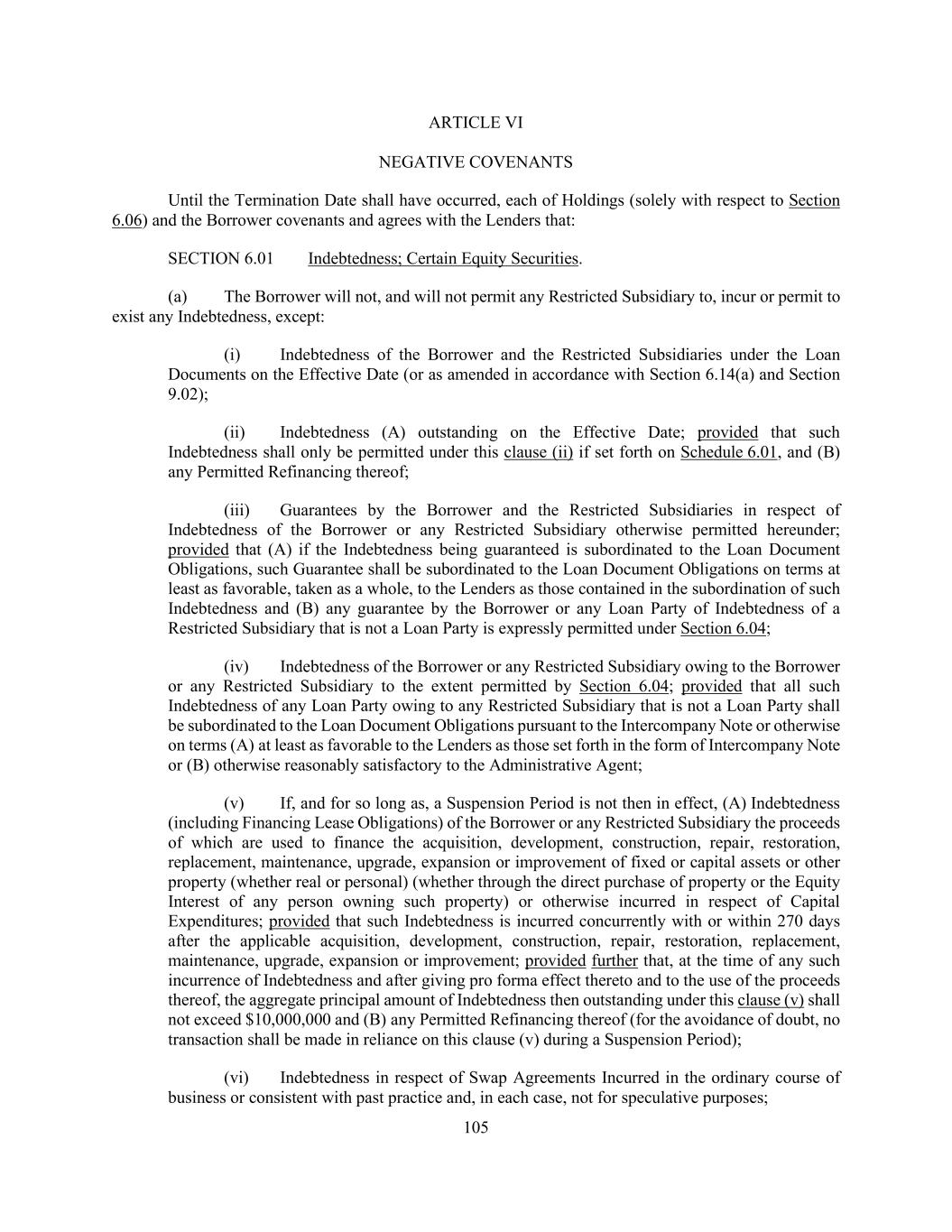 105 ARTICLE VI NEGATIVE COVENANTS Until the Termination Date shall have occurred, each of Holdings (solely with respect to Section 6.06) and the Borrower covenants and agrees with the Lenders that: SECTION 6.01 Indebtedness; Certain Equity Securities. (a) The Borrower will not, and will not permit any Restricted Subsidiary to, incur or permit to exist any Indebtedness, except: (i) Indebtedness of the Borrower and the Restricted Subsidiaries under the Loan Documents on the Effective Date (or as amended in accordance with Section 6.14(a) and Section 9.02); (ii) Indebtedness (A) outstanding on the Effective Date; provided that such Indebtedness shall only be permitted under this clause (ii) if set forth on Schedule 6.01, and (B) any Permitted Refinancing thereof; (iii) Guarantees by the Borrower and the Restricted Subsidiaries in respect of Indebtedness of the Borrower or any Restricted Subsidiary otherwise permitted hereunder; provided that (A) if the Indebtedness being guaranteed is subordinated to the Loan Document Obligations, such Guarantee shall be subordinated to the Loan Document Obligations on terms at least as favorable, taken as a whole, to the Lenders as those contained in the subordination of such Indebtedness and (B) any guarantee by the Borrower or any Loan Party of Indebtedness of a Restricted Subsidiary that is not a Loan Party is expressly permitted under Section 6.04; (iv) Indebtedness of the Borrower or any Restricted Subsidiary owing to the Borrower or any Restricted Subsidiary to the extent permitted by Section 6.04; provided that all such Indebtedness of any Loan Party owing to any Restricted Subsidiary that is not a Loan Party shall be subordinated to the Loan Document Obligations pursuant to the Intercompany Note or otherwise on terms (A) at least as favorable to the Lenders as those set forth in the form of Intercompany Note or (B) otherwise reasonably satisfactory to the Administrative Agent; (v) If, and for so long as, a Suspension Period is not then in effect, (A) Indebtedness (including Financing Lease Obligations) of the Borrower or any Restricted Subsidiary the proceeds of which are used to finance the acquisition, development, construction, repair, restoration, replacement, maintenance, upgrade, expansion or improvement of fixed or capital assets or other property (whether real or personal) (whether through the direct purchase of property or the Equity Interest of any person owning such property) or otherwise incurred in respect of Capital Expenditures; provided that such Indebtedness is incurred concurrently with or within 270 days after the applicable acquisition, development, construction, repair, restoration, replacement, maintenance, upgrade, expansion or improvement; provided further that, at the time of any such incurrence of Indebtedness and after giving pro forma effect thereto and to the use of the proceeds thereof, the aggregate principal amount of Indebtedness then outstanding under this clause (v) shall not exceed $10,000,000 and (B) any Permitted Refinancing thereof (for the avoidance of doubt, no transaction shall be made in reliance on this clause (v) during a Suspension Period); (vi) Indebtedness in respect of Swap Agreements Incurred in the ordinary course of business or consistent with past practice and, in each case, not for speculative purposes;