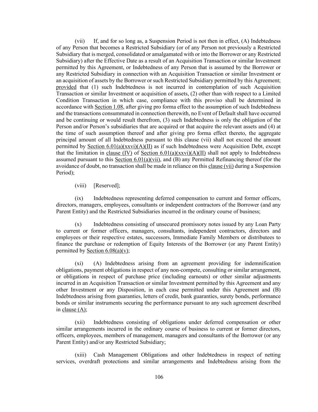 106 (vii) If, and for so long as, a Suspension Period is not then in effect, (A) Indebtedness of any Person that becomes a Restricted Subsidiary (or of any Person not previously a Restricted Subsidiary that is merged, consolidated or amalgamated with or into the Borrower or any Restricted Subsidiary) after the Effective Date as a result of an Acquisition Transaction or similar Investment permitted by this Agreement, or Indebtedness of any Person that is assumed by the Borrower or any Restricted Subsidiary in connection with an Acquisition Transaction or similar Investment or an acquisition of assets by the Borrower or such Restricted Subsidiary permitted by this Agreement; provided that (1) such Indebtedness is not incurred in contemplation of such Acquisition Transaction or similar Investment or acquisition of assets, (2) other than with respect to a Limited Condition Transaction in which case, compliance with this proviso shall be determined in accordance with Section 1.08, after giving pro forma effect to the assumption of such Indebtedness and the transactions consummated in connection therewith, no Event of Default shall have occurred and be continuing or would result therefrom, (3) such Indebtedness is only the obligation of the Person and/or Person’s subsidiaries that are acquired or that acquire the relevant assets and (4) at the time of such assumption thereof and after giving pro forma effect thereto, the aggregate principal amount of all Indebtedness pursuant to this clause (vii) shall not exceed the amount permitted by Section 6.01(a)(xxvi)(A)(II) as if such Indebtedness were Acquisition Debt, except that the limitation in clause (IV) of Section 6.01(a)(xxvi)(A)(II) shall not apply to Indebtedness assumed pursuant to this Section 6.01(a)(vii), and (B) any Permitted Refinancing thereof (for the avoidance of doubt, no transaction shall be made in reliance on this clause (vii) during a Suspension Period); (viii) [Reserved]; (ix) Indebtedness representing deferred compensation to current and former officers, directors, managers, employees, consultants or independent contractors of the Borrower (and any Parent Entity) and the Restricted Subsidiaries incurred in the ordinary course of business; (x) Indebtedness consisting of unsecured promissory notes issued by any Loan Party to current or former officers, managers, consultants, independent contractors, directors and employees or their respective estates, successors, Immediate Family Members or distributees to finance the purchase or redemption of Equity Interests of the Borrower (or any Parent Entity) permitted by Section 6.08(a)(v); (xi) (A) Indebtedness arising from an agreement providing for indemnification obligations, payment obligations in respect of any non-compete, consulting or similar arrangement, or obligations in respect of purchase price (including earnouts) or other similar adjustments incurred in an Acquisition Transaction or similar Investment permitted by this Agreement and any other Investment or any Disposition, in each case permitted under this Agreement and (B) Indebtedness arising from guaranties, letters of credit, bank guaranties, surety bonds, performance bonds or similar instruments securing the performance pursuant to any such agreement described in clause (A); (xii) Indebtedness consisting of obligations under deferred compensation or other similar arrangements incurred in the ordinary course of business to current or former directors, officers, employees, members of management, managers and consultants of the Borrower (or any Parent Entity) and/or any Restricted Subsidiary; (xiii) Cash Management Obligations and other Indebtedness in respect of netting services, overdraft protections and similar arrangements and Indebtedness arising from the