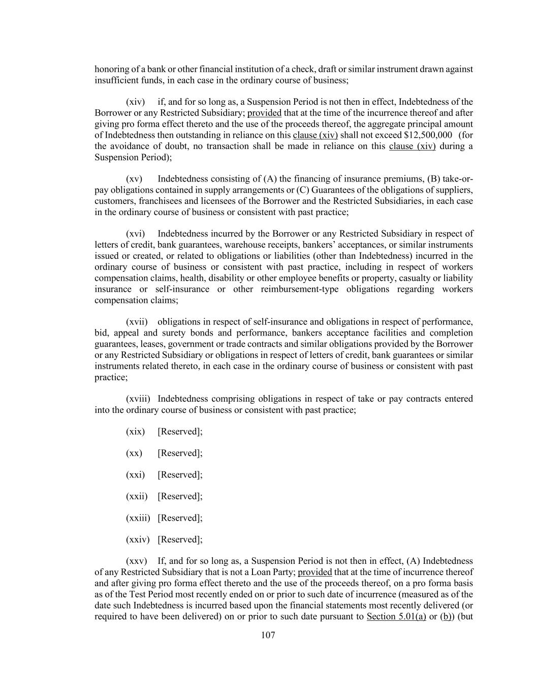 107 honoring of a bank or other financial institution of a check, draft or similar instrument drawn against insufficient funds, in each case in the ordinary course of business; (xiv) if, and for so long as, a Suspension Period is not then in effect, Indebtedness of the Borrower or any Restricted Subsidiary; provided that at the time of the incurrence thereof and after giving pro forma effect thereto and the use of the proceeds thereof, the aggregate principal amount of Indebtedness then outstanding in reliance on this clause (xiv) shall not exceed $12,500,000 (for the avoidance of doubt, no transaction shall be made in reliance on this clause (xiv) during a Suspension Period); (xv) Indebtedness consisting of (A) the financing of insurance premiums, (B) take-or- pay obligations contained in supply arrangements or (C) Guarantees of the obligations of suppliers, customers, franchisees and licensees of the Borrower and the Restricted Subsidiaries, in each case in the ordinary course of business or consistent with past practice; (xvi) Indebtedness incurred by the Borrower or any Restricted Subsidiary in respect of letters of credit, bank guarantees, warehouse receipts, bankers’ acceptances, or similar instruments issued or created, or related to obligations or liabilities (other than Indebtedness) incurred in the ordinary course of business or consistent with past practice, including in respect of workers compensation claims, health, disability or other employee benefits or property, casualty or liability insurance or self-insurance or other reimbursement-type obligations regarding workers compensation claims; (xvii) obligations in respect of self-insurance and obligations in respect of performance, bid, appeal and surety bonds and performance, bankers acceptance facilities and completion guarantees, leases, government or trade contracts and similar obligations provided by the Borrower or any Restricted Subsidiary or obligations in respect of letters of credit, bank guarantees or similar instruments related thereto, in each case in the ordinary course of business or consistent with past practice; (xviii) Indebtedness comprising obligations in respect of take or pay contracts entered into the ordinary course of business or consistent with past practice; (xix) [Reserved]; (xx) [Reserved]; (xxi) [Reserved]; (xxii) [Reserved]; (xxiii) [Reserved]; (xxiv) [Reserved]; (xxv) If, and for so long as, a Suspension Period is not then in effect, (A) Indebtedness of any Restricted Subsidiary that is not a Loan Party; provided that at the time of incurrence thereof and after giving pro forma effect thereto and the use of the proceeds thereof, on a pro forma basis as of the Test Period most recently ended on or prior to such date of incurrence (measured as of the date such Indebtedness is incurred based upon the financial statements most recently delivered (or required to have been delivered) on or prior to such date pursuant to Section 5.01(a) or (b)) (but