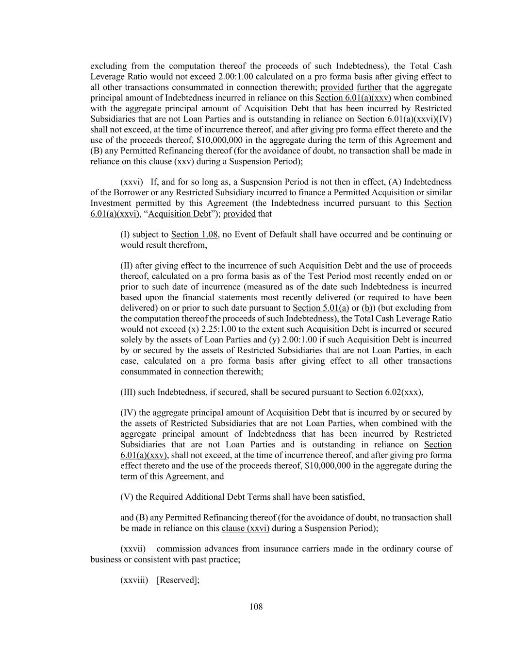 108 excluding from the computation thereof the proceeds of such Indebtedness), the Total Cash Leverage Ratio would not exceed 2.00:1.00 calculated on a pro forma basis after giving effect to all other transactions consummated in connection therewith; provided further that the aggregate principal amount of Indebtedness incurred in reliance on this Section 6.01(a)(xxv) when combined with the aggregate principal amount of Acquisition Debt that has been incurred by Restricted Subsidiaries that are not Loan Parties and is outstanding in reliance on Section 6.01(a)(xxvi)(IV) shall not exceed, at the time of incurrence thereof, and after giving pro forma effect thereto and the use of the proceeds thereof, $10,000,000 in the aggregate during the term of this Agreement and (B) any Permitted Refinancing thereof (for the avoidance of doubt, no transaction shall be made in reliance on this clause (xxv) during a Suspension Period); (xxvi) If, and for so long as, a Suspension Period is not then in effect, (A) Indebtedness of the Borrower or any Restricted Subsidiary incurred to finance a Permitted Acquisition or similar Investment permitted by this Agreement (the Indebtedness incurred pursuant to this Section 6.01(a)(xxvi), “Acquisition Debt”); provided that (I) subject to Section 1.08, no Event of Default shall have occurred and be continuing or would result therefrom, (II) after giving effect to the incurrence of such Acquisition Debt and the use of proceeds thereof, calculated on a pro forma basis as of the Test Period most recently ended on or prior to such date of incurrence (measured as of the date such Indebtedness is incurred based upon the financial statements most recently delivered (or required to have been delivered) on or prior to such date pursuant to Section 5.01(a) or (b)) (but excluding from the computation thereof the proceeds of such Indebtedness), the Total Cash Leverage Ratio would not exceed (x) 2.25:1.00 to the extent such Acquisition Debt is incurred or secured solely by the assets of Loan Parties and (y) 2.00:1.00 if such Acquisition Debt is incurred by or secured by the assets of Restricted Subsidiaries that are not Loan Parties, in each case, calculated on a pro forma basis after giving effect to all other transactions consummated in connection therewith; (III) such Indebtedness, if secured, shall be secured pursuant to Section 6.02(xxx), (IV) the aggregate principal amount of Acquisition Debt that is incurred by or secured by the assets of Restricted Subsidiaries that are not Loan Parties, when combined with the aggregate principal amount of Indebtedness that has been incurred by Restricted Subsidiaries that are not Loan Parties and is outstanding in reliance on Section 6.01(a)(xxv), shall not exceed, at the time of incurrence thereof, and after giving pro forma effect thereto and the use of the proceeds thereof, $10,000,000 in the aggregate during the term of this Agreement, and (V) the Required Additional Debt Terms shall have been satisfied, and (B) any Permitted Refinancing thereof (for the avoidance of doubt, no transaction shall be made in reliance on this clause (xxvi) during a Suspension Period); (xxvii) commission advances from insurance carriers made in the ordinary course of business or consistent with past practice; (xxviii) [Reserved];