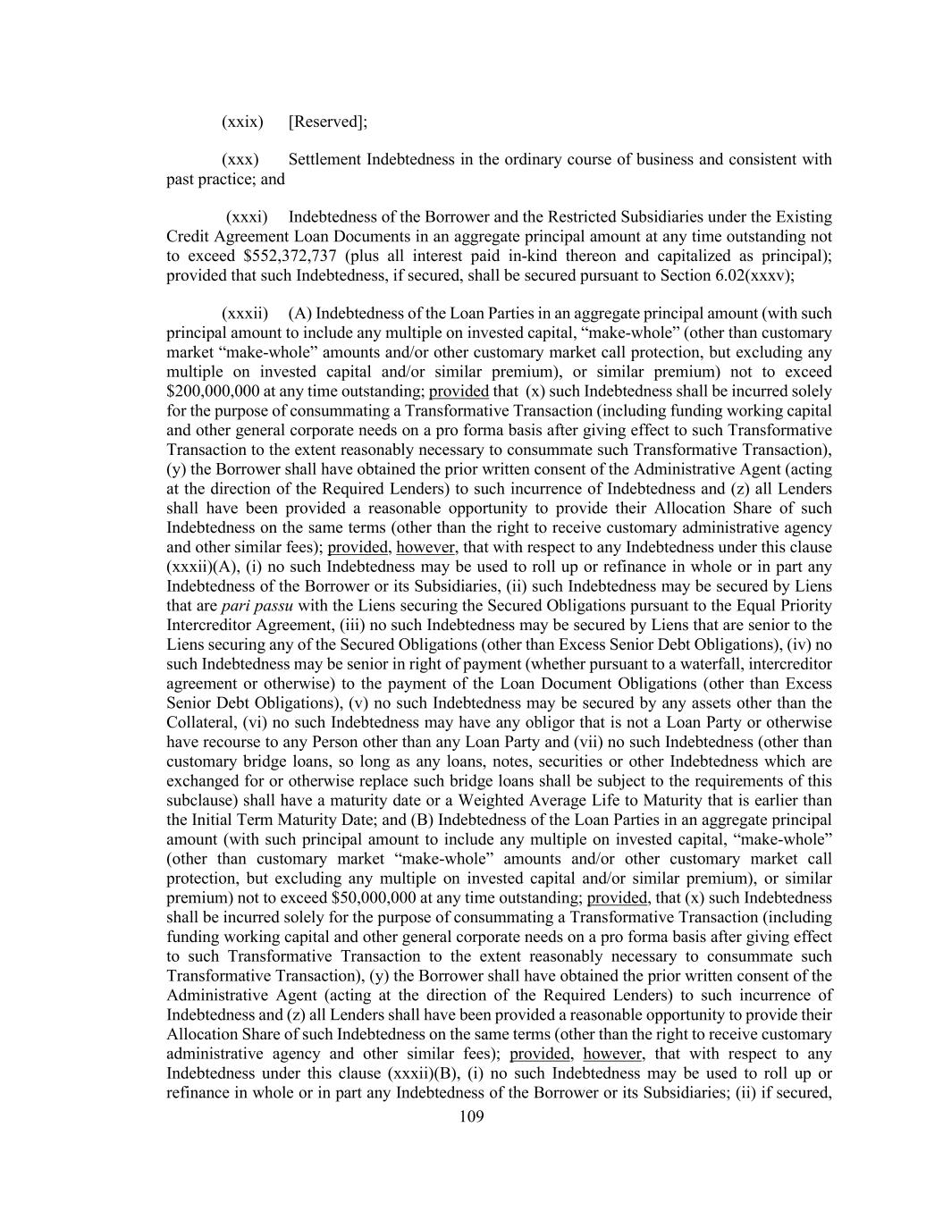109 (xxix) [Reserved]; (xxx) Settlement Indebtedness in the ordinary course of business and consistent with past practice; and (xxxi) Indebtedness of the Borrower and the Restricted Subsidiaries under the Existing Credit Agreement Loan Documents in an aggregate principal amount at any time outstanding not to exceed $552,372,737 (plus all interest paid in-kind thereon and capitalized as principal); provided that such Indebtedness, if secured, shall be secured pursuant to Section 6.02(xxxv); (xxxii) (A) Indebtedness of the Loan Parties in an aggregate principal amount (with such principal amount to include any multiple on invested capital, “make-whole” (other than customary market “make-whole” amounts and/or other customary market call protection, but excluding any multiple on invested capital and/or similar premium), or similar premium) not to exceed $200,000,000 at any time outstanding; provided that (x) such Indebtedness shall be incurred solely for the purpose of consummating a Transformative Transaction (including funding working capital and other general corporate needs on a pro forma basis after giving effect to such Transformative Transaction to the extent reasonably necessary to consummate such Transformative Transaction), (y) the Borrower shall have obtained the prior written consent of the Administrative Agent (acting at the direction of the Required Lenders) to such incurrence of Indebtedness and (z) all Lenders shall have been provided a reasonable opportunity to provide their Allocation Share of such Indebtedness on the same terms (other than the right to receive customary administrative agency and other similar fees); provided, however, that with respect to any Indebtedness under this clause (xxxii)(A), (i) no such Indebtedness may be used to roll up or refinance in whole or in part any Indebtedness of the Borrower or its Subsidiaries, (ii) such Indebtedness may be secured by Liens that are pari passu with the Liens securing the Secured Obligations pursuant to the Equal Priority Intercreditor Agreement, (iii) no such Indebtedness may be secured by Liens that are senior to the Liens securing any of the Secured Obligations (other than Excess Senior Debt Obligations), (iv) no such Indebtedness may be senior in right of payment (whether pursuant to a waterfall, intercreditor agreement or otherwise) to the payment of the Loan Document Obligations (other than Excess Senior Debt Obligations), (v) no such Indebtedness may be secured by any assets other than the Collateral, (vi) no such Indebtedness may have any obligor that is not a Loan Party or otherwise have recourse to any Person other than any Loan Party and (vii) no such Indebtedness (other than customary bridge loans, so long as any loans, notes, securities or other Indebtedness which are exchanged for or otherwise replace such bridge loans shall be subject to the requirements of this subclause) shall have a maturity date or a Weighted Average Life to Maturity that is earlier than the Initial Term Maturity Date; and (B) Indebtedness of the Loan Parties in an aggregate principal amount (with such principal amount to include any multiple on invested capital, “make-whole” (other than customary market “make-whole” amounts and/or other customary market call protection, but excluding any multiple on invested capital and/or similar premium), or similar premium) not to exceed $50,000,000 at any time outstanding; provided, that (x) such Indebtedness shall be incurred solely for the purpose of consummating a Transformative Transaction (including funding working capital and other general corporate needs on a pro forma basis after giving effect to such Transformative Transaction to the extent reasonably necessary to consummate such Transformative Transaction), (y) the Borrower shall have obtained the prior written consent of the Administrative Agent (acting at the direction of the Required Lenders) to such incurrence of Indebtedness and (z) all Lenders shall have been provided a reasonable opportunity to provide their Allocation Share of such Indebtedness on the same terms (other than the right to receive customary administrative agency and other similar fees); provided, however, that with respect to any Indebtedness under this clause (xxxii)(B), (i) no such Indebtedness may be used to roll up or refinance in whole or in part any Indebtedness of the Borrower or its Subsidiaries; (ii) if secured,