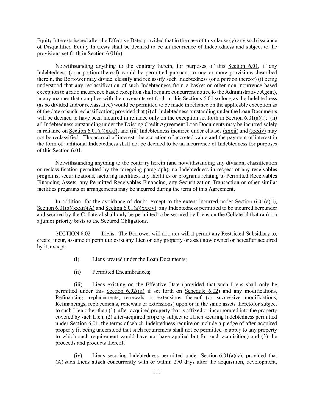 111 Equity Interests issued after the Effective Date; provided that in the case of this clause (y) any such issuance of Disqualified Equity Interests shall be deemed to be an incurrence of Indebtedness and subject to the provisions set forth in Section 6.01(a). Notwithstanding anything to the contrary herein, for purposes of this Section 6.01, if any Indebtedness (or a portion thereof) would be permitted pursuant to one or more provisions described therein, the Borrower may divide, classify and reclassify such Indebtedness (or a portion thereof) (it being understood that any reclassification of such Indebtedness from a basket or other non-incurrence based exception to a ratio incurrence based exception shall require concurrent notice to the Administrative Agent), in any manner that complies with the covenants set forth in this Sections 6.01 so long as the Indebtedness (as so divided and/or reclassified) would be permitted to be made in reliance on the applicable exception as of the date of such reclassification; provided that (i) all Indebtedness outstanding under the Loan Documents will be deemed to have been incurred in reliance only on the exception set forth in Section 6.01(a)(i); (ii) all Indebtedness outstanding under the Existing Credit Agreement Loan Documents may be incurred solely in reliance on Section 6.01(a)(xxxi); and (iii) Indebtedness incurred under clauses (xxxii) and (xxxiv) may not be reclassified. The accrual of interest, the accretion of accreted value and the payment of interest in the form of additional Indebtedness shall not be deemed to be an incurrence of Indebtedness for purposes of this Section 6.01. Notwithstanding anything to the contrary herein (and notwithstanding any division, classification or reclassification permitted by the foregoing paragraph), no Indebtedness in respect of any receivables programs, securitizations, factoring facilities, any facilities or programs relating to Permitted Receivables Financing Assets, any Permitted Receivables Financing, any Securitization Transaction or other similar facilities programs or arrangements may be incurred during the term of this Agreement. In addition, for the avoidance of doubt, except to the extent incurred under Section 6.01(a)(i), Section 6.01(a)(xxxii)(A) and Section 6.01(a)(xxxiv), any Indebtedness permitted to be incurred hereunder and secured by the Collateral shall only be permitted to be secured by Liens on the Collateral that rank on a junior priority basis to the Secured Obligations. SECTION 6.02 Liens. The Borrower will not, nor will it permit any Restricted Subsidiary to, create, incur, assume or permit to exist any Lien on any property or asset now owned or hereafter acquired by it, except: (i) Liens created under the Loan Documents; (ii) Permitted Encumbrances; (iii) Liens existing on the Effective Date (provided that such Liens shall only be permitted under this Section 6.02(iii) if set forth on Schedule 6.02) and any modifications, Refinancing, replacements, renewals or extensions thereof (or successive modifications, Refinancings, replacements, renewals or extensions) upon or in the same assets theretofor subject to such Lien other than (1) after-acquired property that is affixed or incorporated into the property covered by such Lien, (2) after-acquired property subject to a Lien securing Indebtedness permitted under Section 6.01, the terms of which Indebtedness require or include a pledge of after-acquired property (it being understood that such requirement shall not be permitted to apply to any property to which such requirement would have not have applied but for such acquisition) and (3) the proceeds and products thereof; (iv) Liens securing Indebtedness permitted under Section 6.01(a)(v); provided that (A) such Liens attach concurrently with or within 270 days after the acquisition, development,