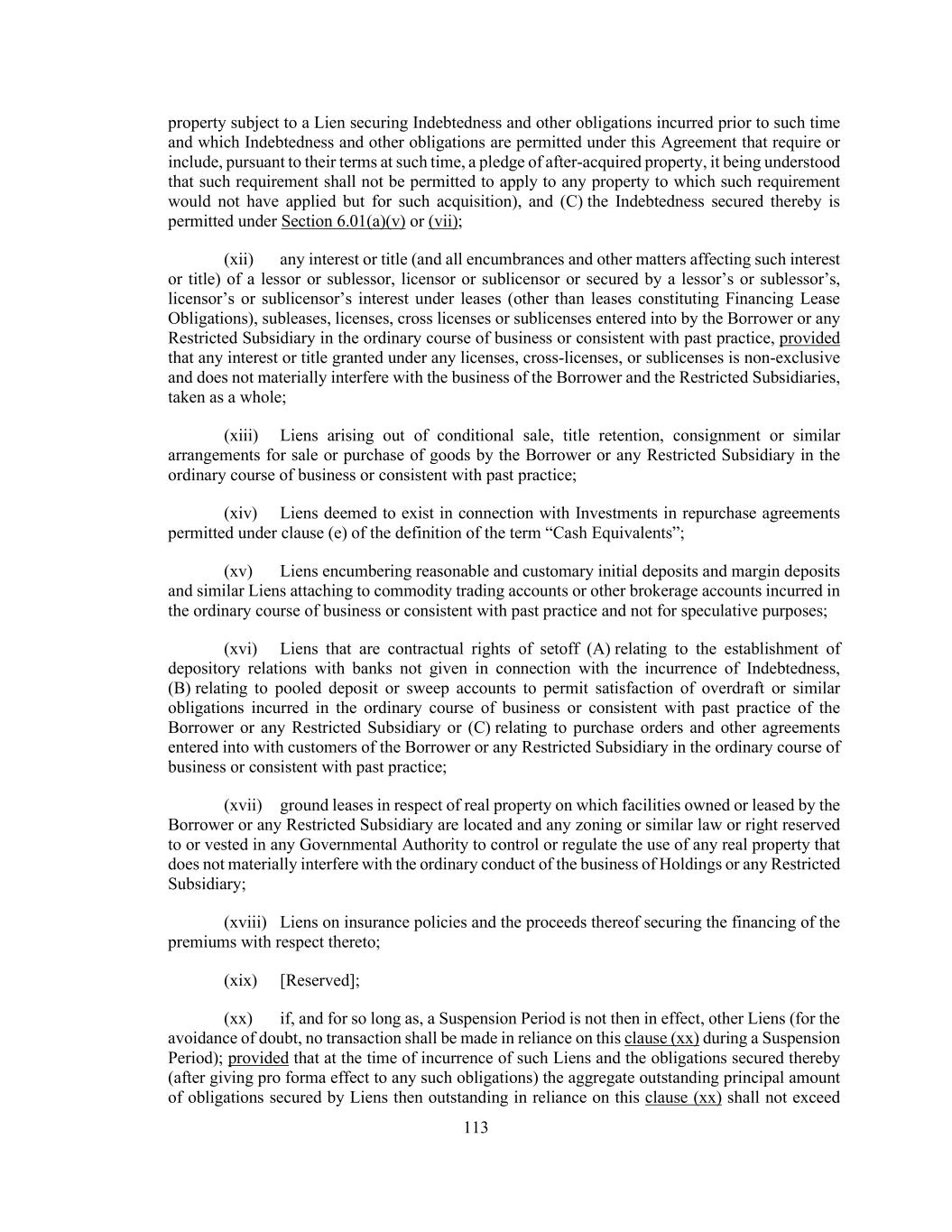 113 property subject to a Lien securing Indebtedness and other obligations incurred prior to such time and which Indebtedness and other obligations are permitted under this Agreement that require or include, pursuant to their terms at such time, a pledge of after-acquired property, it being understood that such requirement shall not be permitted to apply to any property to which such requirement would not have applied but for such acquisition), and (C) the Indebtedness secured thereby is permitted under Section 6.01(a)(v) or (vii); (xii) any interest or title (and all encumbrances and other matters affecting such interest or title) of a lessor or sublessor, licensor or sublicensor or secured by a lessor’s or sublessor’s, licensor’s or sublicensor’s interest under leases (other than leases constituting Financing Lease Obligations), subleases, licenses, cross licenses or sublicenses entered into by the Borrower or any Restricted Subsidiary in the ordinary course of business or consistent with past practice, provided that any interest or title granted under any licenses, cross-licenses, or sublicenses is non-exclusive and does not materially interfere with the business of the Borrower and the Restricted Subsidiaries, taken as a whole; (xiii) Liens arising out of conditional sale, title retention, consignment or similar arrangements for sale or purchase of goods by the Borrower or any Restricted Subsidiary in the ordinary course of business or consistent with past practice; (xiv) Liens deemed to exist in connection with Investments in repurchase agreements permitted under clause (e) of the definition of the term “Cash Equivalents”; (xv) Liens encumbering reasonable and customary initial deposits and margin deposits and similar Liens attaching to commodity trading accounts or other brokerage accounts incurred in the ordinary course of business or consistent with past practice and not for speculative purposes; (xvi) Liens that are contractual rights of setoff (A) relating to the establishment of depository relations with banks not given in connection with the incurrence of Indebtedness, (B) relating to pooled deposit or sweep accounts to permit satisfaction of overdraft or similar obligations incurred in the ordinary course of business or consistent with past practice of the Borrower or any Restricted Subsidiary or (C) relating to purchase orders and other agreements entered into with customers of the Borrower or any Restricted Subsidiary in the ordinary course of business or consistent with past practice; (xvii) ground leases in respect of real property on which facilities owned or leased by the Borrower or any Restricted Subsidiary are located and any zoning or similar law or right reserved to or vested in any Governmental Authority to control or regulate the use of any real property that does not materially interfere with the ordinary conduct of the business of Holdings or any Restricted Subsidiary; (xviii) Liens on insurance policies and the proceeds thereof securing the financing of the premiums with respect thereto; (xix) [Reserved]; (xx) if, and for so long as, a Suspension Period is not then in effect, other Liens (for the avoidance of doubt, no transaction shall be made in reliance on this clause (xx) during a Suspension Period); provided that at the time of incurrence of such Liens and the obligations secured thereby (after giving pro forma effect to any such obligations) the aggregate outstanding principal amount of obligations secured by Liens then outstanding in reliance on this clause (xx) shall not exceed
