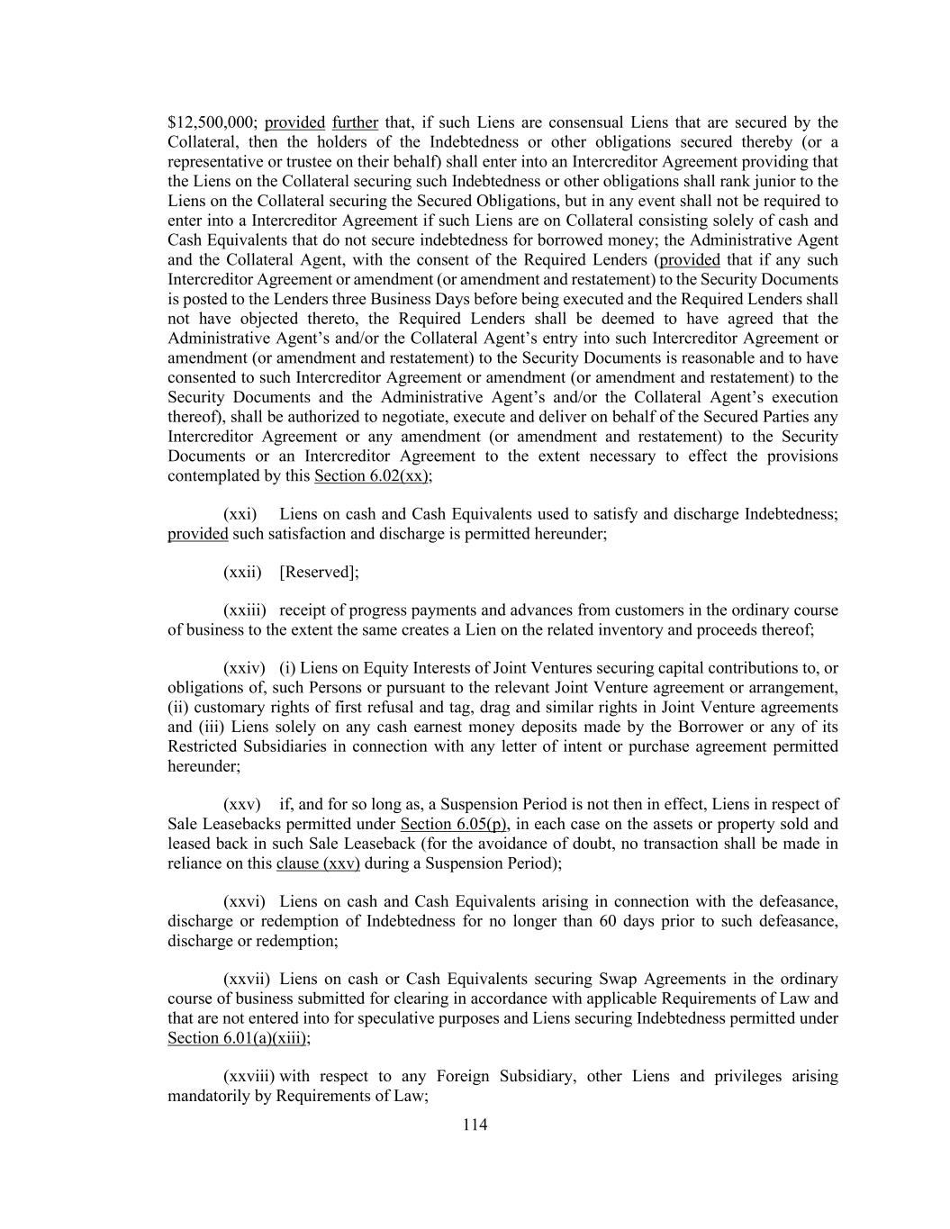 114 $12,500,000; provided further that, if such Liens are consensual Liens that are secured by the Collateral, then the holders of the Indebtedness or other obligations secured thereby (or a representative or trustee on their behalf) shall enter into an Intercreditor Agreement providing that the Liens on the Collateral securing such Indebtedness or other obligations shall rank junior to the Liens on the Collateral securing the Secured Obligations, but in any event shall not be required to enter into a Intercreditor Agreement if such Liens are on Collateral consisting solely of cash and Cash Equivalents that do not secure indebtedness for borrowed money; the Administrative Agent and the Collateral Agent, with the consent of the Required Lenders (provided that if any such Intercreditor Agreement or amendment (or amendment and restatement) to the Security Documents is posted to the Lenders three Business Days before being executed and the Required Lenders shall not have objected thereto, the Required Lenders shall be deemed to have agreed that the Administrative Agent’s and/or the Collateral Agent’s entry into such Intercreditor Agreement or amendment (or amendment and restatement) to the Security Documents is reasonable and to have consented to such Intercreditor Agreement or amendment (or amendment and restatement) to the Security Documents and the Administrative Agent’s and/or the Collateral Agent’s execution thereof), shall be authorized to negotiate, execute and deliver on behalf of the Secured Parties any Intercreditor Agreement or any amendment (or amendment and restatement) to the Security Documents or an Intercreditor Agreement to the extent necessary to effect the provisions contemplated by this Section 6.02(xx); (xxi) Liens on cash and Cash Equivalents used to satisfy and discharge Indebtedness; provided such satisfaction and discharge is permitted hereunder; (xxii) [Reserved]; (xxiii) receipt of progress payments and advances from customers in the ordinary course of business to the extent the same creates a Lien on the related inventory and proceeds thereof; (xxiv) (i) Liens on Equity Interests of Joint Ventures securing capital contributions to, or obligations of, such Persons or pursuant to the relevant Joint Venture agreement or arrangement, (ii) customary rights of first refusal and tag, drag and similar rights in Joint Venture agreements and (iii) Liens solely on any cash earnest money deposits made by the Borrower or any of its Restricted Subsidiaries in connection with any letter of intent or purchase agreement permitted hereunder; (xxv) if, and for so long as, a Suspension Period is not then in effect, Liens in respect of Sale Leasebacks permitted under Section 6.05(p), in each case on the assets or property sold and leased back in such Sale Leaseback (for the avoidance of doubt, no transaction shall be made in reliance on this clause (xxv) during a Suspension Period); (xxvi) Liens on cash and Cash Equivalents arising in connection with the defeasance, discharge or redemption of Indebtedness for no longer than 60 days prior to such defeasance, discharge or redemption; (xxvii) Liens on cash or Cash Equivalents securing Swap Agreements in the ordinary course of business submitted for clearing in accordance with applicable Requirements of Law and that are not entered into for speculative purposes and Liens securing Indebtedness permitted under Section 6.01(a)(xiii); (xxviii) with respect to any Foreign Subsidiary, other Liens and privileges arising mandatorily by Requirements of Law;