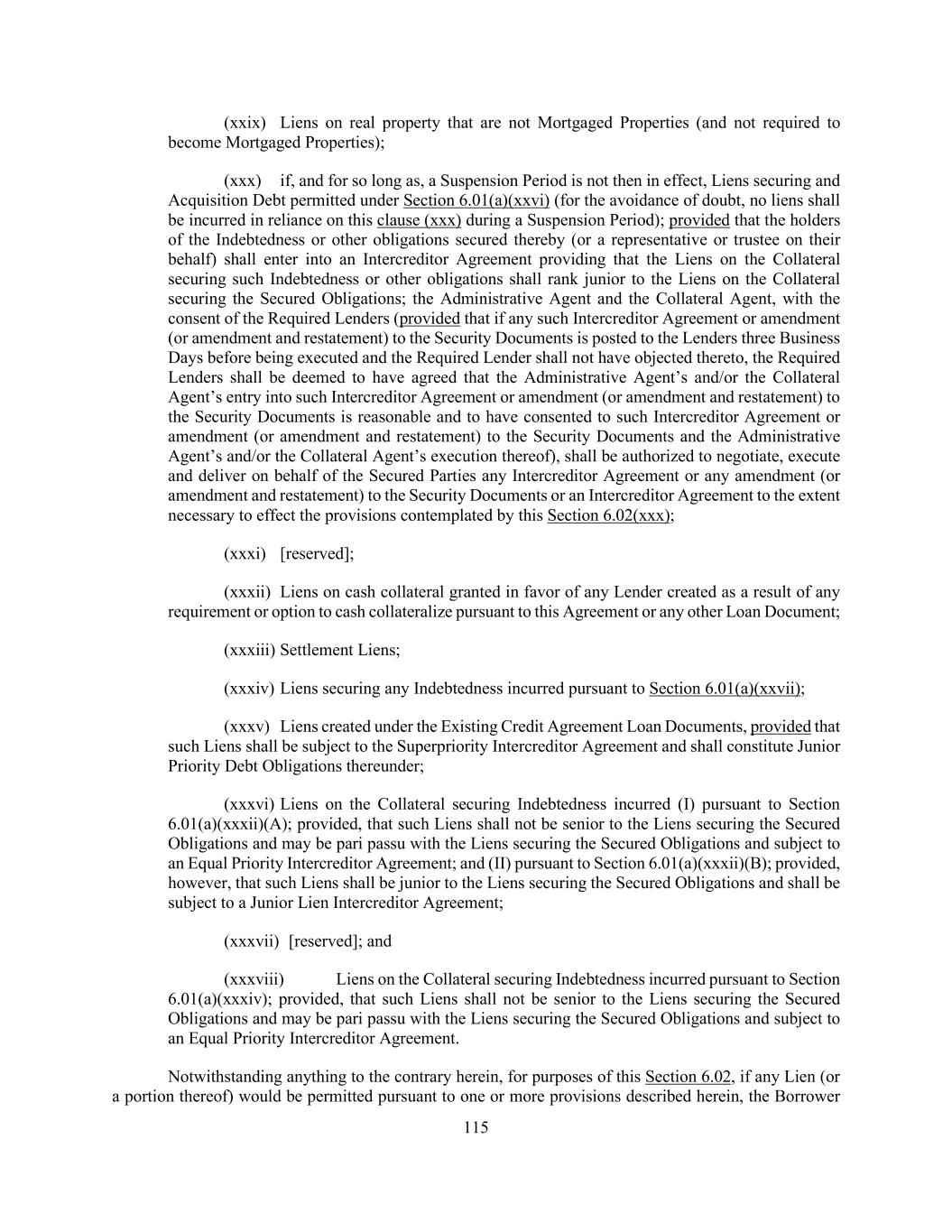 115 (xxix) Liens on real property that are not Mortgaged Properties (and not required to become Mortgaged Properties); (xxx) if, and for so long as, a Suspension Period is not then in effect, Liens securing and Acquisition Debt permitted under Section 6.01(a)(xxvi) (for the avoidance of doubt, no liens shall be incurred in reliance on this clause (xxx) during a Suspension Period); provided that the holders of the Indebtedness or other obligations secured thereby (or a representative or trustee on their behalf) shall enter into an Intercreditor Agreement providing that the Liens on the Collateral securing such Indebtedness or other obligations shall rank junior to the Liens on the Collateral securing the Secured Obligations; the Administrative Agent and the Collateral Agent, with the consent of the Required Lenders (provided that if any such Intercreditor Agreement or amendment (or amendment and restatement) to the Security Documents is posted to the Lenders three Business Days before being executed and the Required Lender shall not have objected thereto, the Required Lenders shall be deemed to have agreed that the Administrative Agent’s and/or the Collateral Agent’s entry into such Intercreditor Agreement or amendment (or amendment and restatement) to the Security Documents is reasonable and to have consented to such Intercreditor Agreement or amendment (or amendment and restatement) to the Security Documents and the Administrative Agent’s and/or the Collateral Agent’s execution thereof), shall be authorized to negotiate, execute and deliver on behalf of the Secured Parties any Intercreditor Agreement or any amendment (or amendment and restatement) to the Security Documents or an Intercreditor Agreement to the extent necessary to effect the provisions contemplated by this Section 6.02(xxx); (xxxi) [reserved]; (xxxii) Liens on cash collateral granted in favor of any Lender created as a result of any requirement or option to cash collateralize pursuant to this Agreement or any other Loan Document; (xxxiii) Settlement Liens; (xxxiv) Liens securing any Indebtedness incurred pursuant to Section 6.01(a)(xxvii); (xxxv) Liens created under the Existing Credit Agreement Loan Documents, provided that such Liens shall be subject to the Superpriority Intercreditor Agreement and shall constitute Junior Priority Debt Obligations thereunder; (xxxvi) Liens on the Collateral securing Indebtedness incurred (I) pursuant to Section 6.01(a)(xxxii)(A); provided, that such Liens shall not be senior to the Liens securing the Secured Obligations and may be pari passu with the Liens securing the Secured Obligations and subject to an Equal Priority Intercreditor Agreement; and (II) pursuant to Section 6.01(a)(xxxii)(B); provided, however, that such Liens shall be junior to the Liens securing the Secured Obligations and shall be subject to a Junior Lien Intercreditor Agreement; (xxxvii) [reserved]; and (xxxviii) Liens on the Collateral securing Indebtedness incurred pursuant to Section 6.01(a)(xxxiv); provided, that such Liens shall not be senior to the Liens securing the Secured Obligations and may be pari passu with the Liens securing the Secured Obligations and subject to an Equal Priority Intercreditor Agreement. Notwithstanding anything to the contrary herein, for purposes of this Section 6.02, if any Lien (or a portion thereof) would be permitted pursuant to one or more provisions described herein, the Borrower