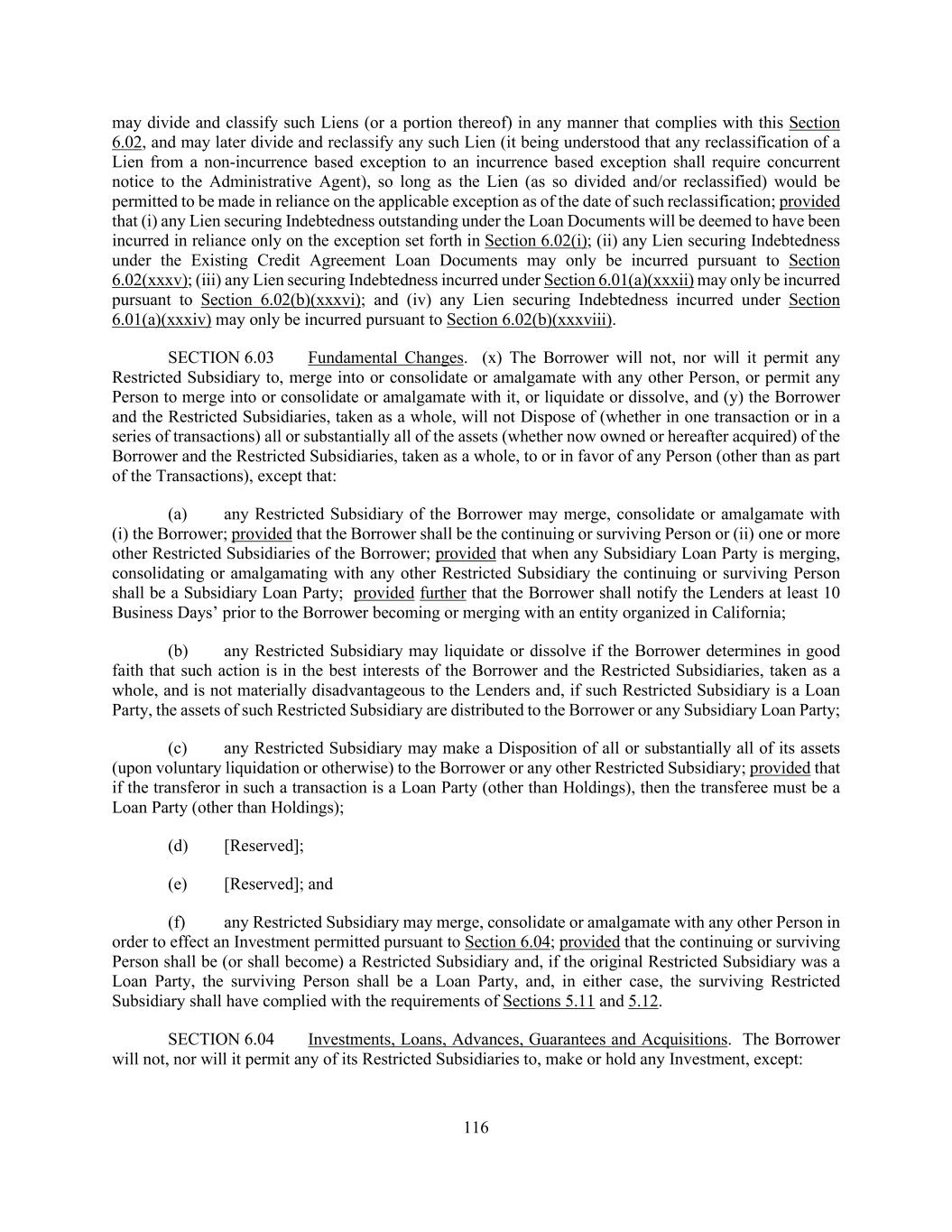 116 may divide and classify such Liens (or a portion thereof) in any manner that complies with this Section 6.02, and may later divide and reclassify any such Lien (it being understood that any reclassification of a Lien from a non-incurrence based exception to an incurrence based exception shall require concurrent notice to the Administrative Agent), so long as the Lien (as so divided and/or reclassified) would be permitted to be made in reliance on the applicable exception as of the date of such reclassification; provided that (i) any Lien securing Indebtedness outstanding under the Loan Documents will be deemed to have been incurred in reliance only on the exception set forth in Section 6.02(i); (ii) any Lien securing Indebtedness under the Existing Credit Agreement Loan Documents may only be incurred pursuant to Section 6.02(xxxv); (iii) any Lien securing Indebtedness incurred under Section 6.01(a)(xxxii) may only be incurred pursuant to Section 6.02(b)(xxxvi); and (iv) any Lien securing Indebtedness incurred under Section 6.01(a)(xxxiv) may only be incurred pursuant to Section 6.02(b)(xxxviii). SECTION 6.03 Fundamental Changes. (x) The Borrower will not, nor will it permit any Restricted Subsidiary to, merge into or consolidate or amalgamate with any other Person, or permit any Person to merge into or consolidate or amalgamate with it, or liquidate or dissolve, and (y) the Borrower and the Restricted Subsidiaries, taken as a whole, will not Dispose of (whether in one transaction or in a series of transactions) all or substantially all of the assets (whether now owned or hereafter acquired) of the Borrower and the Restricted Subsidiaries, taken as a whole, to or in favor of any Person (other than as part of the Transactions), except that: (a) any Restricted Subsidiary of the Borrower may merge, consolidate or amalgamate with (i) the Borrower; provided that the Borrower shall be the continuing or surviving Person or (ii) one or more other Restricted Subsidiaries of the Borrower; provided that when any Subsidiary Loan Party is merging, consolidating or amalgamating with any other Restricted Subsidiary the continuing or surviving Person shall be a Subsidiary Loan Party; provided further that the Borrower shall notify the Lenders at least 10 Business Days’ prior to the Borrower becoming or merging with an entity organized in California; (b) any Restricted Subsidiary may liquidate or dissolve if the Borrower determines in good faith that such action is in the best interests of the Borrower and the Restricted Subsidiaries, taken as a whole, and is not materially disadvantageous to the Lenders and, if such Restricted Subsidiary is a Loan Party, the assets of such Restricted Subsidiary are distributed to the Borrower or any Subsidiary Loan Party; (c) any Restricted Subsidiary may make a Disposition of all or substantially all of its assets (upon voluntary liquidation or otherwise) to the Borrower or any other Restricted Subsidiary; provided that if the transferor in such a transaction is a Loan Party (other than Holdings), then the transferee must be a Loan Party (other than Holdings); (d) [Reserved]; (e) [Reserved]; and (f) any Restricted Subsidiary may merge, consolidate or amalgamate with any other Person in order to effect an Investment permitted pursuant to Section 6.04; provided that the continuing or surviving Person shall be (or shall become) a Restricted Subsidiary and, if the original Restricted Subsidiary was a Loan Party, the surviving Person shall be a Loan Party, and, in either case, the surviving Restricted Subsidiary shall have complied with the requirements of Sections 5.11 and 5.12. SECTION 6.04 Investments, Loans, Advances, Guarantees and Acquisitions. The Borrower will not, nor will it permit any of its Restricted Subsidiaries to, make or hold any Investment, except: