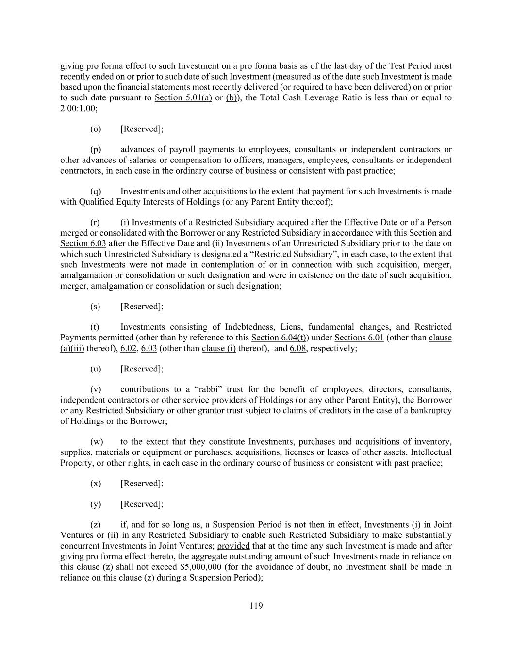 119 giving pro forma effect to such Investment on a pro forma basis as of the last day of the Test Period most recently ended on or prior to such date of such Investment (measured as of the date such Investment is made based upon the financial statements most recently delivered (or required to have been delivered) on or prior to such date pursuant to Section 5.01(a) or (b)), the Total Cash Leverage Ratio is less than or equal to 2.00:1.00; (o) [Reserved]; (p) advances of payroll payments to employees, consultants or independent contractors or other advances of salaries or compensation to officers, managers, employees, consultants or independent contractors, in each case in the ordinary course of business or consistent with past practice; (q) Investments and other acquisitions to the extent that payment for such Investments is made with Qualified Equity Interests of Holdings (or any Parent Entity thereof); (r) (i) Investments of a Restricted Subsidiary acquired after the Effective Date or of a Person merged or consolidated with the Borrower or any Restricted Subsidiary in accordance with this Section and Section 6.03 after the Effective Date and (ii) Investments of an Unrestricted Subsidiary prior to the date on which such Unrestricted Subsidiary is designated a “Restricted Subsidiary”, in each case, to the extent that such Investments were not made in contemplation of or in connection with such acquisition, merger, amalgamation or consolidation or such designation and were in existence on the date of such acquisition, merger, amalgamation or consolidation or such designation; (s) [Reserved]; (t) Investments consisting of Indebtedness, Liens, fundamental changes, and Restricted Payments permitted (other than by reference to this Section 6.04(t)) under Sections 6.01 (other than clause (a)(iii) thereof), 6.02, 6.03 (other than clause (i) thereof), and 6.08, respectively; (u) [Reserved]; (v) contributions to a “rabbi” trust for the benefit of employees, directors, consultants, independent contractors or other service providers of Holdings (or any other Parent Entity), the Borrower or any Restricted Subsidiary or other grantor trust subject to claims of creditors in the case of a bankruptcy of Holdings or the Borrower; (w) to the extent that they constitute Investments, purchases and acquisitions of inventory, supplies, materials or equipment or purchases, acquisitions, licenses or leases of other assets, Intellectual Property, or other rights, in each case in the ordinary course of business or consistent with past practice; (x) [Reserved]; (y) [Reserved]; (z) if, and for so long as, a Suspension Period is not then in effect, Investments (i) in Joint Ventures or (ii) in any Restricted Subsidiary to enable such Restricted Subsidiary to make substantially concurrent Investments in Joint Ventures; provided that at the time any such Investment is made and after giving pro forma effect thereto, the aggregate outstanding amount of such Investments made in reliance on this clause (z) shall not exceed $5,000,000 (for the avoidance of doubt, no Investment shall be made in reliance on this clause (z) during a Suspension Period);