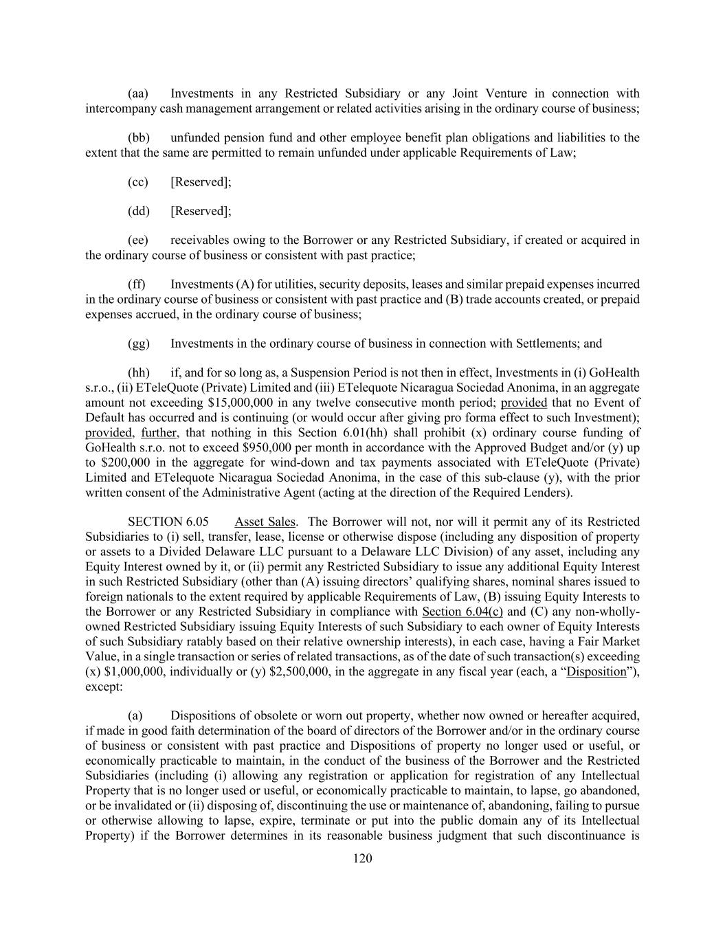 120 (aa) Investments in any Restricted Subsidiary or any Joint Venture in connection with intercompany cash management arrangement or related activities arising in the ordinary course of business; (bb) unfunded pension fund and other employee benefit plan obligations and liabilities to the extent that the same are permitted to remain unfunded under applicable Requirements of Law; (cc) [Reserved]; (dd) [Reserved]; (ee) receivables owing to the Borrower or any Restricted Subsidiary, if created or acquired in the ordinary course of business or consistent with past practice; (ff) Investments (A) for utilities, security deposits, leases and similar prepaid expenses incurred in the ordinary course of business or consistent with past practice and (B) trade accounts created, or prepaid expenses accrued, in the ordinary course of business; (gg) Investments in the ordinary course of business in connection with Settlements; and (hh) if, and for so long as, a Suspension Period is not then in effect, Investments in (i) GoHealth s.r.o., (ii) ETeleQuote (Private) Limited and (iii) ETelequote Nicaragua Sociedad Anonima, in an aggregate amount not exceeding $15,000,000 in any twelve consecutive month period; provided that no Event of Default has occurred and is continuing (or would occur after giving pro forma effect to such Investment); provided, further, that nothing in this Section 6.01(hh) shall prohibit (x) ordinary course funding of GoHealth s.r.o. not to exceed $950,000 per month in accordance with the Approved Budget and/or (y) up to $200,000 in the aggregate for wind-down and tax payments associated with ETeleQuote (Private) Limited and ETelequote Nicaragua Sociedad Anonima, in the case of this sub-clause (y), with the prior written consent of the Administrative Agent (acting at the direction of the Required Lenders). SECTION 6.05 Asset Sales. The Borrower will not, nor will it permit any of its Restricted Subsidiaries to (i) sell, transfer, lease, license or otherwise dispose (including any disposition of property or assets to a Divided Delaware LLC pursuant to a Delaware LLC Division) of any asset, including any Equity Interest owned by it, or (ii) permit any Restricted Subsidiary to issue any additional Equity Interest in such Restricted Subsidiary (other than (A) issuing directors’ qualifying shares, nominal shares issued to foreign nationals to the extent required by applicable Requirements of Law, (B) issuing Equity Interests to the Borrower or any Restricted Subsidiary in compliance with Section 6.04(c) and (C) any non-wholly- owned Restricted Subsidiary issuing Equity Interests of such Subsidiary to each owner of Equity Interests of such Subsidiary ratably based on their relative ownership interests), in each case, having a Fair Market Value, in a single transaction or series of related transactions, as of the date of such transaction(s) exceeding (x) $1,000,000, individually or (y) $2,500,000, in the aggregate in any fiscal year (each, a “Disposition”), except: (a) Dispositions of obsolete or worn out property, whether now owned or hereafter acquired, if made in good faith determination of the board of directors of the Borrower and/or in the ordinary course of business or consistent with past practice and Dispositions of property no longer used or useful, or economically practicable to maintain, in the conduct of the business of the Borrower and the Restricted Subsidiaries (including (i) allowing any registration or application for registration of any Intellectual Property that is no longer used or useful, or economically practicable to maintain, to lapse, go abandoned, or be invalidated or (ii) disposing of, discontinuing the use or maintenance of, abandoning, failing to pursue or otherwise allowing to lapse, expire, terminate or put into the public domain any of its Intellectual Property) if the Borrower determines in its reasonable business judgment that such discontinuance is