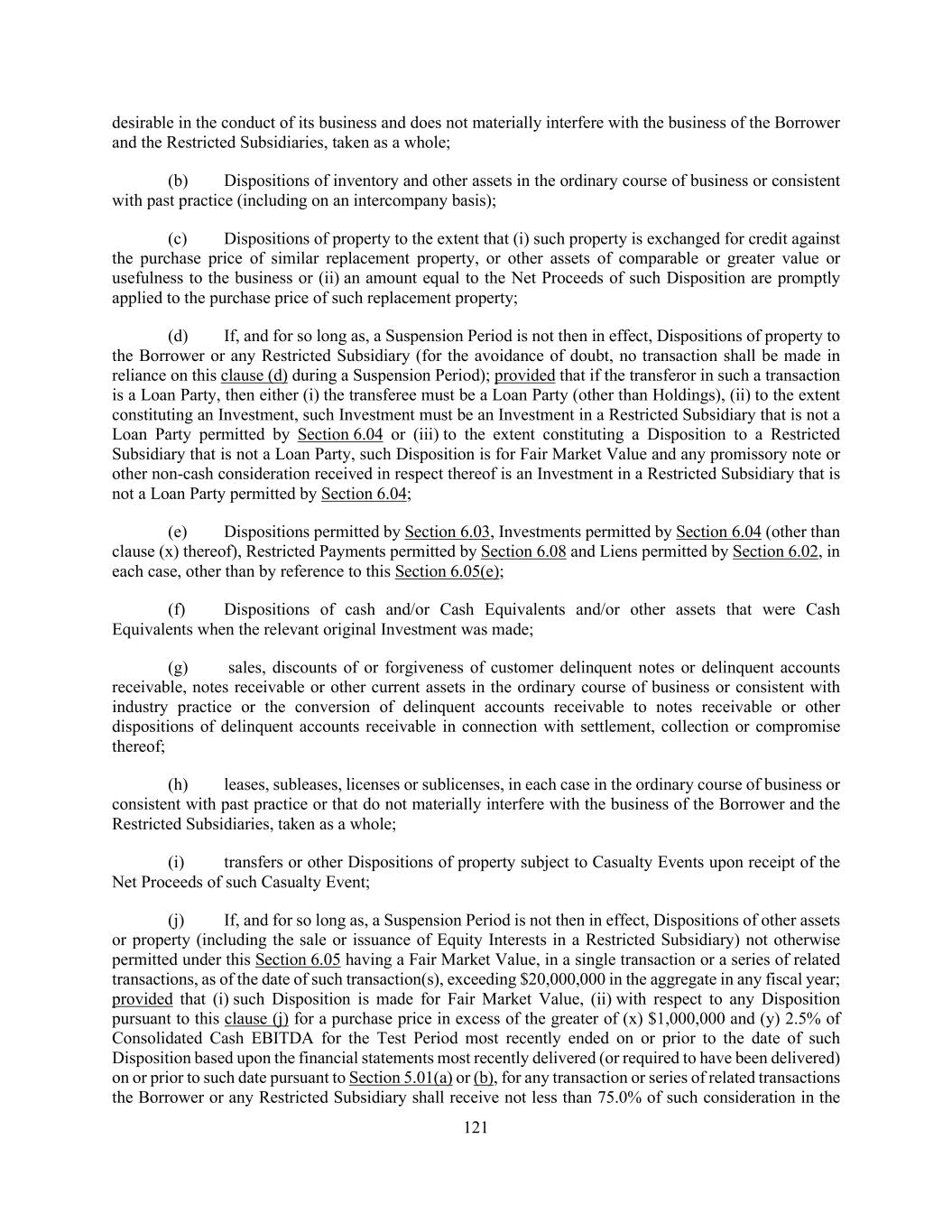 121 desirable in the conduct of its business and does not materially interfere with the business of the Borrower and the Restricted Subsidiaries, taken as a whole; (b) Dispositions of inventory and other assets in the ordinary course of business or consistent with past practice (including on an intercompany basis); (c) Dispositions of property to the extent that (i) such property is exchanged for credit against the purchase price of similar replacement property, or other assets of comparable or greater value or usefulness to the business or (ii) an amount equal to the Net Proceeds of such Disposition are promptly applied to the purchase price of such replacement property; (d) If, and for so long as, a Suspension Period is not then in effect, Dispositions of property to the Borrower or any Restricted Subsidiary (for the avoidance of doubt, no transaction shall be made in reliance on this clause (d) during a Suspension Period); provided that if the transferor in such a transaction is a Loan Party, then either (i) the transferee must be a Loan Party (other than Holdings), (ii) to the extent constituting an Investment, such Investment must be an Investment in a Restricted Subsidiary that is not a Loan Party permitted by Section 6.04 or (iii) to the extent constituting a Disposition to a Restricted Subsidiary that is not a Loan Party, such Disposition is for Fair Market Value and any promissory note or other non-cash consideration received in respect thereof is an Investment in a Restricted Subsidiary that is not a Loan Party permitted by Section 6.04; (e) Dispositions permitted by Section 6.03, Investments permitted by Section 6.04 (other than clause (x) thereof), Restricted Payments permitted by Section 6.08 and Liens permitted by Section 6.02, in each case, other than by reference to this Section 6.05(e); (f) Dispositions of cash and/or Cash Equivalents and/or other assets that were Cash Equivalents when the relevant original Investment was made; (g) sales, discounts of or forgiveness of customer delinquent notes or delinquent accounts receivable, notes receivable or other current assets in the ordinary course of business or consistent with industry practice or the conversion of delinquent accounts receivable to notes receivable or other dispositions of delinquent accounts receivable in connection with settlement, collection or compromise thereof; (h) leases, subleases, licenses or sublicenses, in each case in the ordinary course of business or consistent with past practice or that do not materially interfere with the business of the Borrower and the Restricted Subsidiaries, taken as a whole; (i) transfers or other Dispositions of property subject to Casualty Events upon receipt of the Net Proceeds of such Casualty Event; (j) If, and for so long as, a Suspension Period is not then in effect, Dispositions of other assets or property (including the sale or issuance of Equity Interests in a Restricted Subsidiary) not otherwise permitted under this Section 6.05 having a Fair Market Value, in a single transaction or a series of related transactions, as of the date of such transaction(s), exceeding $20,000,000 in the aggregate in any fiscal year; provided that (i) such Disposition is made for Fair Market Value, (ii) with respect to any Disposition pursuant to this clause (j) for a purchase price in excess of the greater of (x) $1,000,000 and (y) 2.5% of Consolidated Cash EBITDA for the Test Period most recently ended on or prior to the date of such Disposition based upon the financial statements most recently delivered (or required to have been delivered) on or prior to such date pursuant to Section 5.01(a) or (b), for any transaction or series of related transactions the Borrower or any Restricted Subsidiary shall receive not less than 75.0% of such consideration in the
