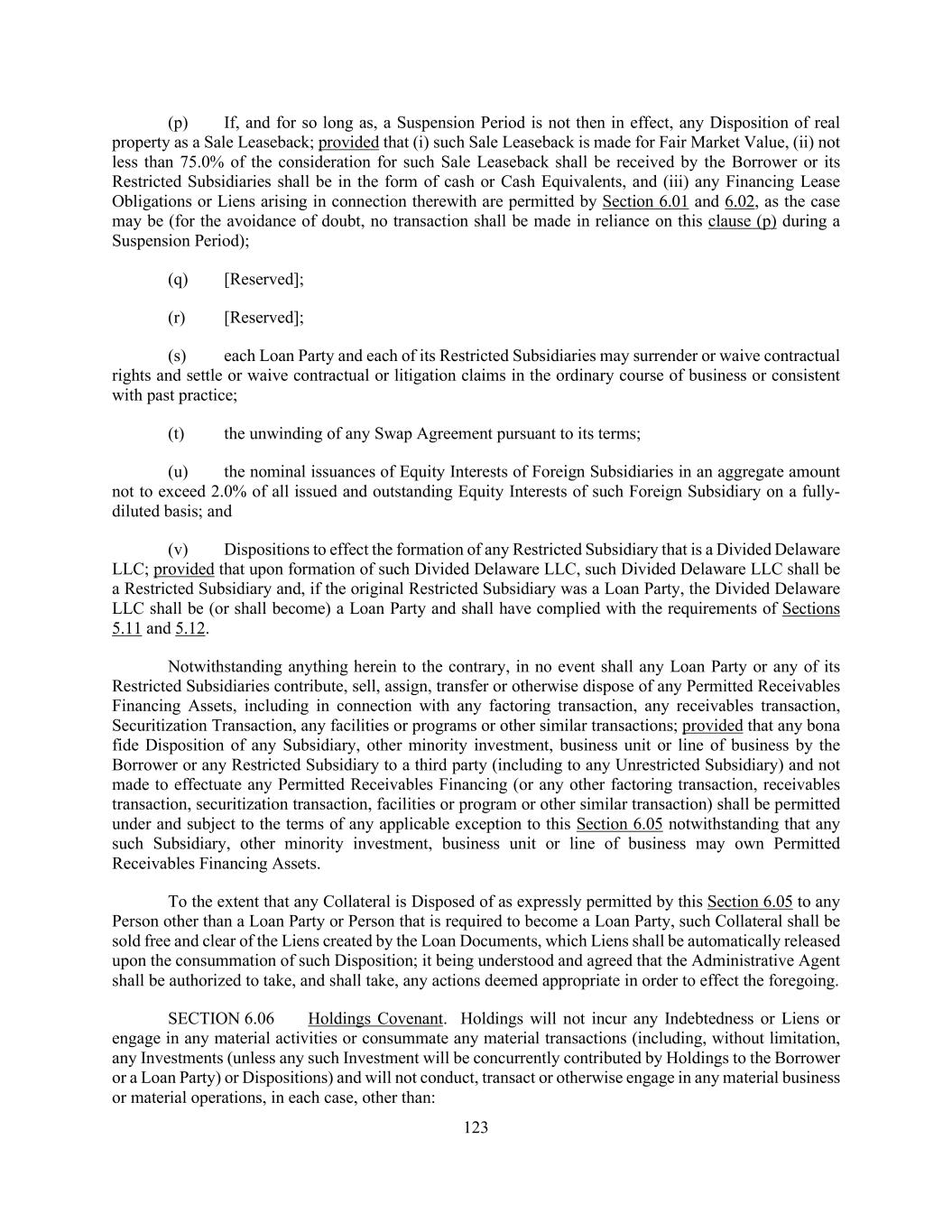 123 (p) If, and for so long as, a Suspension Period is not then in effect, any Disposition of real property as a Sale Leaseback; provided that (i) such Sale Leaseback is made for Fair Market Value, (ii) not less than 75.0% of the consideration for such Sale Leaseback shall be received by the Borrower or its Restricted Subsidiaries shall be in the form of cash or Cash Equivalents, and (iii) any Financing Lease Obligations or Liens arising in connection therewith are permitted by Section 6.01 and 6.02, as the case may be (for the avoidance of doubt, no transaction shall be made in reliance on this clause (p) during a Suspension Period); (q) [Reserved]; (r) [Reserved]; (s) each Loan Party and each of its Restricted Subsidiaries may surrender or waive contractual rights and settle or waive contractual or litigation claims in the ordinary course of business or consistent with past practice; (t) the unwinding of any Swap Agreement pursuant to its terms; (u) the nominal issuances of Equity Interests of Foreign Subsidiaries in an aggregate amount not to exceed 2.0% of all issued and outstanding Equity Interests of such Foreign Subsidiary on a fully- diluted basis; and (v) Dispositions to effect the formation of any Restricted Subsidiary that is a Divided Delaware LLC; provided that upon formation of such Divided Delaware LLC, such Divided Delaware LLC shall be a Restricted Subsidiary and, if the original Restricted Subsidiary was a Loan Party, the Divided Delaware LLC shall be (or shall become) a Loan Party and shall have complied with the requirements of Sections 5.11 and 5.12. Notwithstanding anything herein to the contrary, in no event shall any Loan Party or any of its Restricted Subsidiaries contribute, sell, assign, transfer or otherwise dispose of any Permitted Receivables Financing Assets, including in connection with any factoring transaction, any receivables transaction, Securitization Transaction, any facilities or programs or other similar transactions; provided that any bona fide Disposition of any Subsidiary, other minority investment, business unit or line of business by the Borrower or any Restricted Subsidiary to a third party (including to any Unrestricted Subsidiary) and not made to effectuate any Permitted Receivables Financing (or any other factoring transaction, receivables transaction, securitization transaction, facilities or program or other similar transaction) shall be permitted under and subject to the terms of any applicable exception to this Section 6.05 notwithstanding that any such Subsidiary, other minority investment, business unit or line of business may own Permitted Receivables Financing Assets. To the extent that any Collateral is Disposed of as expressly permitted by this Section 6.05 to any Person other than a Loan Party or Person that is required to become a Loan Party, such Collateral shall be sold free and clear of the Liens created by the Loan Documents, which Liens shall be automatically released upon the consummation of such Disposition; it being understood and agreed that the Administrative Agent shall be authorized to take, and shall take, any actions deemed appropriate in order to effect the foregoing. SECTION 6.06 Holdings Covenant. Holdings will not incur any Indebtedness or Liens or engage in any material activities or consummate any material transactions (including, without limitation, any Investments (unless any such Investment will be concurrently contributed by Holdings to the Borrower or a Loan Party) or Dispositions) and will not conduct, transact or otherwise engage in any material business or material operations, in each case, other than: