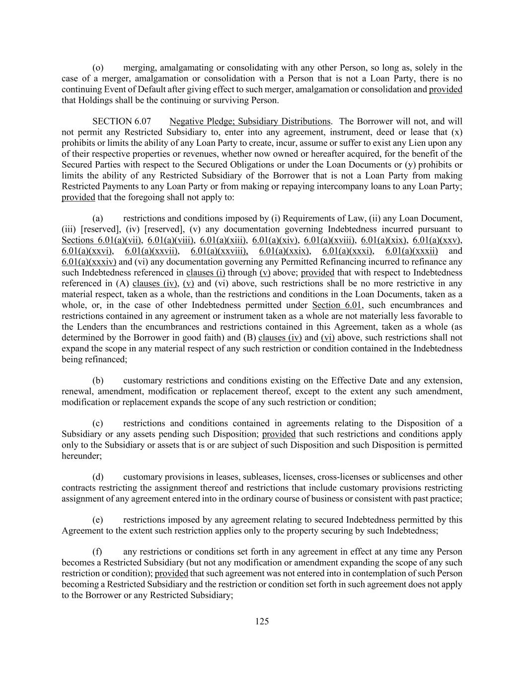 125 (o) merging, amalgamating or consolidating with any other Person, so long as, solely in the case of a merger, amalgamation or consolidation with a Person that is not a Loan Party, there is no continuing Event of Default after giving effect to such merger, amalgamation or consolidation and provided that Holdings shall be the continuing or surviving Person. SECTION 6.07 Negative Pledge; Subsidiary Distributions. The Borrower will not, and will not permit any Restricted Subsidiary to, enter into any agreement, instrument, deed or lease that (x) prohibits or limits the ability of any Loan Party to create, incur, assume or suffer to exist any Lien upon any of their respective properties or revenues, whether now owned or hereafter acquired, for the benefit of the Secured Parties with respect to the Secured Obligations or under the Loan Documents or (y) prohibits or limits the ability of any Restricted Subsidiary of the Borrower that is not a Loan Party from making Restricted Payments to any Loan Party or from making or repaying intercompany loans to any Loan Party; provided that the foregoing shall not apply to: (a) restrictions and conditions imposed by (i) Requirements of Law, (ii) any Loan Document, (iii) [reserved], (iv) [reserved], (v) any documentation governing Indebtedness incurred pursuant to Sections 6.01(a)(vii), 6.01(a)(viii), 6.01(a)(xiii), 6.01(a)(xiv), 6.01(a)(xviii), 6.01(a)(xix), 6.01(a)(xxv), 6.01(a)(xxvi), 6.01(a)(xxvii), 6.01(a)(xxviii), 6.01(a)(xxix), 6.01(a)(xxxi), 6.01(a)(xxxii) and 6.01(a)(xxxiv) and (vi) any documentation governing any Permitted Refinancing incurred to refinance any such Indebtedness referenced in clauses (i) through (v) above; provided that with respect to Indebtedness referenced in (A) clauses (iv), (v) and (vi) above, such restrictions shall be no more restrictive in any material respect, taken as a whole, than the restrictions and conditions in the Loan Documents, taken as a whole, or, in the case of other Indebtedness permitted under Section 6.01, such encumbrances and restrictions contained in any agreement or instrument taken as a whole are not materially less favorable to the Lenders than the encumbrances and restrictions contained in this Agreement, taken as a whole (as determined by the Borrower in good faith) and (B) clauses (iv) and (vi) above, such restrictions shall not expand the scope in any material respect of any such restriction or condition contained in the Indebtedness being refinanced; (b) customary restrictions and conditions existing on the Effective Date and any extension, renewal, amendment, modification or replacement thereof, except to the extent any such amendment, modification or replacement expands the scope of any such restriction or condition; (c) restrictions and conditions contained in agreements relating to the Disposition of a Subsidiary or any assets pending such Disposition; provided that such restrictions and conditions apply only to the Subsidiary or assets that is or are subject of such Disposition and such Disposition is permitted hereunder; (d) customary provisions in leases, subleases, licenses, cross-licenses or sublicenses and other contracts restricting the assignment thereof and restrictions that include customary provisions restricting assignment of any agreement entered into in the ordinary course of business or consistent with past practice; (e) restrictions imposed by any agreement relating to secured Indebtedness permitted by this Agreement to the extent such restriction applies only to the property securing by such Indebtedness; (f) any restrictions or conditions set forth in any agreement in effect at any time any Person becomes a Restricted Subsidiary (but not any modification or amendment expanding the scope of any such restriction or condition); provided that such agreement was not entered into in contemplation of such Person becoming a Restricted Subsidiary and the restriction or condition set forth in such agreement does not apply to the Borrower or any Restricted Subsidiary;