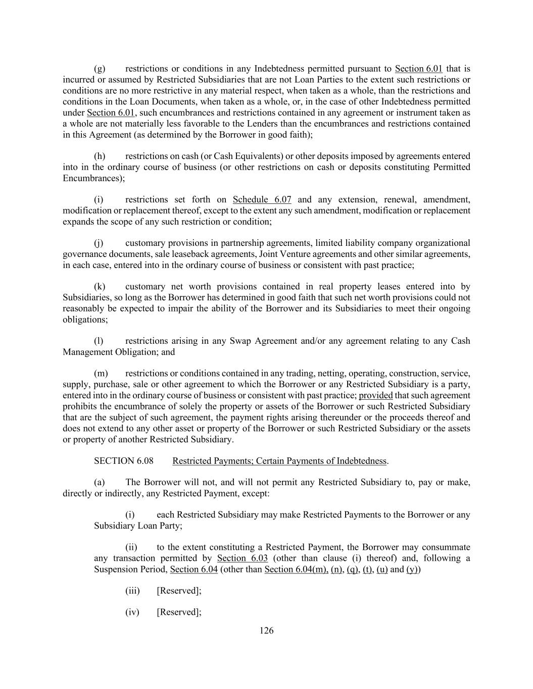 126 (g) restrictions or conditions in any Indebtedness permitted pursuant to Section 6.01 that is incurred or assumed by Restricted Subsidiaries that are not Loan Parties to the extent such restrictions or conditions are no more restrictive in any material respect, when taken as a whole, than the restrictions and conditions in the Loan Documents, when taken as a whole, or, in the case of other Indebtedness permitted under Section 6.01, such encumbrances and restrictions contained in any agreement or instrument taken as a whole are not materially less favorable to the Lenders than the encumbrances and restrictions contained in this Agreement (as determined by the Borrower in good faith); (h) restrictions on cash (or Cash Equivalents) or other deposits imposed by agreements entered into in the ordinary course of business (or other restrictions on cash or deposits constituting Permitted Encumbrances); (i) restrictions set forth on Schedule 6.07 and any extension, renewal, amendment, modification or replacement thereof, except to the extent any such amendment, modification or replacement expands the scope of any such restriction or condition; (j) customary provisions in partnership agreements, limited liability company organizational governance documents, sale leaseback agreements, Joint Venture agreements and other similar agreements, in each case, entered into in the ordinary course of business or consistent with past practice; (k) customary net worth provisions contained in real property leases entered into by Subsidiaries, so long as the Borrower has determined in good faith that such net worth provisions could not reasonably be expected to impair the ability of the Borrower and its Subsidiaries to meet their ongoing obligations; (l) restrictions arising in any Swap Agreement and/or any agreement relating to any Cash Management Obligation; and (m) restrictions or conditions contained in any trading, netting, operating, construction, service, supply, purchase, sale or other agreement to which the Borrower or any Restricted Subsidiary is a party, entered into in the ordinary course of business or consistent with past practice; provided that such agreement prohibits the encumbrance of solely the property or assets of the Borrower or such Restricted Subsidiary that are the subject of such agreement, the payment rights arising thereunder or the proceeds thereof and does not extend to any other asset or property of the Borrower or such Restricted Subsidiary or the assets or property of another Restricted Subsidiary. SECTION 6.08 Restricted Payments; Certain Payments of Indebtedness. (a) The Borrower will not, and will not permit any Restricted Subsidiary to, pay or make, directly or indirectly, any Restricted Payment, except: (i) each Restricted Subsidiary may make Restricted Payments to the Borrower or any Subsidiary Loan Party; (ii) to the extent constituting a Restricted Payment, the Borrower may consummate any transaction permitted by Section 6.03 (other than clause (i) thereof) and, following a Suspension Period, Section 6.04 (other than Section 6.04(m), (n), (q), (t), (u) and (y)) (iii) [Reserved]; (iv) [Reserved];