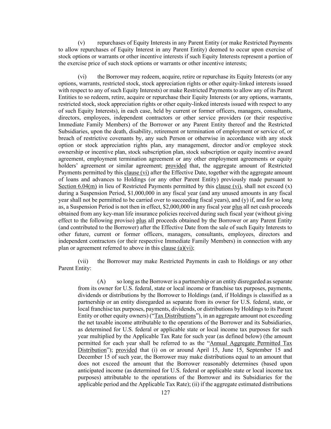 127 (v) repurchases of Equity Interests in any Parent Entity (or make Restricted Payments to allow repurchases of Equity Interest in any Parent Entity) deemed to occur upon exercise of stock options or warrants or other incentive interests if such Equity Interests represent a portion of the exercise price of such stock options or warrants or other incentive interests; (vi) the Borrower may redeem, acquire, retire or repurchase its Equity Interests (or any options, warrants, restricted stock, stock appreciation rights or other equity-linked interests issued with respect to any of such Equity Interests) or make Restricted Payments to allow any of its Parent Entities to so redeem, retire, acquire or repurchase their Equity Interests (or any options, warrants, restricted stock, stock appreciation rights or other equity-linked interests issued with respect to any of such Equity Interests), in each case, held by current or former officers, managers, consultants, directors, employees, independent contractors or other service providers (or their respective Immediate Family Members) of the Borrower or any Parent Entity thereof and the Restricted Subsidiaries, upon the death, disability, retirement or termination of employment or service of, or breach of restrictive covenants by, any such Person or otherwise in accordance with any stock option or stock appreciation rights plan, any management, director and/or employee stock ownership or incentive plan, stock subscription plan, stock subscription or equity incentive award agreement, employment termination agreement or any other employment agreements or equity holders’ agreement or similar agreement; provided that, the aggregate amount of Restricted Payments permitted by this clause (vi) after the Effective Date, together with the aggregate amount of loans and advances to Holdings (or any other Parent Entity) previously made pursuant to Section 6.04(m) in lieu of Restricted Payments permitted by this clause (vi), shall not exceed (x) during a Suspension Period, $1,000,000 in any fiscal year (and any unused amounts in any fiscal year shall not be permitted to be carried over to succeeding fiscal years), and (y) if, and for so long as, a Suspension Period is not then in effect, $2,000,000 in any fiscal year plus all net cash proceeds obtained from any key-man life insurance policies received during such fiscal year (without giving effect to the following proviso) plus all proceeds obtained by the Borrower or any Parent Entity (and contributed to the Borrower) after the Effective Date from the sale of such Equity Interests to other future, current or former officers, managers, consultants, employees, directors and independent contractors (or their respective Immediate Family Members) in connection with any plan or agreement referred to above in this clause (a)(vi); (vii) the Borrower may make Restricted Payments in cash to Holdings or any other Parent Entity: (A) so long as the Borrower is a partnership or an entity disregarded as separate from its owner for U.S. federal, state or local income or franchise tax purposes, payments, dividends or distributions by the Borrower to Holdings (and, if Holdings is classified as a partnership or an entity disregarded as separate from its owner for U.S. federal, state, or local franchise tax purposes, payments, dividends, or distributions by Holdings to its Parent Entity or other equity owners) (“Tax Distributions”), in an aggregate amount not exceeding the net taxable income attributable to the operations of the Borrower and its Subsidiaries, as determined for U.S. federal or applicable state or local income tax purposes for such year multiplied by the Applicable Tax Rate for such year (as defined below) (the amount permitted for each year shall be referred to as the “Annual Aggregate Permitted Tax Distribution”); provided that (i) on or around April 15, June 15, September 15 and December 15 of such year, the Borrower may make distributions equal to an amount that does not exceed the amount that the Borrower reasonably determines (based upon anticipated income (as determined for U.S. federal or applicable state or local income tax purposes) attributable to the operations of the Borrower and its Subsidiaries for the applicable period and the Applicable Tax Rate); (ii) if the aggregate estimated distributions