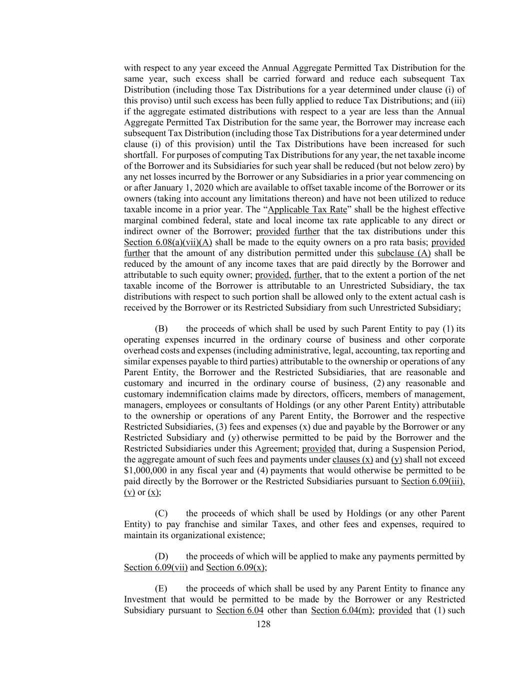 128 with respect to any year exceed the Annual Aggregate Permitted Tax Distribution for the same year, such excess shall be carried forward and reduce each subsequent Tax Distribution (including those Tax Distributions for a year determined under clause (i) of this proviso) until such excess has been fully applied to reduce Tax Distributions; and (iii) if the aggregate estimated distributions with respect to a year are less than the Annual Aggregate Permitted Tax Distribution for the same year, the Borrower may increase each subsequent Tax Distribution (including those Tax Distributions for a year determined under clause (i) of this provision) until the Tax Distributions have been increased for such shortfall. For purposes of computing Tax Distributions for any year, the net taxable income of the Borrower and its Subsidiaries for such year shall be reduced (but not below zero) by any net losses incurred by the Borrower or any Subsidiaries in a prior year commencing on or after January 1, 2020 which are available to offset taxable income of the Borrower or its owners (taking into account any limitations thereon) and have not been utilized to reduce taxable income in a prior year. The “Applicable Tax Rate” shall be the highest effective marginal combined federal, state and local income tax rate applicable to any direct or indirect owner of the Borrower; provided further that the tax distributions under this Section 6.08(a)(vii)(A) shall be made to the equity owners on a pro rata basis; provided further that the amount of any distribution permitted under this subclause (A) shall be reduced by the amount of any income taxes that are paid directly by the Borrower and attributable to such equity owner; provided, further, that to the extent a portion of the net taxable income of the Borrower is attributable to an Unrestricted Subsidiary, the tax distributions with respect to such portion shall be allowed only to the extent actual cash is received by the Borrower or its Restricted Subsidiary from such Unrestricted Subsidiary; (B) the proceeds of which shall be used by such Parent Entity to pay (1) its operating expenses incurred in the ordinary course of business and other corporate overhead costs and expenses (including administrative, legal, accounting, tax reporting and similar expenses payable to third parties) attributable to the ownership or operations of any Parent Entity, the Borrower and the Restricted Subsidiaries, that are reasonable and customary and incurred in the ordinary course of business, (2) any reasonable and customary indemnification claims made by directors, officers, members of management, managers, employees or consultants of Holdings (or any other Parent Entity) attributable to the ownership or operations of any Parent Entity, the Borrower and the respective Restricted Subsidiaries, (3) fees and expenses (x) due and payable by the Borrower or any Restricted Subsidiary and (y) otherwise permitted to be paid by the Borrower and the Restricted Subsidiaries under this Agreement; provided that, during a Suspension Period, the aggregate amount of such fees and payments under clauses (x) and (y) shall not exceed $1,000,000 in any fiscal year and (4) payments that would otherwise be permitted to be paid directly by the Borrower or the Restricted Subsidiaries pursuant to Section 6.09(iii), (v) or (x); (C) the proceeds of which shall be used by Holdings (or any other Parent Entity) to pay franchise and similar Taxes, and other fees and expenses, required to maintain its organizational existence; (D) the proceeds of which will be applied to make any payments permitted by Section 6.09(vii) and Section 6.09(x); (E) the proceeds of which shall be used by any Parent Entity to finance any Investment that would be permitted to be made by the Borrower or any Restricted Subsidiary pursuant to Section 6.04 other than Section 6.04(m); provided that (1) such