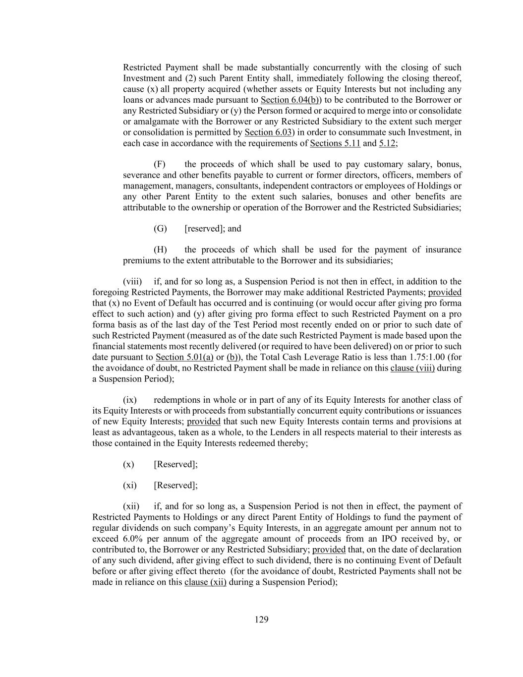 129 Restricted Payment shall be made substantially concurrently with the closing of such Investment and (2) such Parent Entity shall, immediately following the closing thereof, cause (x) all property acquired (whether assets or Equity Interests but not including any loans or advances made pursuant to Section 6.04(b)) to be contributed to the Borrower or any Restricted Subsidiary or (y) the Person formed or acquired to merge into or consolidate or amalgamate with the Borrower or any Restricted Subsidiary to the extent such merger or consolidation is permitted by Section 6.03) in order to consummate such Investment, in each case in accordance with the requirements of Sections 5.11 and 5.12; (F) the proceeds of which shall be used to pay customary salary, bonus, severance and other benefits payable to current or former directors, officers, members of management, managers, consultants, independent contractors or employees of Holdings or any other Parent Entity to the extent such salaries, bonuses and other benefits are attributable to the ownership or operation of the Borrower and the Restricted Subsidiaries; (G) [reserved]; and (H) the proceeds of which shall be used for the payment of insurance premiums to the extent attributable to the Borrower and its subsidiaries; (viii) if, and for so long as, a Suspension Period is not then in effect, in addition to the foregoing Restricted Payments, the Borrower may make additional Restricted Payments; provided that (x) no Event of Default has occurred and is continuing (or would occur after giving pro forma effect to such action) and (y) after giving pro forma effect to such Restricted Payment on a pro forma basis as of the last day of the Test Period most recently ended on or prior to such date of such Restricted Payment (measured as of the date such Restricted Payment is made based upon the financial statements most recently delivered (or required to have been delivered) on or prior to such date pursuant to Section 5.01(a) or (b)), the Total Cash Leverage Ratio is less than 1.75:1.00 (for the avoidance of doubt, no Restricted Payment shall be made in reliance on this clause (viii) during a Suspension Period); (ix) redemptions in whole or in part of any of its Equity Interests for another class of its Equity Interests or with proceeds from substantially concurrent equity contributions or issuances of new Equity Interests; provided that such new Equity Interests contain terms and provisions at least as advantageous, taken as a whole, to the Lenders in all respects material to their interests as those contained in the Equity Interests redeemed thereby; (x) [Reserved]; (xi) [Reserved]; (xii) if, and for so long as, a Suspension Period is not then in effect, the payment of Restricted Payments to Holdings or any direct Parent Entity of Holdings to fund the payment of regular dividends on such company’s Equity Interests, in an aggregate amount per annum not to exceed 6.0% per annum of the aggregate amount of proceeds from an IPO received by, or contributed to, the Borrower or any Restricted Subsidiary; provided that, on the date of declaration of any such dividend, after giving effect to such dividend, there is no continuing Event of Default before or after giving effect thereto (for the avoidance of doubt, Restricted Payments shall not be made in reliance on this clause (xii) during a Suspension Period);