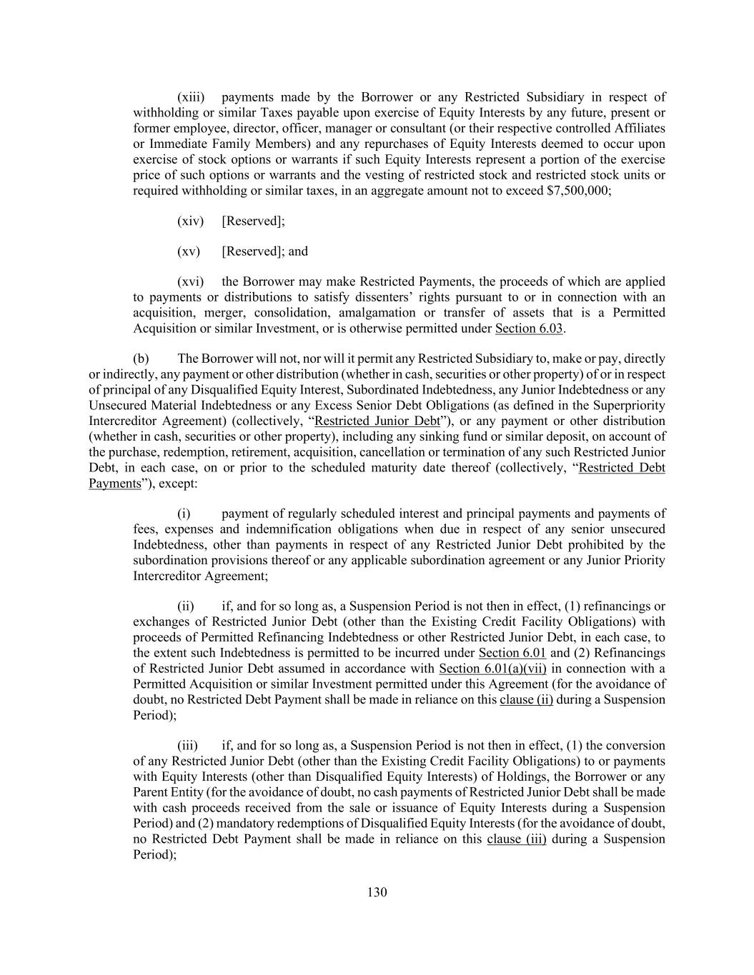 130 (xiii) payments made by the Borrower or any Restricted Subsidiary in respect of withholding or similar Taxes payable upon exercise of Equity Interests by any future, present or former employee, director, officer, manager or consultant (or their respective controlled Affiliates or Immediate Family Members) and any repurchases of Equity Interests deemed to occur upon exercise of stock options or warrants if such Equity Interests represent a portion of the exercise price of such options or warrants and the vesting of restricted stock and restricted stock units or required withholding or similar taxes, in an aggregate amount not to exceed $7,500,000; (xiv) [Reserved]; (xv) [Reserved]; and (xvi) the Borrower may make Restricted Payments, the proceeds of which are applied to payments or distributions to satisfy dissenters’ rights pursuant to or in connection with an acquisition, merger, consolidation, amalgamation or transfer of assets that is a Permitted Acquisition or similar Investment, or is otherwise permitted under Section 6.03. (b) The Borrower will not, nor will it permit any Restricted Subsidiary to, make or pay, directly or indirectly, any payment or other distribution (whether in cash, securities or other property) of or in respect of principal of any Disqualified Equity Interest, Subordinated Indebtedness, any Junior Indebtedness or any Unsecured Material Indebtedness or any Excess Senior Debt Obligations (as defined in the Superpriority Intercreditor Agreement) (collectively, “Restricted Junior Debt”), or any payment or other distribution (whether in cash, securities or other property), including any sinking fund or similar deposit, on account of the purchase, redemption, retirement, acquisition, cancellation or termination of any such Restricted Junior Debt, in each case, on or prior to the scheduled maturity date thereof (collectively, “Restricted Debt Payments”), except: (i) payment of regularly scheduled interest and principal payments and payments of fees, expenses and indemnification obligations when due in respect of any senior unsecured Indebtedness, other than payments in respect of any Restricted Junior Debt prohibited by the subordination provisions thereof or any applicable subordination agreement or any Junior Priority Intercreditor Agreement; (ii) if, and for so long as, a Suspension Period is not then in effect, (1) refinancings or exchanges of Restricted Junior Debt (other than the Existing Credit Facility Obligations) with proceeds of Permitted Refinancing Indebtedness or other Restricted Junior Debt, in each case, to the extent such Indebtedness is permitted to be incurred under Section 6.01 and (2) Refinancings of Restricted Junior Debt assumed in accordance with Section 6.01(a)(vii) in connection with a Permitted Acquisition or similar Investment permitted under this Agreement (for the avoidance of doubt, no Restricted Debt Payment shall be made in reliance on this clause (ii) during a Suspension Period); (iii) if, and for so long as, a Suspension Period is not then in effect, (1) the conversion of any Restricted Junior Debt (other than the Existing Credit Facility Obligations) to or payments with Equity Interests (other than Disqualified Equity Interests) of Holdings, the Borrower or any Parent Entity (for the avoidance of doubt, no cash payments of Restricted Junior Debt shall be made with cash proceeds received from the sale or issuance of Equity Interests during a Suspension Period) and (2) mandatory redemptions of Disqualified Equity Interests (for the avoidance of doubt, no Restricted Debt Payment shall be made in reliance on this clause (iii) during a Suspension Period);