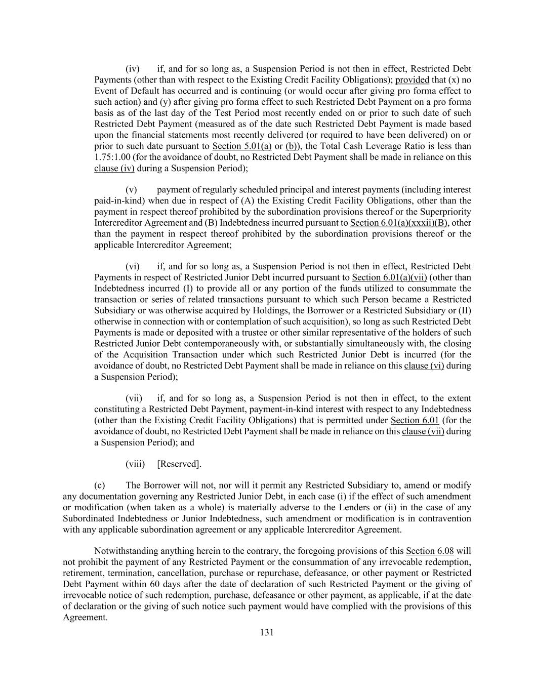 131 (iv) if, and for so long as, a Suspension Period is not then in effect, Restricted Debt Payments (other than with respect to the Existing Credit Facility Obligations); provided that (x) no Event of Default has occurred and is continuing (or would occur after giving pro forma effect to such action) and (y) after giving pro forma effect to such Restricted Debt Payment on a pro forma basis as of the last day of the Test Period most recently ended on or prior to such date of such Restricted Debt Payment (measured as of the date such Restricted Debt Payment is made based upon the financial statements most recently delivered (or required to have been delivered) on or prior to such date pursuant to Section 5.01(a) or (b)), the Total Cash Leverage Ratio is less than 1.75:1.00 (for the avoidance of doubt, no Restricted Debt Payment shall be made in reliance on this clause (iv) during a Suspension Period); (v) payment of regularly scheduled principal and interest payments (including interest paid-in-kind) when due in respect of (A) the Existing Credit Facility Obligations, other than the payment in respect thereof prohibited by the subordination provisions thereof or the Superpriority Intercreditor Agreement and (B) Indebtedness incurred pursuant to Section 6.01(a)(xxxii)(B), other than the payment in respect thereof prohibited by the subordination provisions thereof or the applicable Intercreditor Agreement; (vi) if, and for so long as, a Suspension Period is not then in effect, Restricted Debt Payments in respect of Restricted Junior Debt incurred pursuant to Section 6.01(a)(vii) (other than Indebtedness incurred (I) to provide all or any portion of the funds utilized to consummate the transaction or series of related transactions pursuant to which such Person became a Restricted Subsidiary or was otherwise acquired by Holdings, the Borrower or a Restricted Subsidiary or (II) otherwise in connection with or contemplation of such acquisition), so long as such Restricted Debt Payments is made or deposited with a trustee or other similar representative of the holders of such Restricted Junior Debt contemporaneously with, or substantially simultaneously with, the closing of the Acquisition Transaction under which such Restricted Junior Debt is incurred (for the avoidance of doubt, no Restricted Debt Payment shall be made in reliance on this clause (vi) during a Suspension Period); (vii) if, and for so long as, a Suspension Period is not then in effect, to the extent constituting a Restricted Debt Payment, payment-in-kind interest with respect to any Indebtedness (other than the Existing Credit Facility Obligations) that is permitted under Section 6.01 (for the avoidance of doubt, no Restricted Debt Payment shall be made in reliance on this clause (vii) during a Suspension Period); and (viii) [Reserved]. (c) The Borrower will not, nor will it permit any Restricted Subsidiary to, amend or modify any documentation governing any Restricted Junior Debt, in each case (i) if the effect of such amendment or modification (when taken as a whole) is materially adverse to the Lenders or (ii) in the case of any Subordinated Indebtedness or Junior Indebtedness, such amendment or modification is in contravention with any applicable subordination agreement or any applicable Intercreditor Agreement. Notwithstanding anything herein to the contrary, the foregoing provisions of this Section 6.08 will not prohibit the payment of any Restricted Payment or the consummation of any irrevocable redemption, retirement, termination, cancellation, purchase or repurchase, defeasance, or other payment or Restricted Debt Payment within 60 days after the date of declaration of such Restricted Payment or the giving of irrevocable notice of such redemption, purchase, defeasance or other payment, as applicable, if at the date of declaration or the giving of such notice such payment would have complied with the provisions of this Agreement.