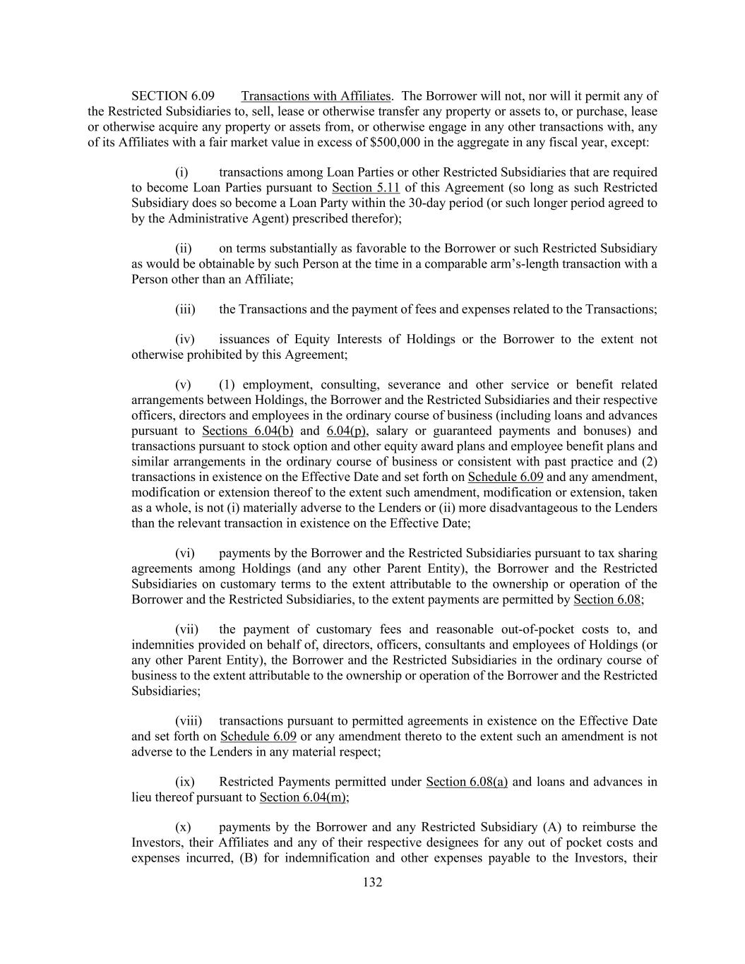 132 SECTION 6.09 Transactions with Affiliates. The Borrower will not, nor will it permit any of the Restricted Subsidiaries to, sell, lease or otherwise transfer any property or assets to, or purchase, lease or otherwise acquire any property or assets from, or otherwise engage in any other transactions with, any of its Affiliates with a fair market value in excess of $500,000 in the aggregate in any fiscal year, except: (i) transactions among Loan Parties or other Restricted Subsidiaries that are required to become Loan Parties pursuant to Section 5.11 of this Agreement (so long as such Restricted Subsidiary does so become a Loan Party within the 30-day period (or such longer period agreed to by the Administrative Agent) prescribed therefor); (ii) on terms substantially as favorable to the Borrower or such Restricted Subsidiary as would be obtainable by such Person at the time in a comparable arm’s-length transaction with a Person other than an Affiliate; (iii) the Transactions and the payment of fees and expenses related to the Transactions; (iv) issuances of Equity Interests of Holdings or the Borrower to the extent not otherwise prohibited by this Agreement; (v) (1) employment, consulting, severance and other service or benefit related arrangements between Holdings, the Borrower and the Restricted Subsidiaries and their respective officers, directors and employees in the ordinary course of business (including loans and advances pursuant to Sections 6.04(b) and 6.04(p), salary or guaranteed payments and bonuses) and transactions pursuant to stock option and other equity award plans and employee benefit plans and similar arrangements in the ordinary course of business or consistent with past practice and (2) transactions in existence on the Effective Date and set forth on Schedule 6.09 and any amendment, modification or extension thereof to the extent such amendment, modification or extension, taken as a whole, is not (i) materially adverse to the Lenders or (ii) more disadvantageous to the Lenders than the relevant transaction in existence on the Effective Date; (vi) payments by the Borrower and the Restricted Subsidiaries pursuant to tax sharing agreements among Holdings (and any other Parent Entity), the Borrower and the Restricted Subsidiaries on customary terms to the extent attributable to the ownership or operation of the Borrower and the Restricted Subsidiaries, to the extent payments are permitted by Section 6.08; (vii) the payment of customary fees and reasonable out-of-pocket costs to, and indemnities provided on behalf of, directors, officers, consultants and employees of Holdings (or any other Parent Entity), the Borrower and the Restricted Subsidiaries in the ordinary course of business to the extent attributable to the ownership or operation of the Borrower and the Restricted Subsidiaries; (viii) transactions pursuant to permitted agreements in existence on the Effective Date and set forth on Schedule 6.09 or any amendment thereto to the extent such an amendment is not adverse to the Lenders in any material respect; (ix) Restricted Payments permitted under Section 6.08(a) and loans and advances in lieu thereof pursuant to Section 6.04(m); (x) payments by the Borrower and any Restricted Subsidiary (A) to reimburse the Investors, their Affiliates and any of their respective designees for any out of pocket costs and expenses incurred, (B) for indemnification and other expenses payable to the Investors, their