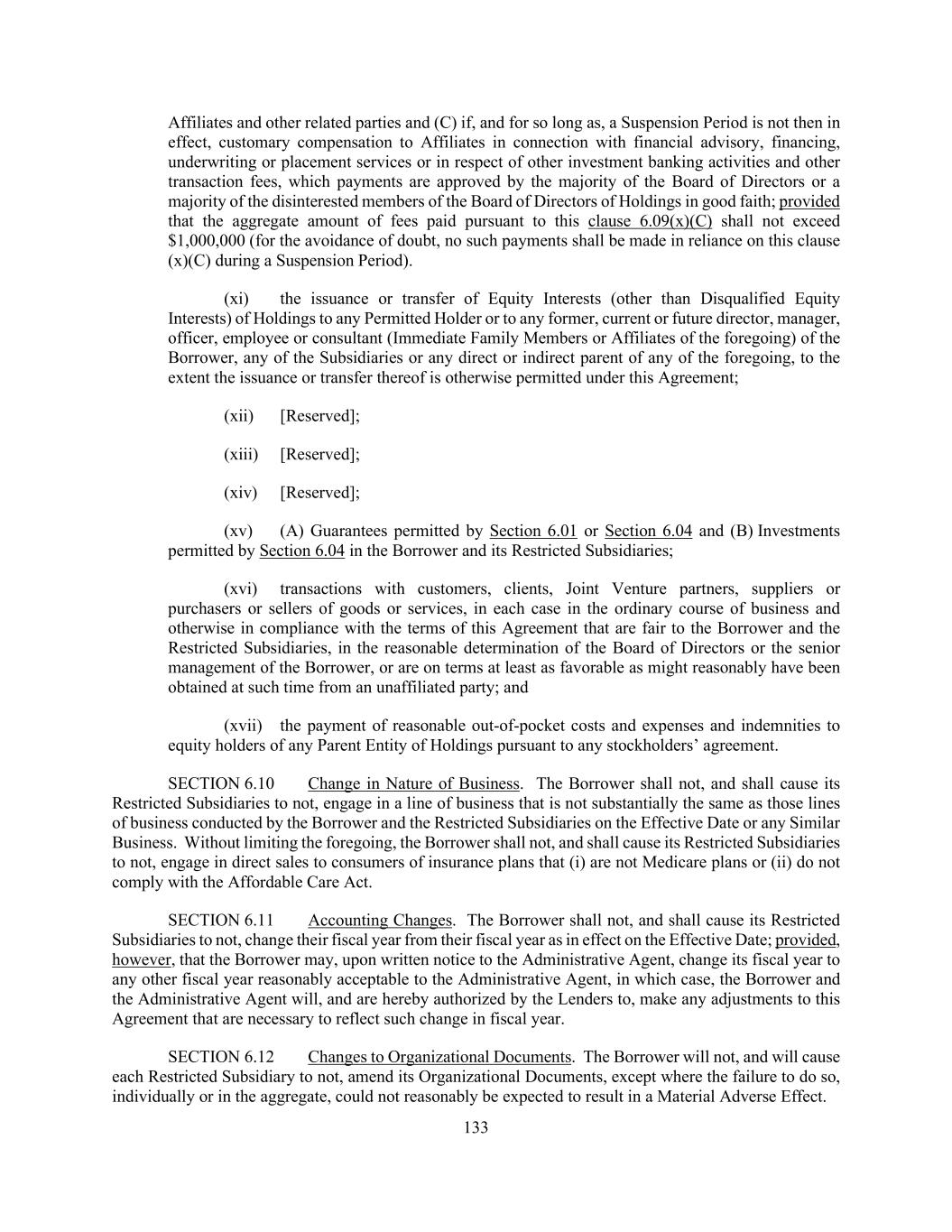 133 Affiliates and other related parties and (C) if, and for so long as, a Suspension Period is not then in effect, customary compensation to Affiliates in connection with financial advisory, financing, underwriting or placement services or in respect of other investment banking activities and other transaction fees, which payments are approved by the majority of the Board of Directors or a majority of the disinterested members of the Board of Directors of Holdings in good faith; provided that the aggregate amount of fees paid pursuant to this clause 6.09(x)(C) shall not exceed $1,000,000 (for the avoidance of doubt, no such payments shall be made in reliance on this clause (x)(C) during a Suspension Period). (xi) the issuance or transfer of Equity Interests (other than Disqualified Equity Interests) of Holdings to any Permitted Holder or to any former, current or future director, manager, officer, employee or consultant (Immediate Family Members or Affiliates of the foregoing) of the Borrower, any of the Subsidiaries or any direct or indirect parent of any of the foregoing, to the extent the issuance or transfer thereof is otherwise permitted under this Agreement; (xii) [Reserved]; (xiii) [Reserved]; (xiv) [Reserved]; (xv) (A) Guarantees permitted by Section 6.01 or Section 6.04 and (B) Investments permitted by Section 6.04 in the Borrower and its Restricted Subsidiaries; (xvi) transactions with customers, clients, Joint Venture partners, suppliers or purchasers or sellers of goods or services, in each case in the ordinary course of business and otherwise in compliance with the terms of this Agreement that are fair to the Borrower and the Restricted Subsidiaries, in the reasonable determination of the Board of Directors or the senior management of the Borrower, or are on terms at least as favorable as might reasonably have been obtained at such time from an unaffiliated party; and (xvii) the payment of reasonable out-of-pocket costs and expenses and indemnities to equity holders of any Parent Entity of Holdings pursuant to any stockholders’ agreement. SECTION 6.10 Change in Nature of Business. The Borrower shall not, and shall cause its Restricted Subsidiaries to not, engage in a line of business that is not substantially the same as those lines of business conducted by the Borrower and the Restricted Subsidiaries on the Effective Date or any Similar Business. Without limiting the foregoing, the Borrower shall not, and shall cause its Restricted Subsidiaries to not, engage in direct sales to consumers of insurance plans that (i) are not Medicare plans or (ii) do not comply with the Affordable Care Act. SECTION 6.11 Accounting Changes. The Borrower shall not, and shall cause its Restricted Subsidiaries to not, change their fiscal year from their fiscal year as in effect on the Effective Date; provided, however, that the Borrower may, upon written notice to the Administrative Agent, change its fiscal year to any other fiscal year reasonably acceptable to the Administrative Agent, in which case, the Borrower and the Administrative Agent will, and are hereby authorized by the Lenders to, make any adjustments to this Agreement that are necessary to reflect such change in fiscal year. SECTION 6.12 Changes to Organizational Documents. The Borrower will not, and will cause each Restricted Subsidiary to not, amend its Organizational Documents, except where the failure to do so, individually or in the aggregate, could not reasonably be expected to result in a Material Adverse Effect.