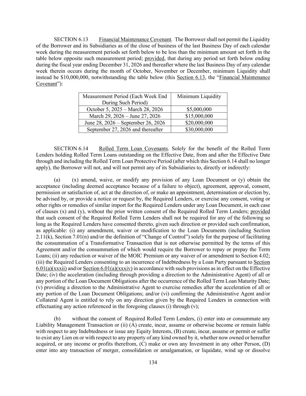 134 SECTION 6.13 Financial Maintenance Covenant. The Borrower shall not permit the Liquidity of the Borrower and its Subsidiaries as of the close of business of the last Business Day of each calendar week during the measurement periods set forth below to be less than the minimum amount set forth in the table below opposite such measurement period; provided, that during any period set forth below ending during the fiscal year ending December 31, 2026 and thereafter where the last Business Day of any calendar week therein occurs during the month of October, November or December, minimum Liquidity shall instead be $10,000,000, notwithstanding the table below (this Section 6.13, the “Financial Maintenance Covenant”): Measurement Period (Each Week End During Such Period) Minimum Liquidity October 5, 2025 – March 28, 2026 $5,000,000 March 29, 2026 – June 27, 2026 $15,000,000 June 28, 2026 – September 26, 2026 $20,000,000 September 27, 2026 and thereafter $30,000,000 SECTION 6.14 Rolled Term Loan Covenants. Solely for the benefit of the Rolled Term Lenders holding Rolled Term Loans outstanding on the Effective Date, from and after the Effective Date through and including the Rolled Term Loan Protective Period (after which this Section 6.14 shall no longer apply), the Borrower will not, and will not permit any of its Subsidiaries to, directly or indirectly: (a) (x) amend, waive, or modify any provision of any Loan Document or (y) obtain the acceptance (including deemed acceptance because of a failure to object), agreement, approval, consent, permission or satisfaction of, act at the direction of, or make an appointment, determination or election by, be advised by, or provide a notice or request by, the Required Lenders, or exercise any consent, voting or other rights or remedies of similar import for the Required Lenders under any Loan Document, in each case of clauses (x) and (y), without the prior written consent of the Required Rolled Term Lenders; provided that such consent of the Required Rolled Term Lenders shall not be required for any of the following so long as the Required Lenders have consented thereto, given such direction or provided such confirmation, as applicable: (i) any amendment, waiver or modification to the Loan Documents (including Section 2.11(k), Section 7.01(n) and/or the definition of “Change of Control”) solely for the purpose of facilitating the consummation of a Transformative Transaction that is not otherwise permitted by the terms of this Agreement and/or the consummation of which would require the Borrower to repay or prepay the Term Loans; (ii) any reduction or waiver of the MOIC Premium or any waiver of or amendment to Section 4.02; (iii) the Required Lenders consenting to an incurrence of Indebtedness by a Loan Party pursuant to Section 6.01(a)(xxxii) and/or Section 6.01(a)(xxxiv) in accordance with such provisions as in effect on the Effective Date; (iv) the acceleration (including through providing a direction to the Administrative Agent) of all or any portion of the Loan Document Obligations after the occurrence of the Rolled Term Loan Maturity Date; (v) providing a direction to the Administrative Agent to exercise remedies after the acceleration of all or any portion of the Loan Document Obligations; and/or (vi) confirming the Administrative Agent and/or Collateral Agent is entitled to rely on any direction given by the Required Lenders in connection with effectuating any action referenced in the foregoing clauses (i) through (v); (b) without the consent of Required Rolled Term Lenders, (i) enter into or consummate any Liability Management Transaction or (ii) (A) create, incur, assume or otherwise become or remain liable with respect to any Indebtedness or issue any Equity Interests, (B) create, incur, assume or permit or suffer to exist any Lien on or with respect to any property of any kind owned by it, whether now owned or hereafter acquired, or any income or profits therefrom, (C) make or own any Investment in any other Person, (D) enter into any transaction of merger, consolidation or amalgamation, or liquidate, wind up or dissolve