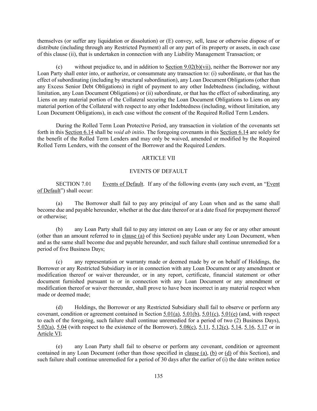 135 themselves (or suffer any liquidation or dissolution) or (E) convey, sell, lease or otherwise dispose of or distribute (including through any Restricted Payment) all or any part of its property or assets, in each case of this clause (ii), that is undertaken in connection with any Liability Management Transaction; or (c) without prejudice to, and in addition to Section 9.02(b)(vii), neither the Borrower nor any Loan Party shall enter into, or authorize, or consummate any transaction to: (i) subordinate, or that has the effect of subordinating (including by structural subordination), any Loan Document Obligations (other than any Excess Senior Debt Obligations) in right of payment to any other Indebtedness (including, without limitation, any Loan Document Obligations) or (ii) subordinate, or that has the effect of subordinating, any Liens on any material portion of the Collateral securing the Loan Document Obligations to Liens on any material portion of the Collateral with respect to any other Indebtedness (including, without limitation, any Loan Document Obligations), in each case without the consent of the Required Rolled Term Lenders. During the Rolled Term Loan Protective Period, any transaction in violation of the covenants set forth in this Section 6.14 shall be void ab initio. The foregoing covenants in this Section 6.14 are solely for the benefit of the Rolled Term Lenders and may only be waived, amended or modified by the Required Rolled Term Lenders, with the consent of the Borrower and the Required Lenders. ARTICLE VII EVENTS OF DEFAULT SECTION 7.01 Events of Default. If any of the following events (any such event, an “Event of Default”) shall occur: (a) The Borrower shall fail to pay any principal of any Loan when and as the same shall become due and payable hereunder, whether at the due date thereof or at a date fixed for prepayment thereof or otherwise; (b) any Loan Party shall fail to pay any interest on any Loan or any fee or any other amount (other than an amount referred to in clause (a) of this Section) payable under any Loan Document, when and as the same shall become due and payable hereunder, and such failure shall continue unremedied for a period of five Business Days; (c) any representation or warranty made or deemed made by or on behalf of Holdings, the Borrower or any Restricted Subsidiary in or in connection with any Loan Document or any amendment or modification thereof or waiver thereunder, or in any report, certificate, financial statement or other document furnished pursuant to or in connection with any Loan Document or any amendment or modification thereof or waiver thereunder, shall prove to have been incorrect in any material respect when made or deemed made; (d) Holdings, the Borrower or any Restricted Subsidiary shall fail to observe or perform any covenant, condition or agreement contained in Section 5.01(a), 5.01(b), 5.01(c), 5.01(e) (and, with respect to each of the foregoing, such failure shall continue unremedied for a period of two (2) Business Days), 5.02(a), 5.04 (with respect to the existence of the Borrower), 5.08(c), 5.11, 5.12(c), 5.14, 5.16, 5.17 or in Article VI; (e) any Loan Party shall fail to observe or perform any covenant, condition or agreement contained in any Loan Document (other than those specified in clause (a), (b) or (d) of this Section), and such failure shall continue unremedied for a period of 30 days after the earlier of (i) the date written notice