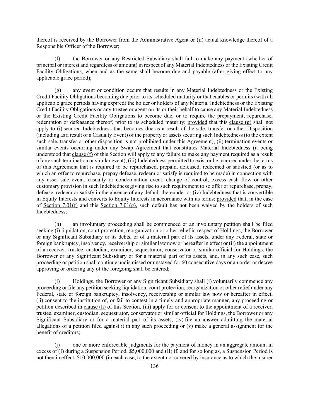 136 thereof is received by the Borrower from the Administrative Agent or (ii) actual knowledge thereof of a Responsible Officer of the Borrower; (f) the Borrower or any Restricted Subsidiary shall fail to make any payment (whether of principal or interest and regardless of amount) in respect of any Material Indebtedness or the Existing Credit Facility Obligations, when and as the same shall become due and payable (after giving effect to any applicable grace period); (g) any event or condition occurs that results in any Material Indebtedness or the Existing Credit Facility Obligations becoming due prior to its scheduled maturity or that enables or permits (with all applicable grace periods having expired) the holder or holders of any Material Indebtedness or the Existing Credit Facility Obligations or any trustee or agent on its or their behalf to cause any Material Indebtedness or the Existing Credit Facility Obligations to become due, or to require the prepayment, repurchase, redemption or defeasance thereof, prior to its scheduled maturity; provided that this clause (g) shall not apply to (i) secured Indebtedness that becomes due as a result of the sale, transfer or other Disposition (including as a result of a Casualty Event) of the property or assets securing such Indebtedness (to the extent such sale, transfer or other disposition is not prohibited under this Agreement), (ii) termination events or similar events occurring under any Swap Agreement that constitutes Material Indebtedness (it being understood that clause (f) of this Section will apply to any failure to make any payment required as a result of any such termination or similar event), (iii) Indebtedness permitted to exist or be incurred under the terms of this Agreement that is required to be repurchased, prepaid, defeased, redeemed or satisfied (or as to which an offer to repurchase, prepay defease, redeem or satisfy is required to be made) in connection with any asset sale event, casualty or condemnation event, change of control, excess cash flow or other customary provision in such Indebtedness giving rise to such requirement to so offer or repurchase, prepay, defease, redeem or satisfy in the absence of any default thereunder or (iv) Indebtedness that is convertible in Equity Interests and converts to Equity Interests in accordance with its terms; provided that, in the case of Section 7.01(f) and this Section 7.01(g), such default has not been waived by the holders of such Indebtedness; (h) an involuntary proceeding shall be commenced or an involuntary petition shall be filed seeking (i) liquidation, court protection, reorganization or other relief in respect of Holdings, the Borrower or any Significant Subsidiary or its debts, or of a material part of its assets, under any Federal, state or foreign bankruptcy, insolvency, receivership or similar law now or hereafter in effect or (ii) the appointment of a receiver, trustee, custodian, examiner, sequestrator, conservator or similar official for Holdings, the Borrower or any Significant Subsidiary or for a material part of its assets, and, in any such case, such proceeding or petition shall continue undismissed or unstayed for 60 consecutive days or an order or decree approving or ordering any of the foregoing shall be entered; (i) Holdings, the Borrower or any Significant Subsidiary shall (i) voluntarily commence any proceeding or file any petition seeking liquidation, court protection, reorganization or other relief under any Federal, state or foreign bankruptcy, insolvency, receivership or similar law now or hereafter in effect, (ii) consent to the institution of, or fail to contest in a timely and appropriate manner, any proceeding or petition described in clause (h) of this Section, (iii) apply for or consent to the appointment of a receiver, trustee, examiner, custodian, sequestrator, conservator or similar official for Holdings, the Borrower or any Significant Subsidiary or for a material part of its assets, (iv) file an answer admitting the material allegations of a petition filed against it in any such proceeding or (v) make a general assignment for the benefit of creditors; (j) one or more enforceable judgments for the payment of money in an aggregate amount in excess of (I) during a Suspension Period, $5,000,000 and (II) if, and for so long as, a Suspension Period is not then in effect, $10,000,000 (in each case, to the extent not covered by insurance as to which the insurer