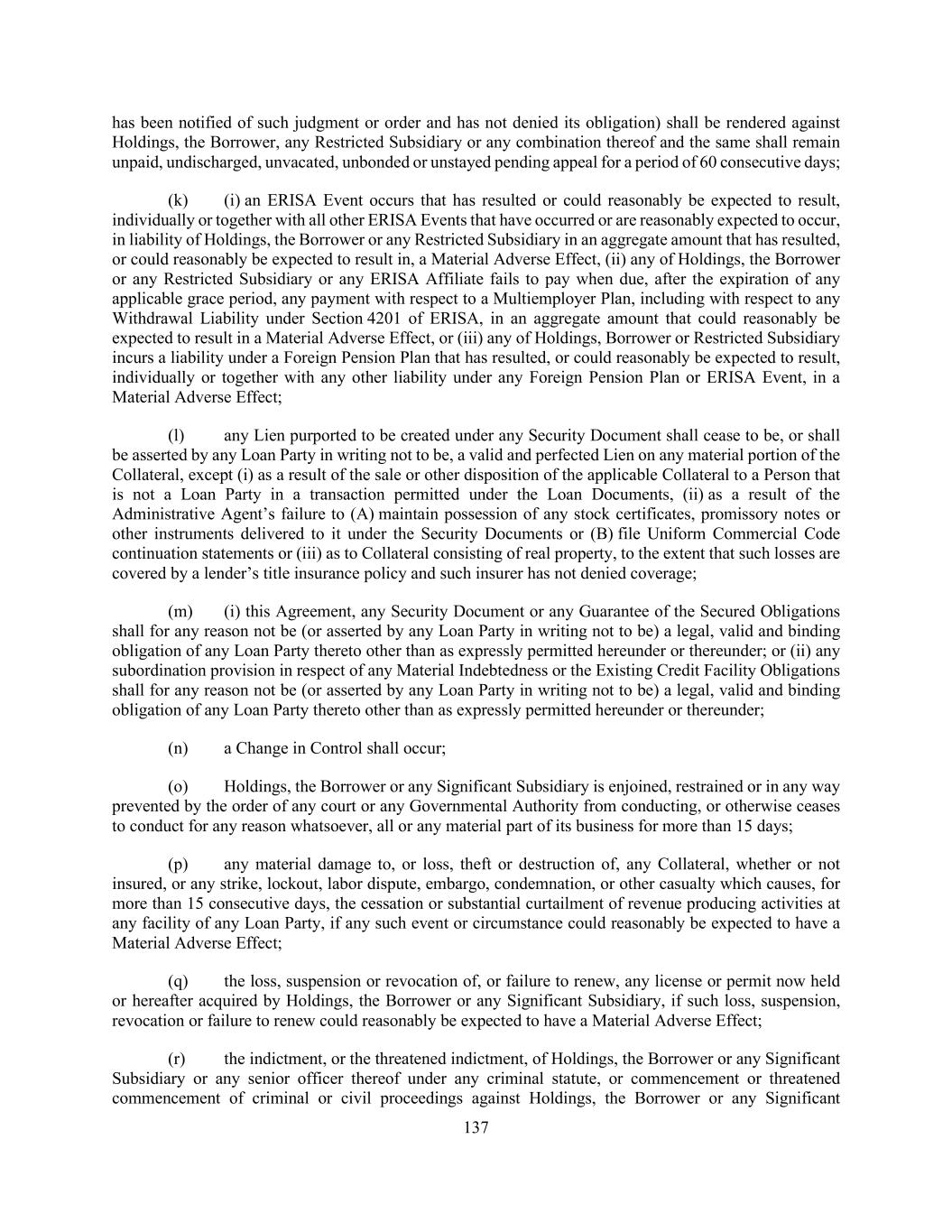 137 has been notified of such judgment or order and has not denied its obligation) shall be rendered against Holdings, the Borrower, any Restricted Subsidiary or any combination thereof and the same shall remain unpaid, undischarged, unvacated, unbonded or unstayed pending appeal for a period of 60 consecutive days; (k) (i) an ERISA Event occurs that has resulted or could reasonably be expected to result, individually or together with all other ERISA Events that have occurred or are reasonably expected to occur, in liability of Holdings, the Borrower or any Restricted Subsidiary in an aggregate amount that has resulted, or could reasonably be expected to result in, a Material Adverse Effect, (ii) any of Holdings, the Borrower or any Restricted Subsidiary or any ERISA Affiliate fails to pay when due, after the expiration of any applicable grace period, any payment with respect to a Multiemployer Plan, including with respect to any Withdrawal Liability under Section 4201 of ERISA, in an aggregate amount that could reasonably be expected to result in a Material Adverse Effect, or (iii) any of Holdings, Borrower or Restricted Subsidiary incurs a liability under a Foreign Pension Plan that has resulted, or could reasonably be expected to result, individually or together with any other liability under any Foreign Pension Plan or ERISA Event, in a Material Adverse Effect; (l) any Lien purported to be created under any Security Document shall cease to be, or shall be asserted by any Loan Party in writing not to be, a valid and perfected Lien on any material portion of the Collateral, except (i) as a result of the sale or other disposition of the applicable Collateral to a Person that is not a Loan Party in a transaction permitted under the Loan Documents, (ii) as a result of the Administrative Agent’s failure to (A) maintain possession of any stock certificates, promissory notes or other instruments delivered to it under the Security Documents or (B) file Uniform Commercial Code continuation statements or (iii) as to Collateral consisting of real property, to the extent that such losses are covered by a lender’s title insurance policy and such insurer has not denied coverage; (m) (i) this Agreement, any Security Document or any Guarantee of the Secured Obligations shall for any reason not be (or asserted by any Loan Party in writing not to be) a legal, valid and binding obligation of any Loan Party thereto other than as expressly permitted hereunder or thereunder; or (ii) any subordination provision in respect of any Material Indebtedness or the Existing Credit Facility Obligations shall for any reason not be (or asserted by any Loan Party in writing not to be) a legal, valid and binding obligation of any Loan Party thereto other than as expressly permitted hereunder or thereunder; (n) a Change in Control shall occur; (o) Holdings, the Borrower or any Significant Subsidiary is enjoined, restrained or in any way prevented by the order of any court or any Governmental Authority from conducting, or otherwise ceases to conduct for any reason whatsoever, all or any material part of its business for more than 15 days; (p) any material damage to, or loss, theft or destruction of, any Collateral, whether or not insured, or any strike, lockout, labor dispute, embargo, condemnation, or other casualty which causes, for more than 15 consecutive days, the cessation or substantial curtailment of revenue producing activities at any facility of any Loan Party, if any such event or circumstance could reasonably be expected to have a Material Adverse Effect; (q) the loss, suspension or revocation of, or failure to renew, any license or permit now held or hereafter acquired by Holdings, the Borrower or any Significant Subsidiary, if such loss, suspension, revocation or failure to renew could reasonably be expected to have a Material Adverse Effect; (r) the indictment, or the threatened indictment, of Holdings, the Borrower or any Significant Subsidiary or any senior officer thereof under any criminal statute, or commencement or threatened commencement of criminal or civil proceedings against Holdings, the Borrower or any Significant