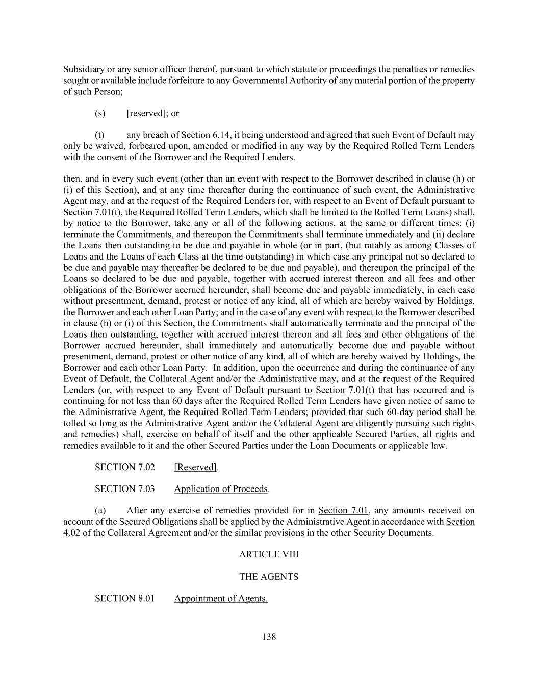138 Subsidiary or any senior officer thereof, pursuant to which statute or proceedings the penalties or remedies sought or available include forfeiture to any Governmental Authority of any material portion of the property of such Person; (s) [reserved]; or (t) any breach of Section 6.14, it being understood and agreed that such Event of Default may only be waived, forbeared upon, amended or modified in any way by the Required Rolled Term Lenders with the consent of the Borrower and the Required Lenders. then, and in every such event (other than an event with respect to the Borrower described in clause (h) or (i) of this Section), and at any time thereafter during the continuance of such event, the Administrative Agent may, and at the request of the Required Lenders (or, with respect to an Event of Default pursuant to Section 7.01(t), the Required Rolled Term Lenders, which shall be limited to the Rolled Term Loans) shall, by notice to the Borrower, take any or all of the following actions, at the same or different times: (i) terminate the Commitments, and thereupon the Commitments shall terminate immediately and (ii) declare the Loans then outstanding to be due and payable in whole (or in part, (but ratably as among Classes of Loans and the Loans of each Class at the time outstanding) in which case any principal not so declared to be due and payable may thereafter be declared to be due and payable), and thereupon the principal of the Loans so declared to be due and payable, together with accrued interest thereon and all fees and other obligations of the Borrower accrued hereunder, shall become due and payable immediately, in each case without presentment, demand, protest or notice of any kind, all of which are hereby waived by Holdings, the Borrower and each other Loan Party; and in the case of any event with respect to the Borrower described in clause (h) or (i) of this Section, the Commitments shall automatically terminate and the principal of the Loans then outstanding, together with accrued interest thereon and all fees and other obligations of the Borrower accrued hereunder, shall immediately and automatically become due and payable without presentment, demand, protest or other notice of any kind, all of which are hereby waived by Holdings, the Borrower and each other Loan Party. In addition, upon the occurrence and during the continuance of any Event of Default, the Collateral Agent and/or the Administrative may, and at the request of the Required Lenders (or, with respect to any Event of Default pursuant to Section 7.01(t) that has occurred and is continuing for not less than 60 days after the Required Rolled Term Lenders have given notice of same to the Administrative Agent, the Required Rolled Term Lenders; provided that such 60-day period shall be tolled so long as the Administrative Agent and/or the Collateral Agent are diligently pursuing such rights and remedies) shall, exercise on behalf of itself and the other applicable Secured Parties, all rights and remedies available to it and the other Secured Parties under the Loan Documents or applicable law. SECTION 7.02 [Reserved]. SECTION 7.03 Application of Proceeds. (a) After any exercise of remedies provided for in Section 7.01, any amounts received on account of the Secured Obligations shall be applied by the Administrative Agent in accordance with Section 4.02 of the Collateral Agreement and/or the similar provisions in the other Security Documents. ARTICLE VIII THE AGENTS SECTION 8.01 Appointment of Agents.