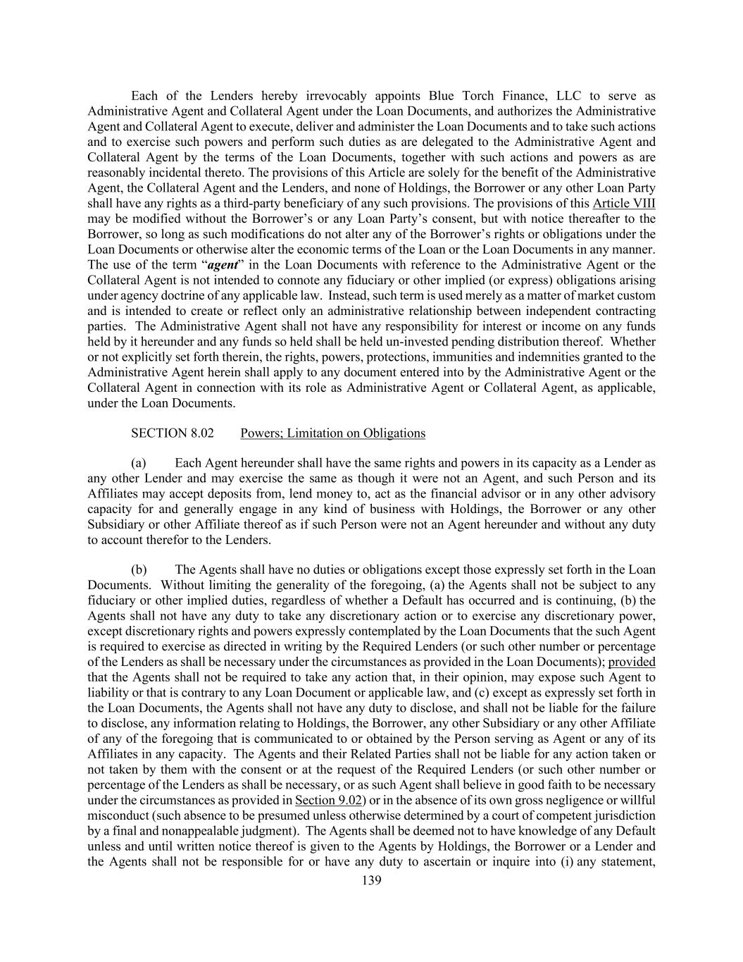 139 Each of the Lenders hereby irrevocably appoints Blue Torch Finance, LLC to serve as Administrative Agent and Collateral Agent under the Loan Documents, and authorizes the Administrative Agent and Collateral Agent to execute, deliver and administer the Loan Documents and to take such actions and to exercise such powers and perform such duties as are delegated to the Administrative Agent and Collateral Agent by the terms of the Loan Documents, together with such actions and powers as are reasonably incidental thereto. The provisions of this Article are solely for the benefit of the Administrative Agent, the Collateral Agent and the Lenders, and none of Holdings, the Borrower or any other Loan Party shall have any rights as a third-party beneficiary of any such provisions. The provisions of this Article VIII may be modified without the Borrower’s or any Loan Party’s consent, but with notice thereafter to the Borrower, so long as such modifications do not alter any of the Borrower’s rights or obligations under the Loan Documents or otherwise alter the economic terms of the Loan or the Loan Documents in any manner. The use of the term “agent” in the Loan Documents with reference to the Administrative Agent or the Collateral Agent is not intended to connote any fiduciary or other implied (or express) obligations arising under agency doctrine of any applicable law. Instead, such term is used merely as a matter of market custom and is intended to create or reflect only an administrative relationship between independent contracting parties. The Administrative Agent shall not have any responsibility for interest or income on any funds held by it hereunder and any funds so held shall be held un-invested pending distribution thereof. Whether or not explicitly set forth therein, the rights, powers, protections, immunities and indemnities granted to the Administrative Agent herein shall apply to any document entered into by the Administrative Agent or the Collateral Agent in connection with its role as Administrative Agent or Collateral Agent, as applicable, under the Loan Documents. SECTION 8.02 Powers; Limitation on Obligations (a) Each Agent hereunder shall have the same rights and powers in its capacity as a Lender as any other Lender and may exercise the same as though it were not an Agent, and such Person and its Affiliates may accept deposits from, lend money to, act as the financial advisor or in any other advisory capacity for and generally engage in any kind of business with Holdings, the Borrower or any other Subsidiary or other Affiliate thereof as if such Person were not an Agent hereunder and without any duty to account therefor to the Lenders. (b) The Agents shall have no duties or obligations except those expressly set forth in the Loan Documents. Without limiting the generality of the foregoing, (a) the Agents shall not be subject to any fiduciary or other implied duties, regardless of whether a Default has occurred and is continuing, (b) the Agents shall not have any duty to take any discretionary action or to exercise any discretionary power, except discretionary rights and powers expressly contemplated by the Loan Documents that the such Agent is required to exercise as directed in writing by the Required Lenders (or such other number or percentage of the Lenders as shall be necessary under the circumstances as provided in the Loan Documents); provided that the Agents shall not be required to take any action that, in their opinion, may expose such Agent to liability or that is contrary to any Loan Document or applicable law, and (c) except as expressly set forth in the Loan Documents, the Agents shall not have any duty to disclose, and shall not be liable for the failure to disclose, any information relating to Holdings, the Borrower, any other Subsidiary or any other Affiliate of any of the foregoing that is communicated to or obtained by the Person serving as Agent or any of its Affiliates in any capacity. The Agents and their Related Parties shall not be liable for any action taken or not taken by them with the consent or at the request of the Required Lenders (or such other number or percentage of the Lenders as shall be necessary, or as such Agent shall believe in good faith to be necessary under the circumstances as provided in Section 9.02) or in the absence of its own gross negligence or willful misconduct (such absence to be presumed unless otherwise determined by a court of competent jurisdiction by a final and nonappealable judgment). The Agents shall be deemed not to have knowledge of any Default unless and until written notice thereof is given to the Agents by Holdings, the Borrower or a Lender and the Agents shall not be responsible for or have any duty to ascertain or inquire into (i) any statement,